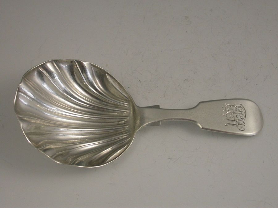 An unusual Victorian Provincial silver Caddy Spoon with large circular fluted bowl, the plain fiddle pattern handle engraved with contemporary initials EEW.
