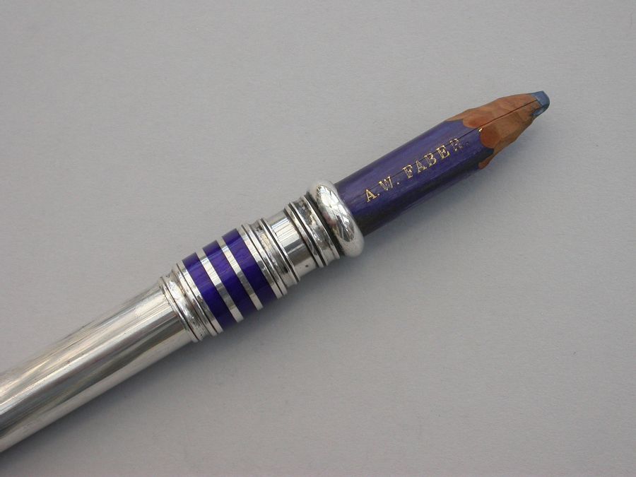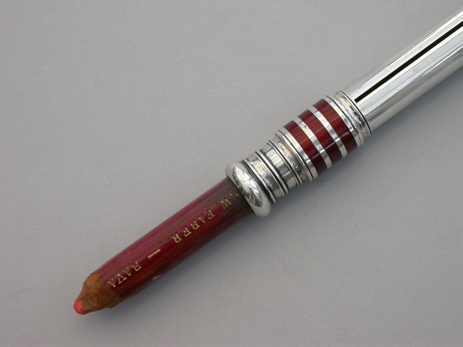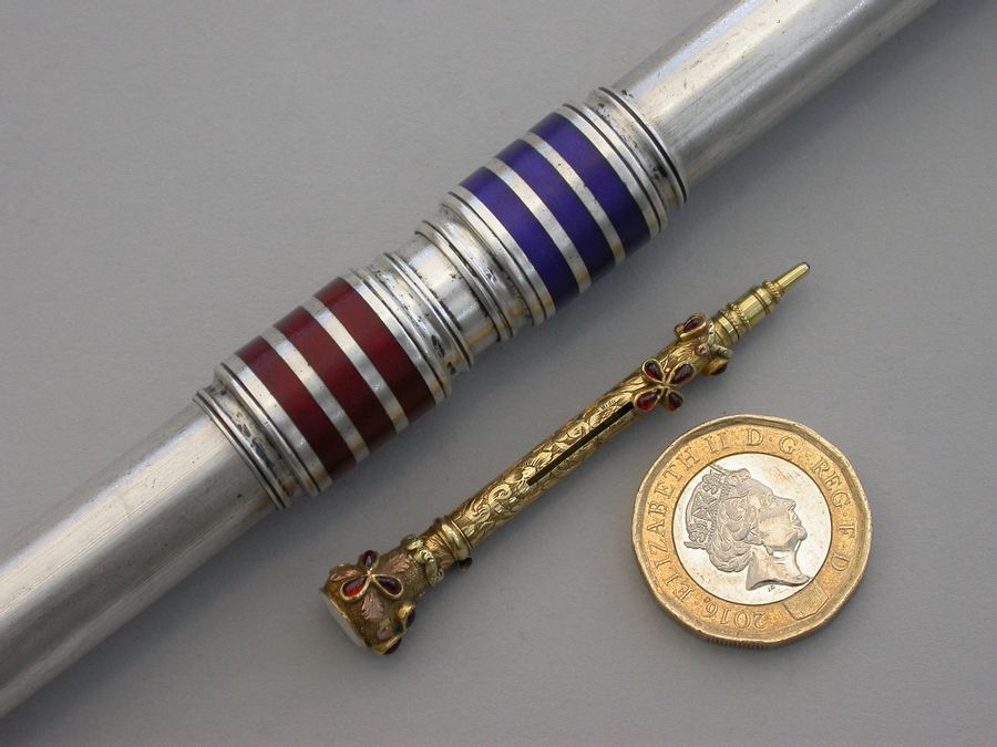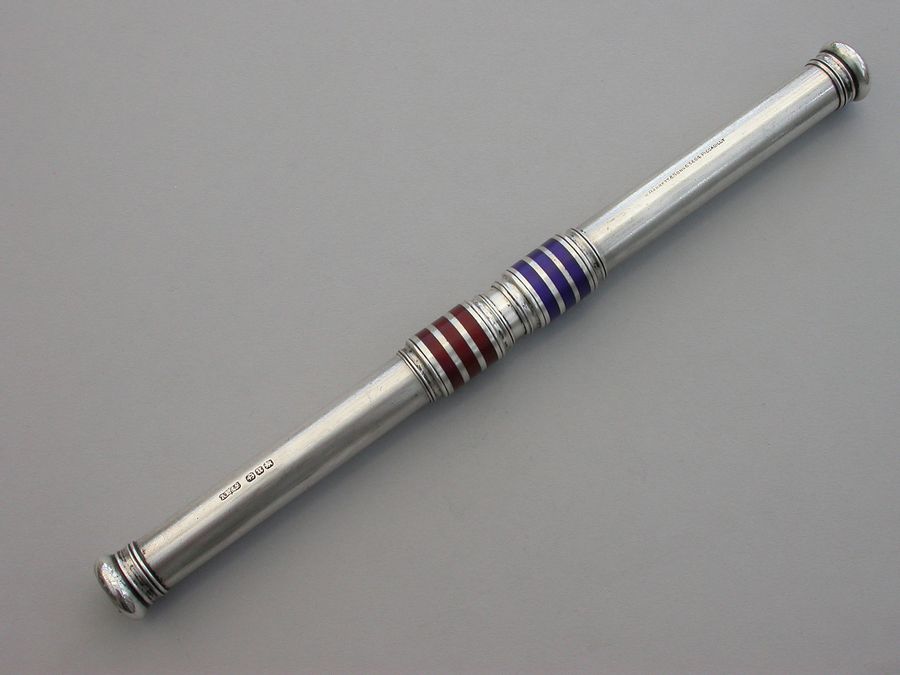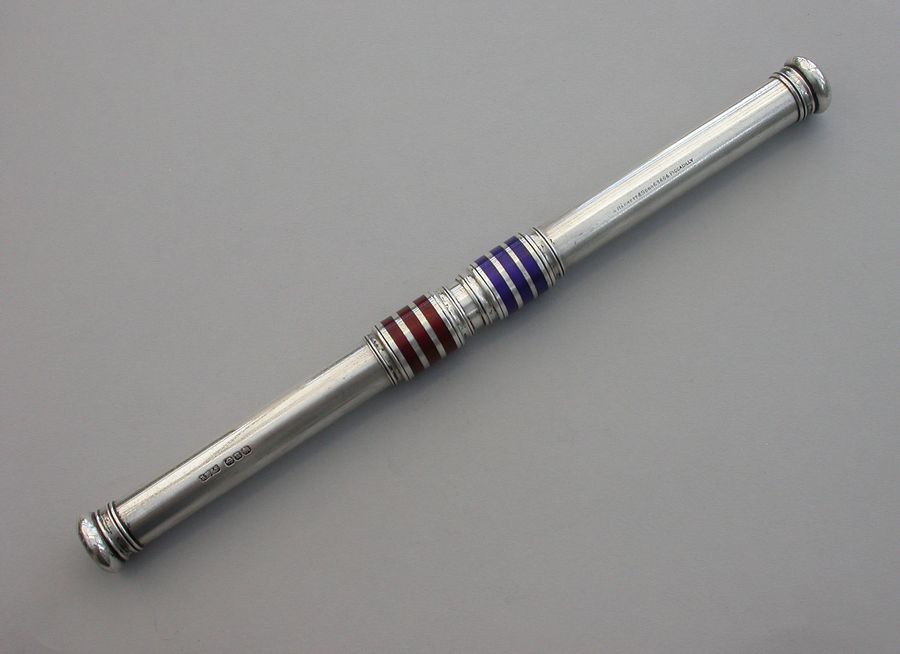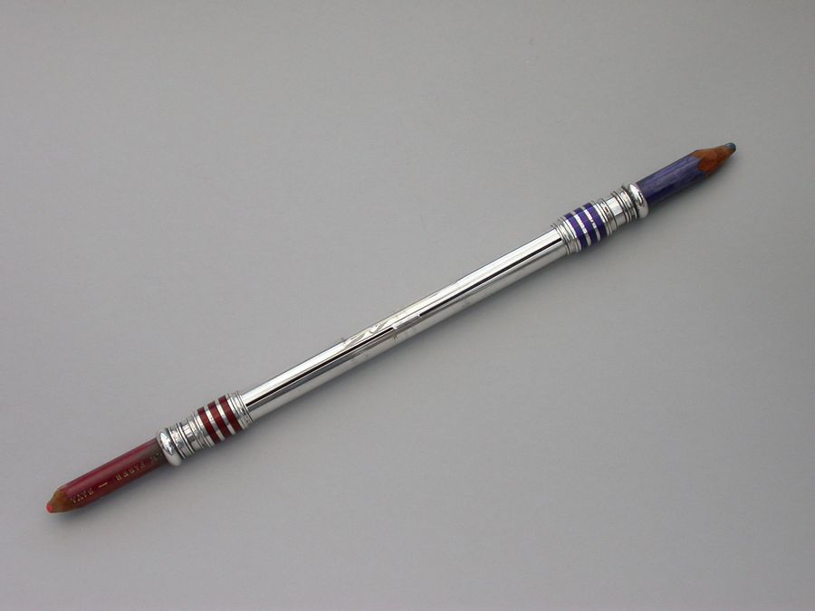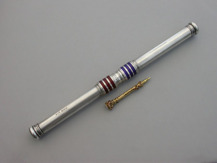 An unusual and fine quality large Victorian silver and enamel Oversize double-ended Editing Pencil, the two slider rings to extend the pencils set with triple bands of red and blue enamel. Complete with two original A.W.Faber marker pencils in red and blue.