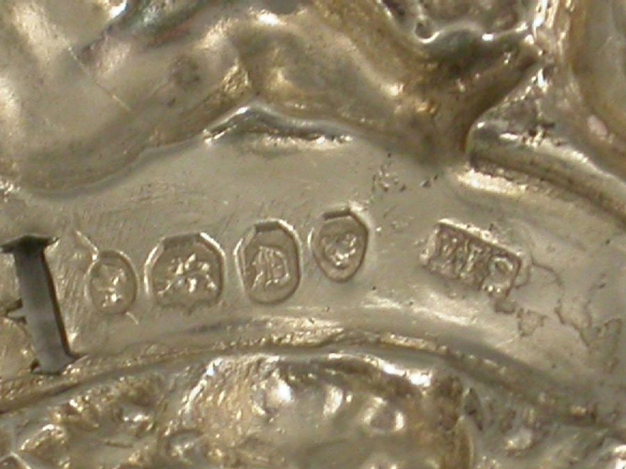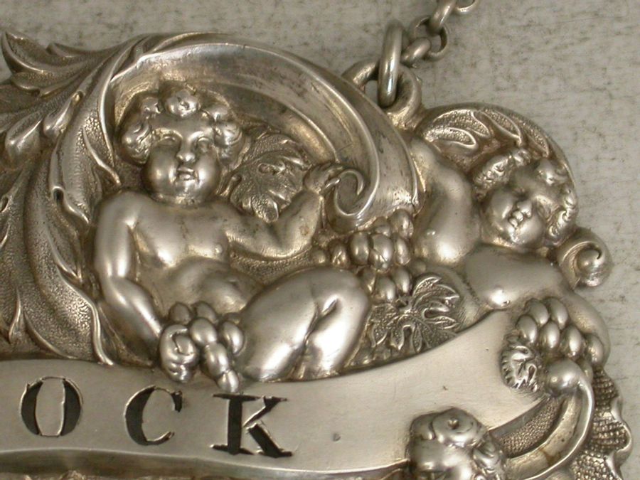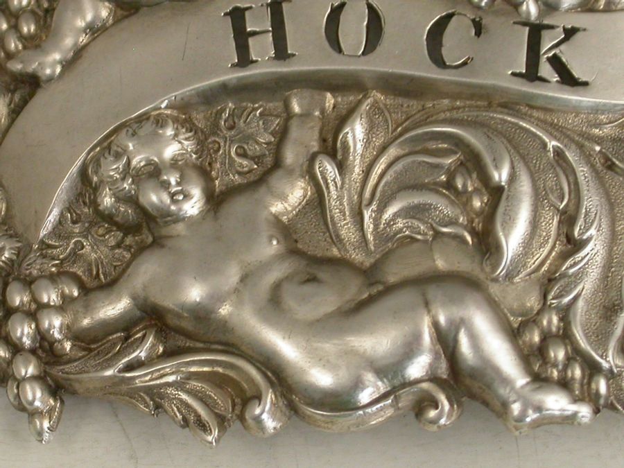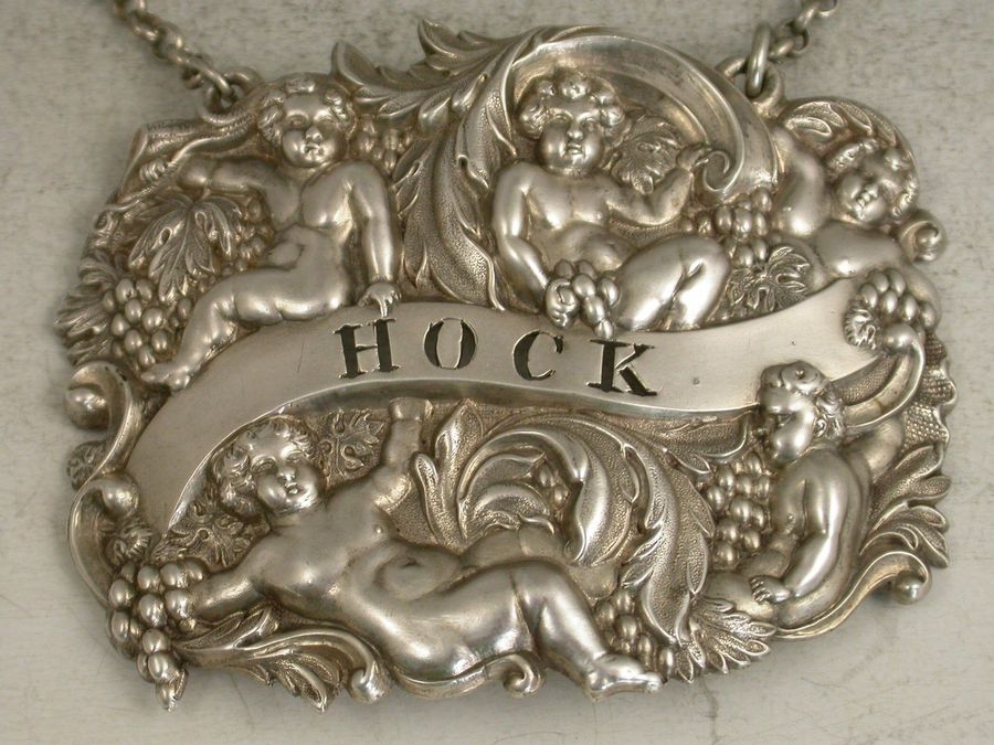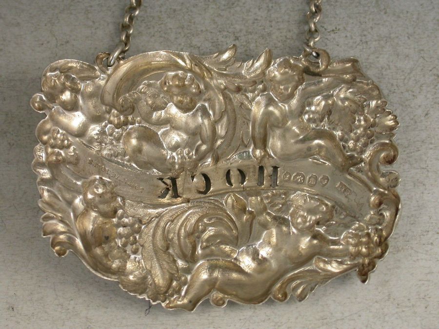 A large Victorian die-stamped silver Wine Label of 'Bacchic Reveller' form, depicting five naked putti amongst scrolls, leaves and fruiting vines, three above and two below the scrolled name plate pierced for Hock.