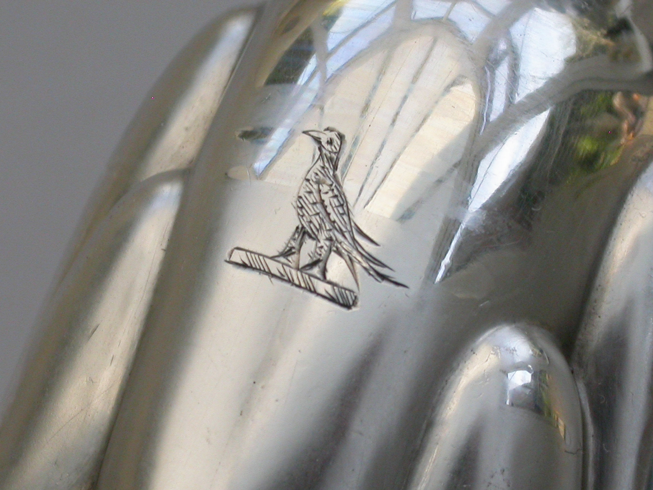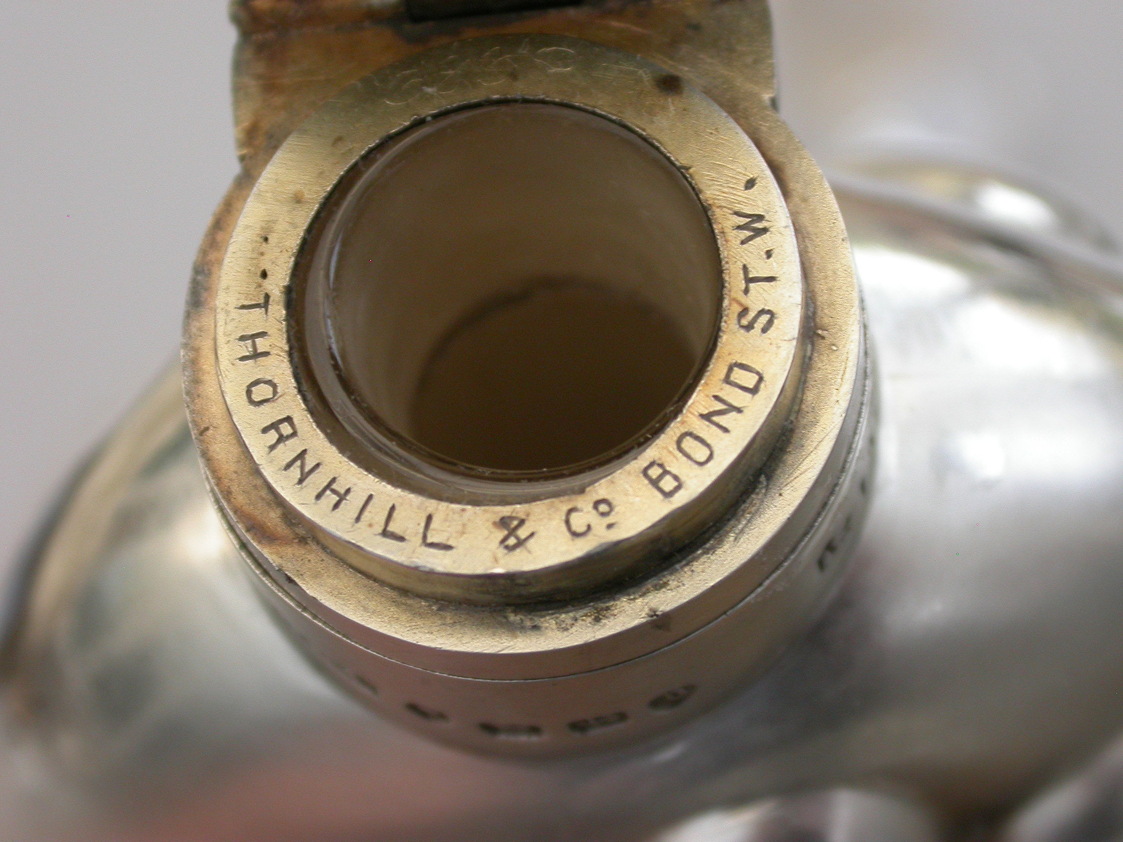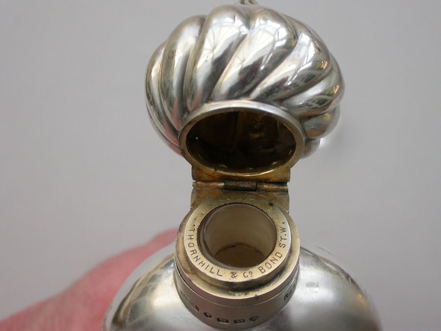 A superb very large and heavy Victorian Scent Flask of fluted cornucopia form. Engraved with the crest of a bird and marked with both a full set of hallmarks and a design registration number Rd. 130648. Additionally this piece is engraved around the neck with the London retailer's name 'Thornhill and Co. Bond Street W.'