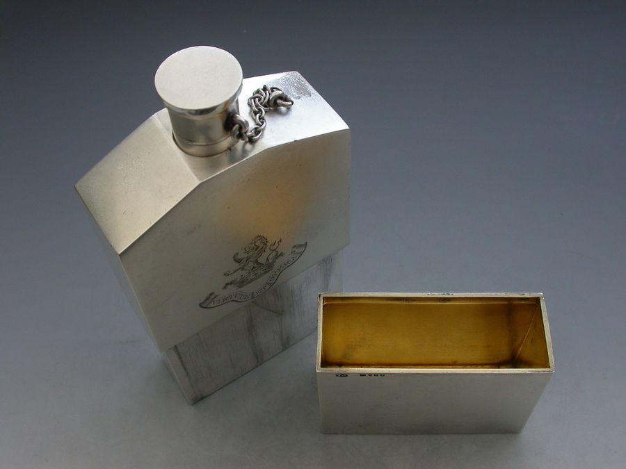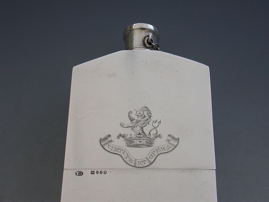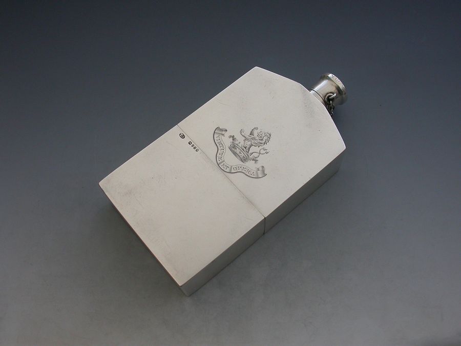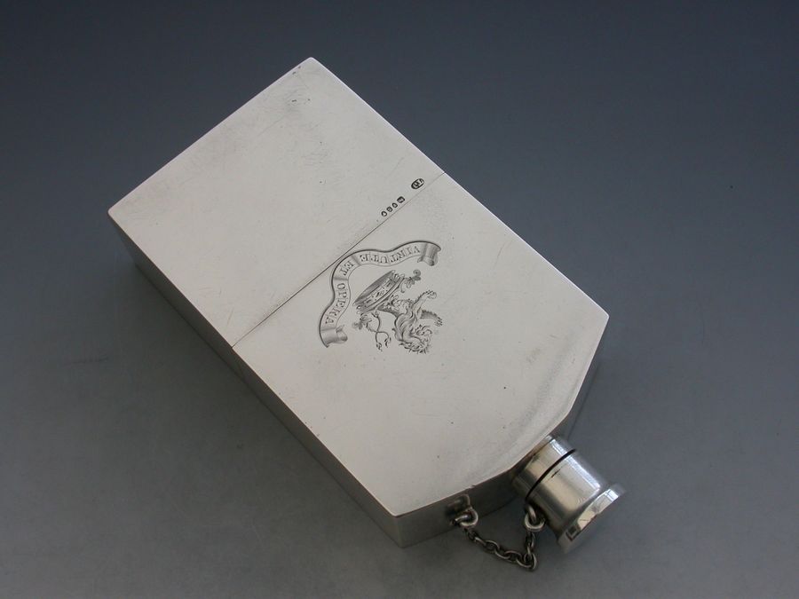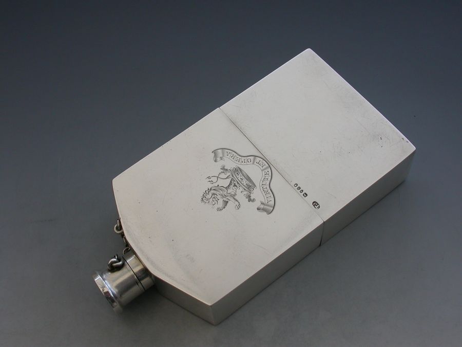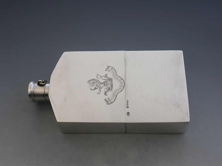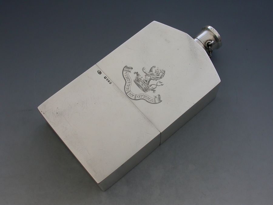 A large and fine quality Victorian silver Spirit Flask of plain rectangular form with slopping shoulders, the screw-off lid with bayonet fixing, the detachable cup with silver gilt lining. The body engraved with a crest (out of a ducal coronet a demi-lion rampant double-queued) and motto.