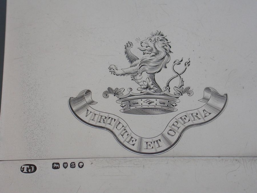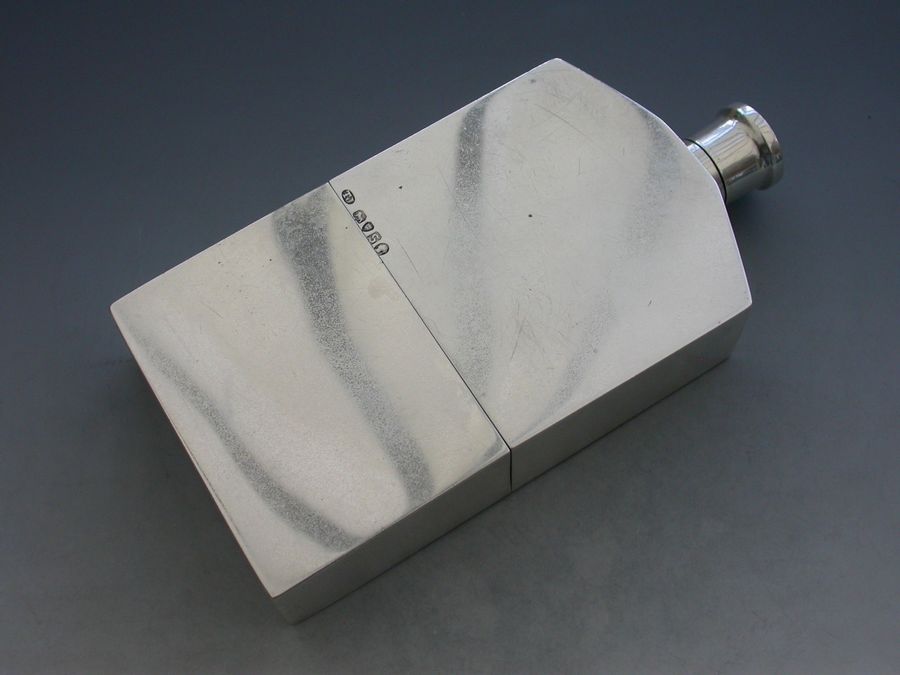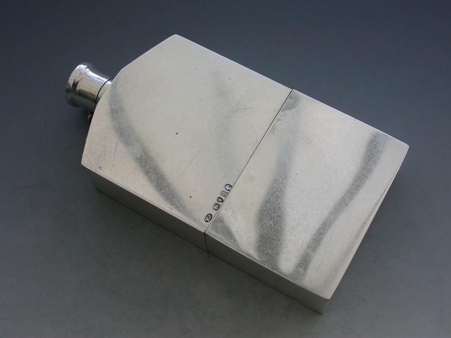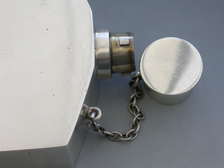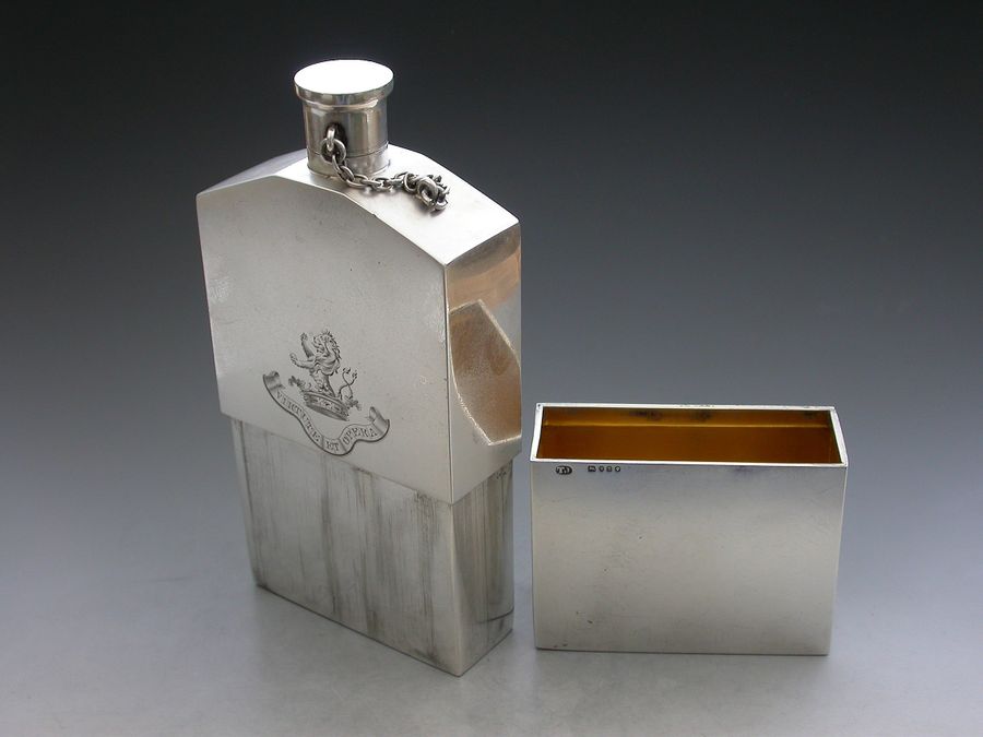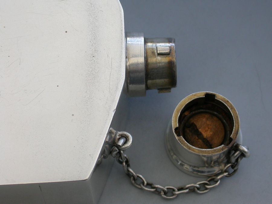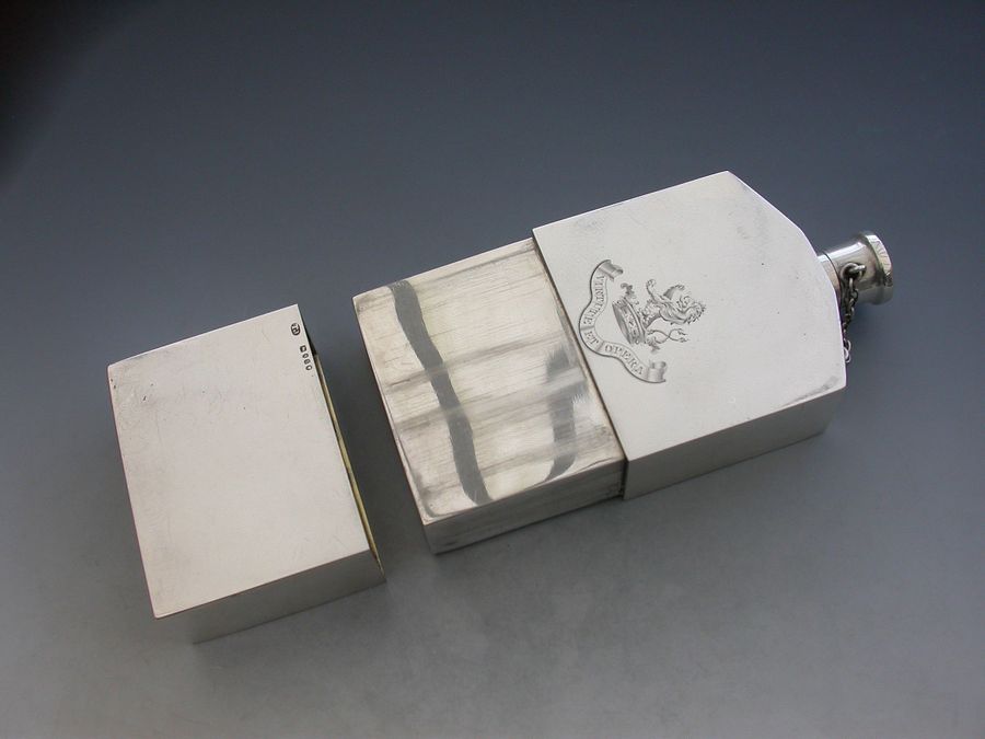 A large and fine quality Victorian silver Spirit Flask of plain rectangular form with slopping shoulders, the screw-off lid with bayonet fixing, the detachable cup with silver gilt lining. The body engraved with a crest (out of a ducal coronet a demi-lion rampant double-queued) and motto.