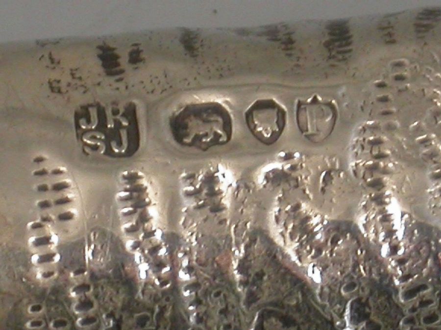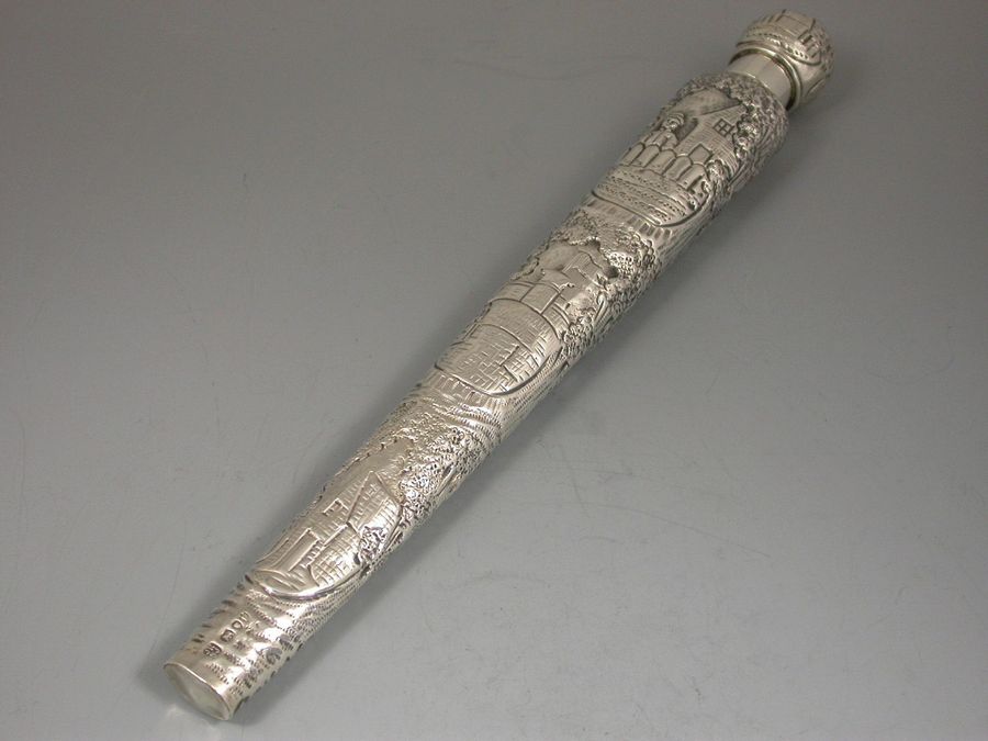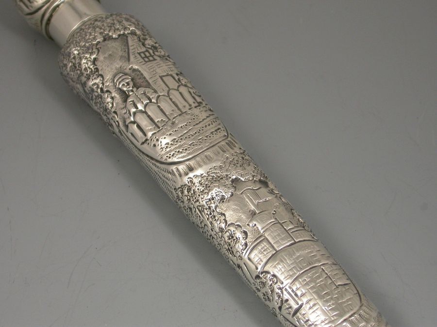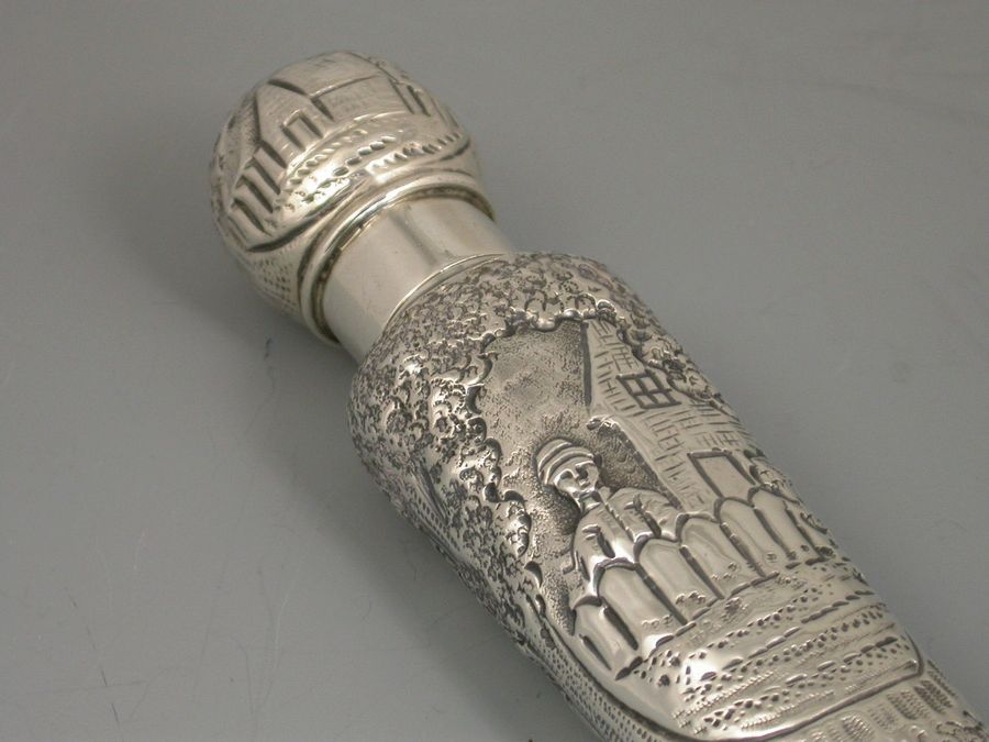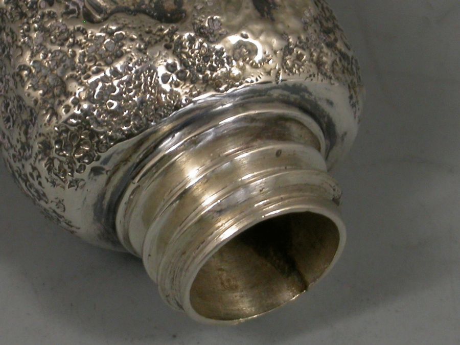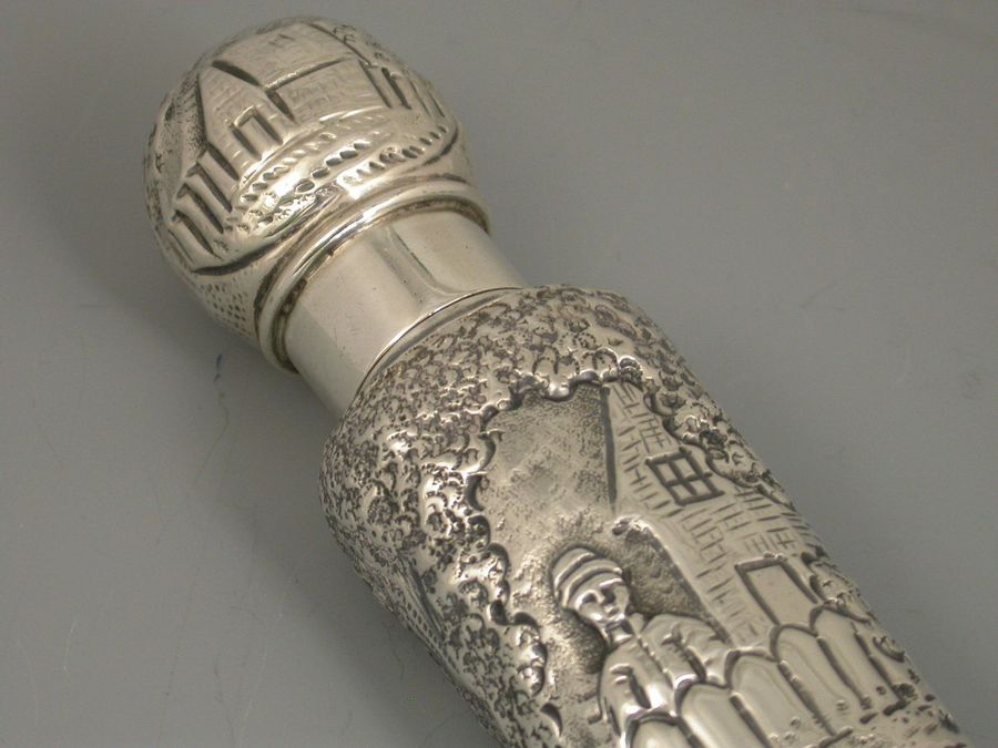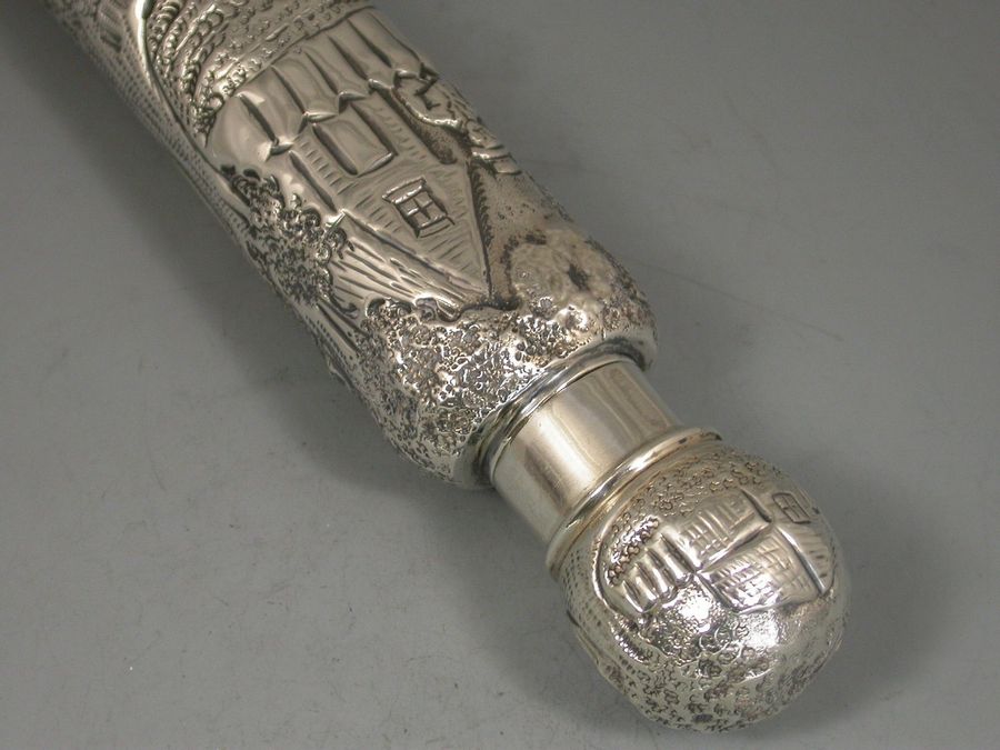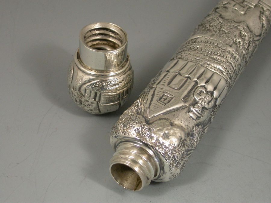 A good quality large Victorian silver Perfume Flask with long icicle form, the body chased and embossed with Teniers style figures and landscape scenes, screw off lid.