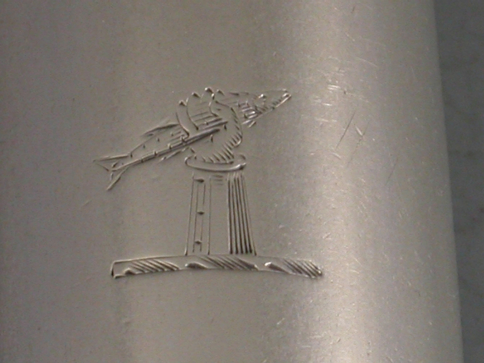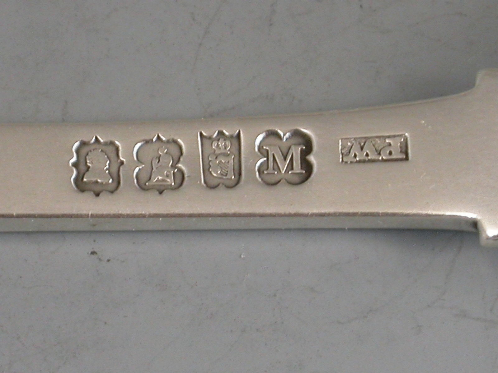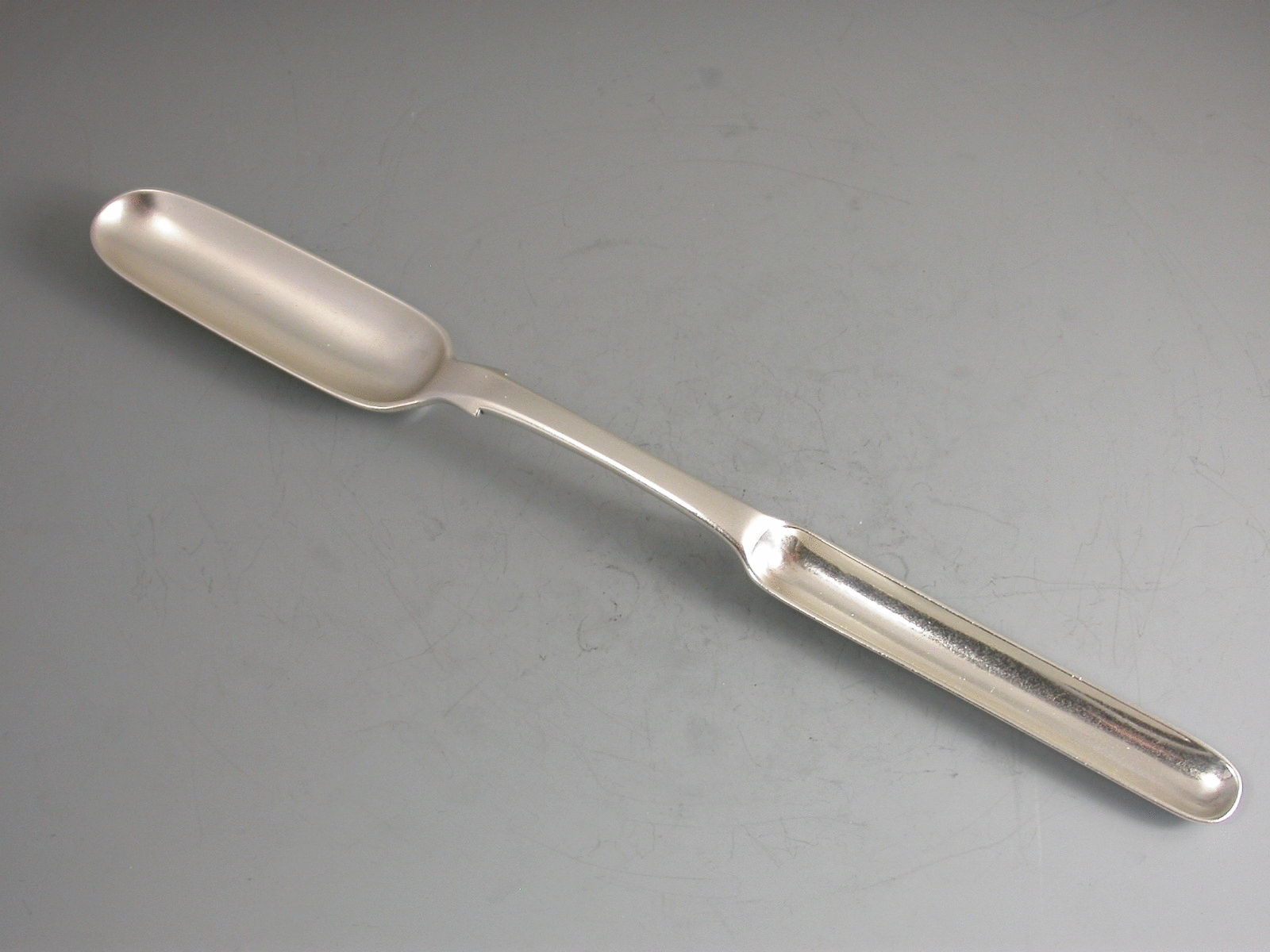 A fine William IV Irish silver Marrow Scoop of unusually large proportions, of plain form and fairly standard length but both bowls nearly double the size of a normal scoop. The larger bowl engraved with a crest of an arm holding a fish.