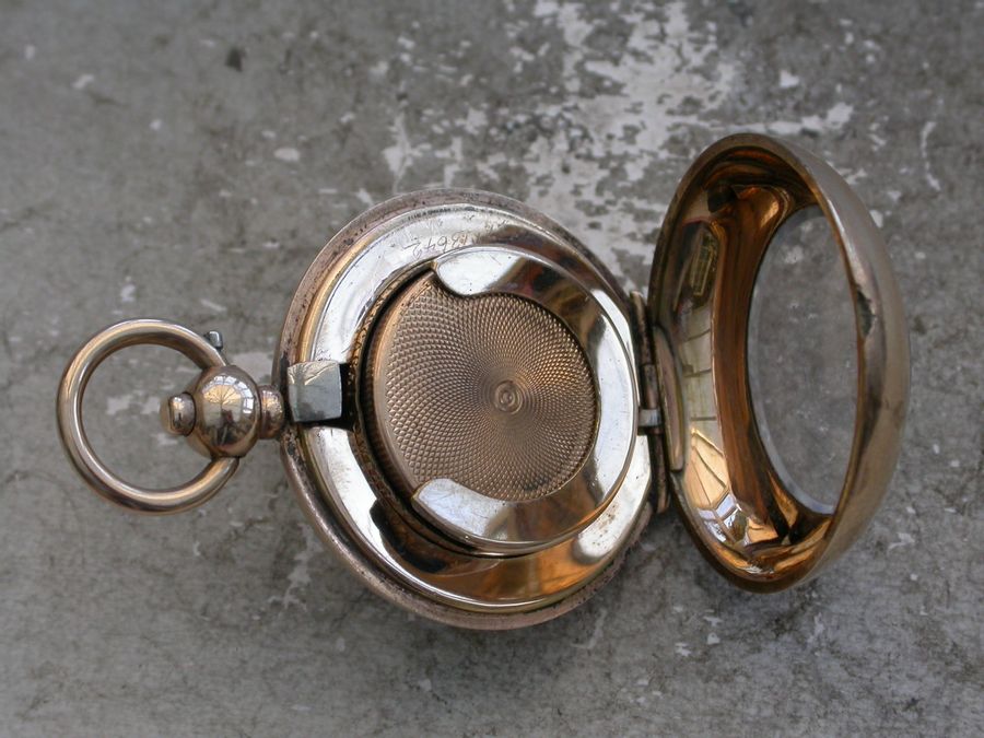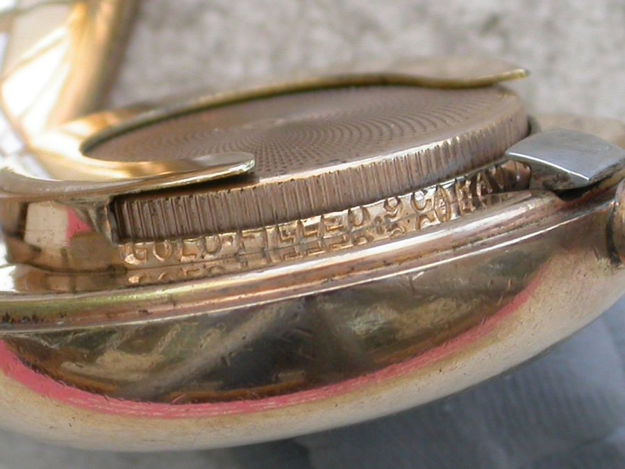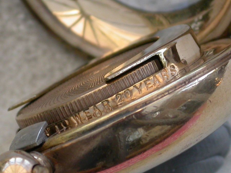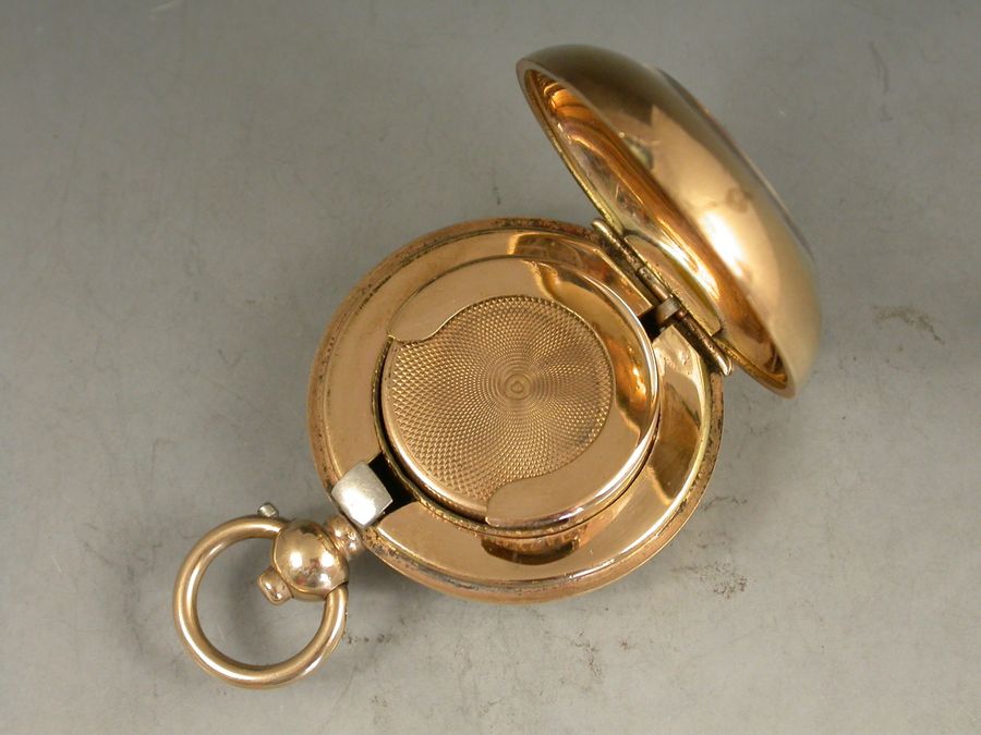 A late 19th century 9 carat gold plated Exhibition glass fronted full Sovereign Case with push button opening mechanism and attached suspension ring. The single sprung sovereign holder stamped with the 20 year plate guarantee.