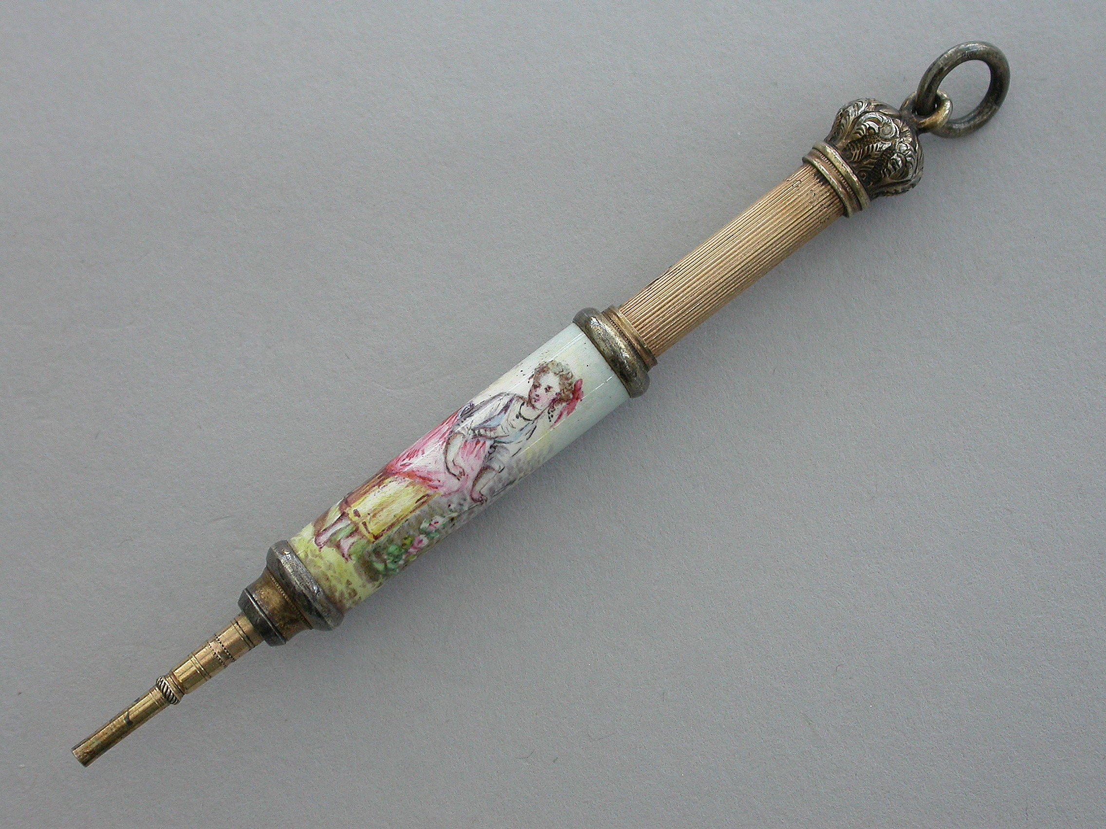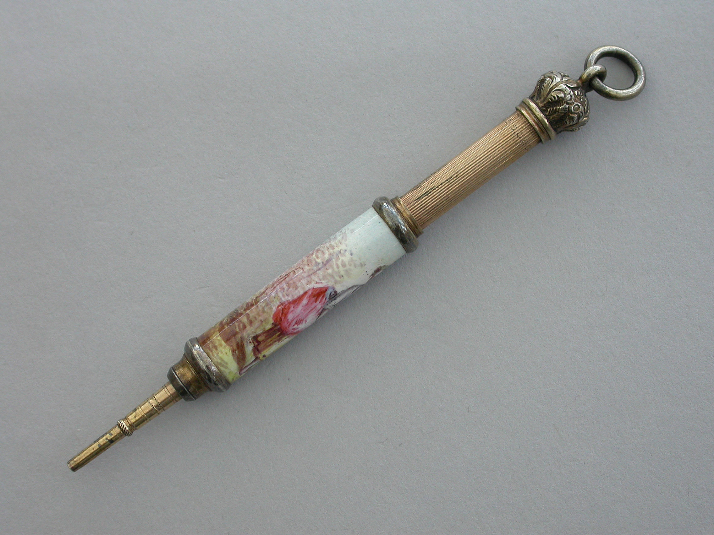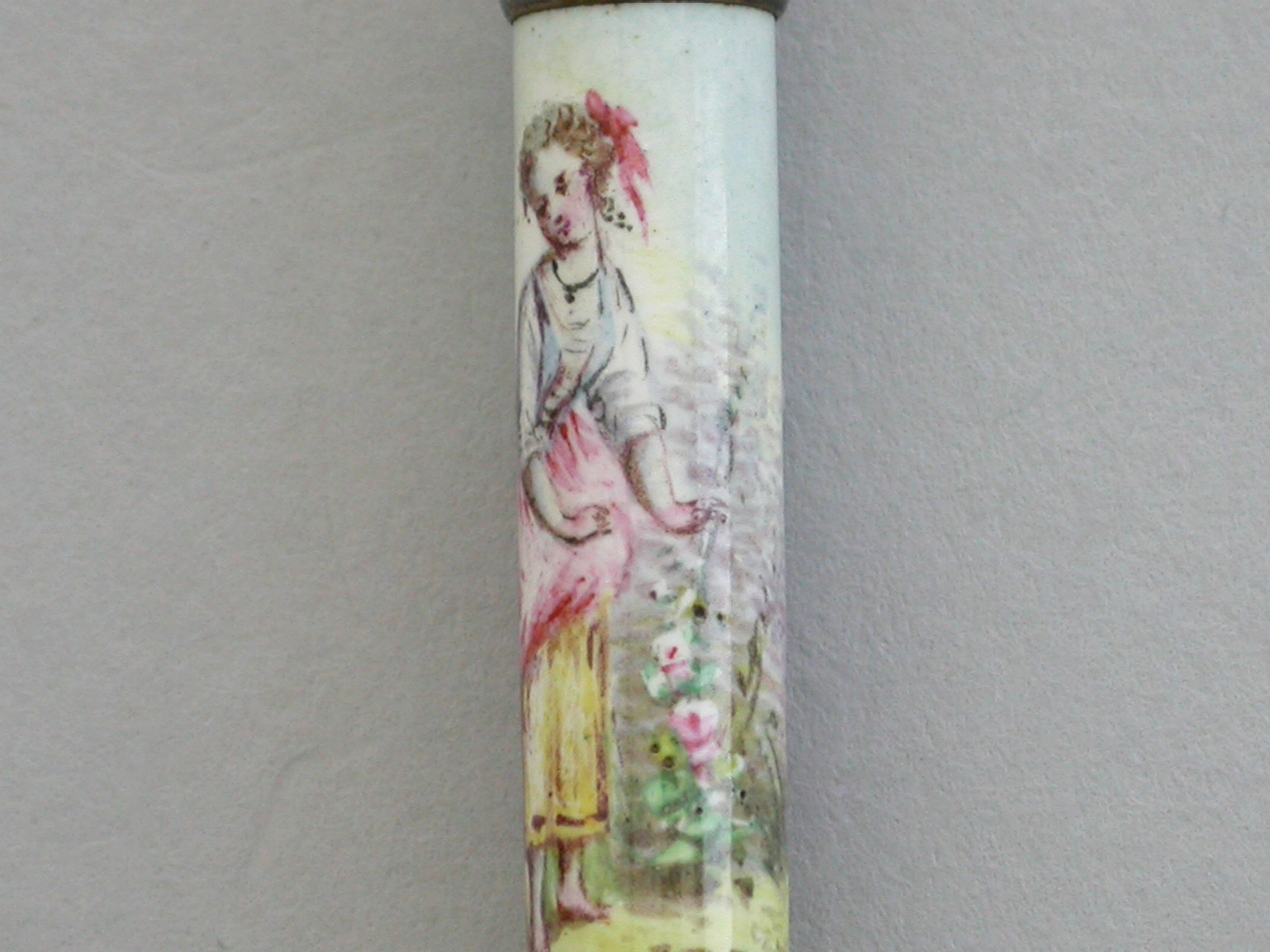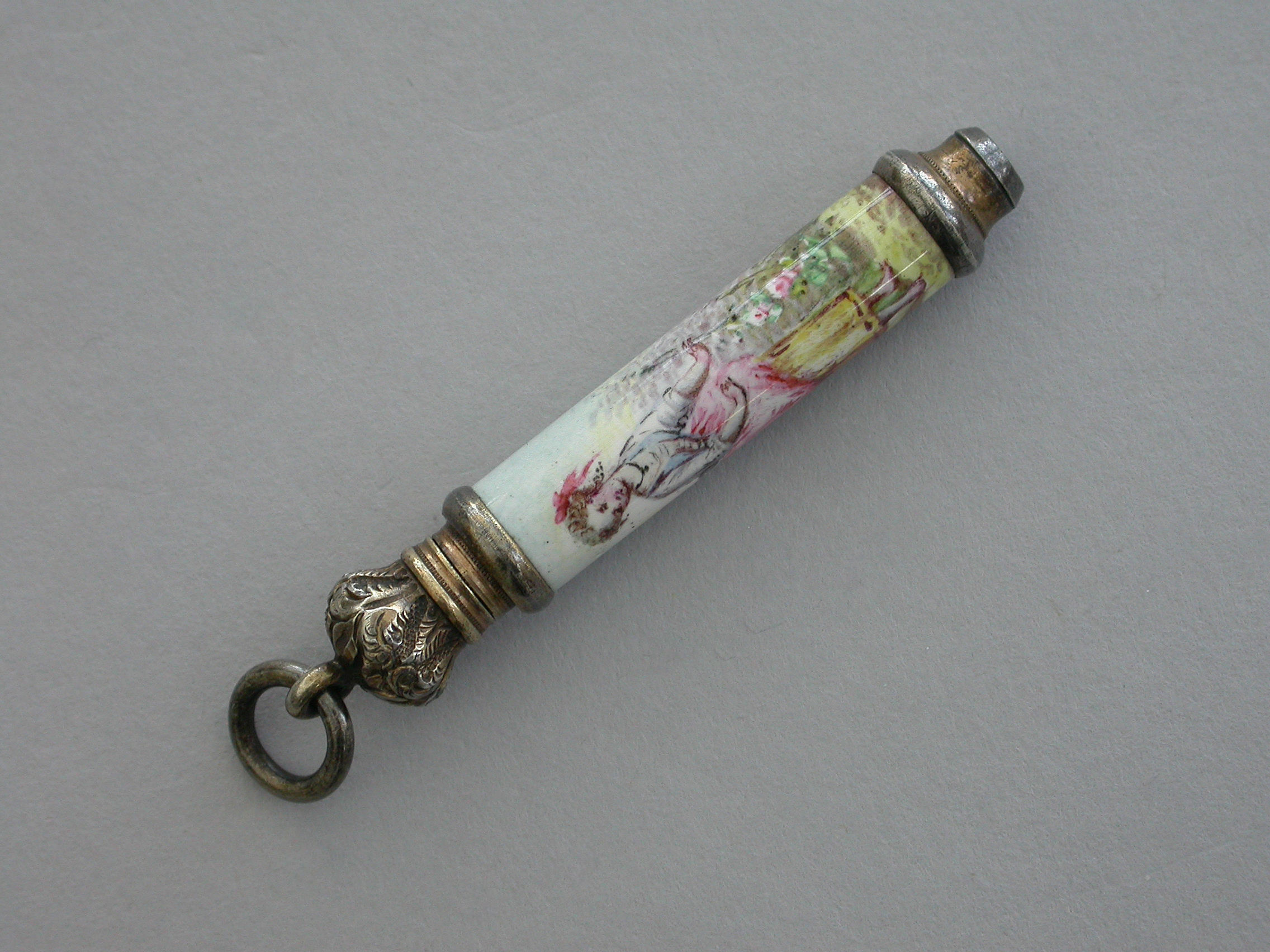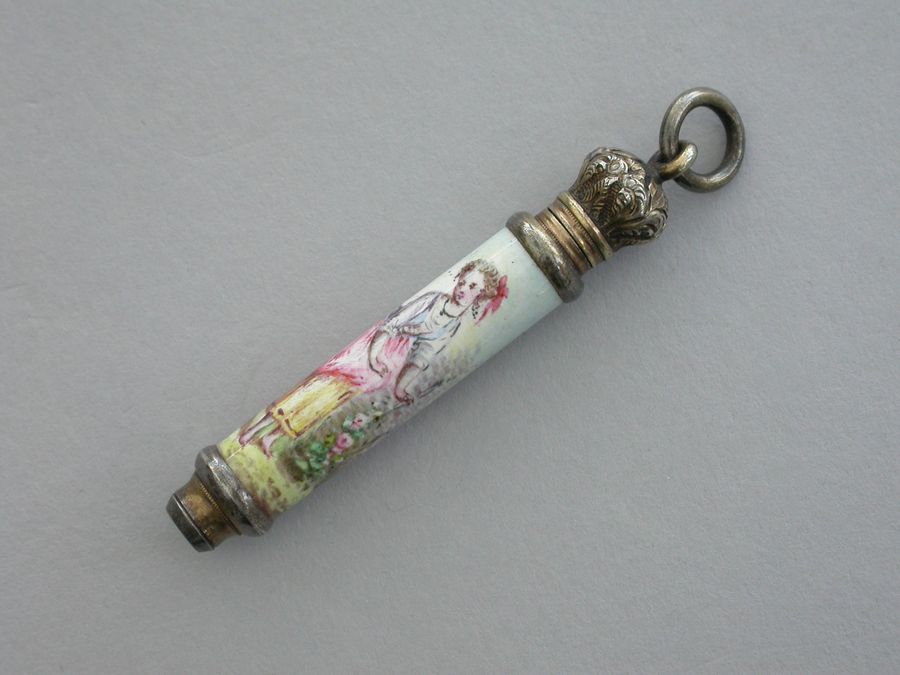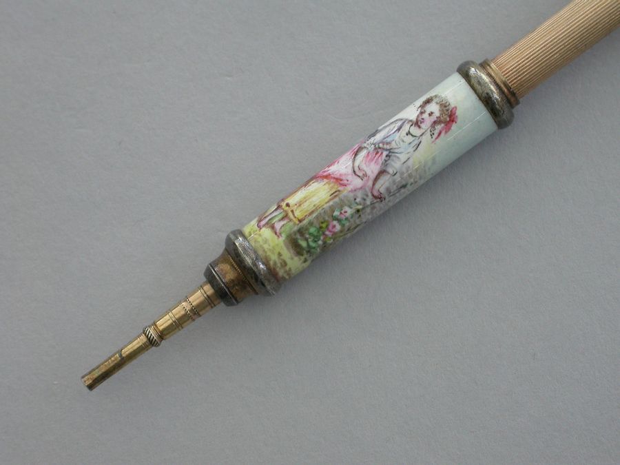 A late 19th century gilt metal and enamel Magic Pencil with foliate chased terminal and attached suspension ring, reeded barrel, the enamelled scene depicting a young girl in a rose garden.