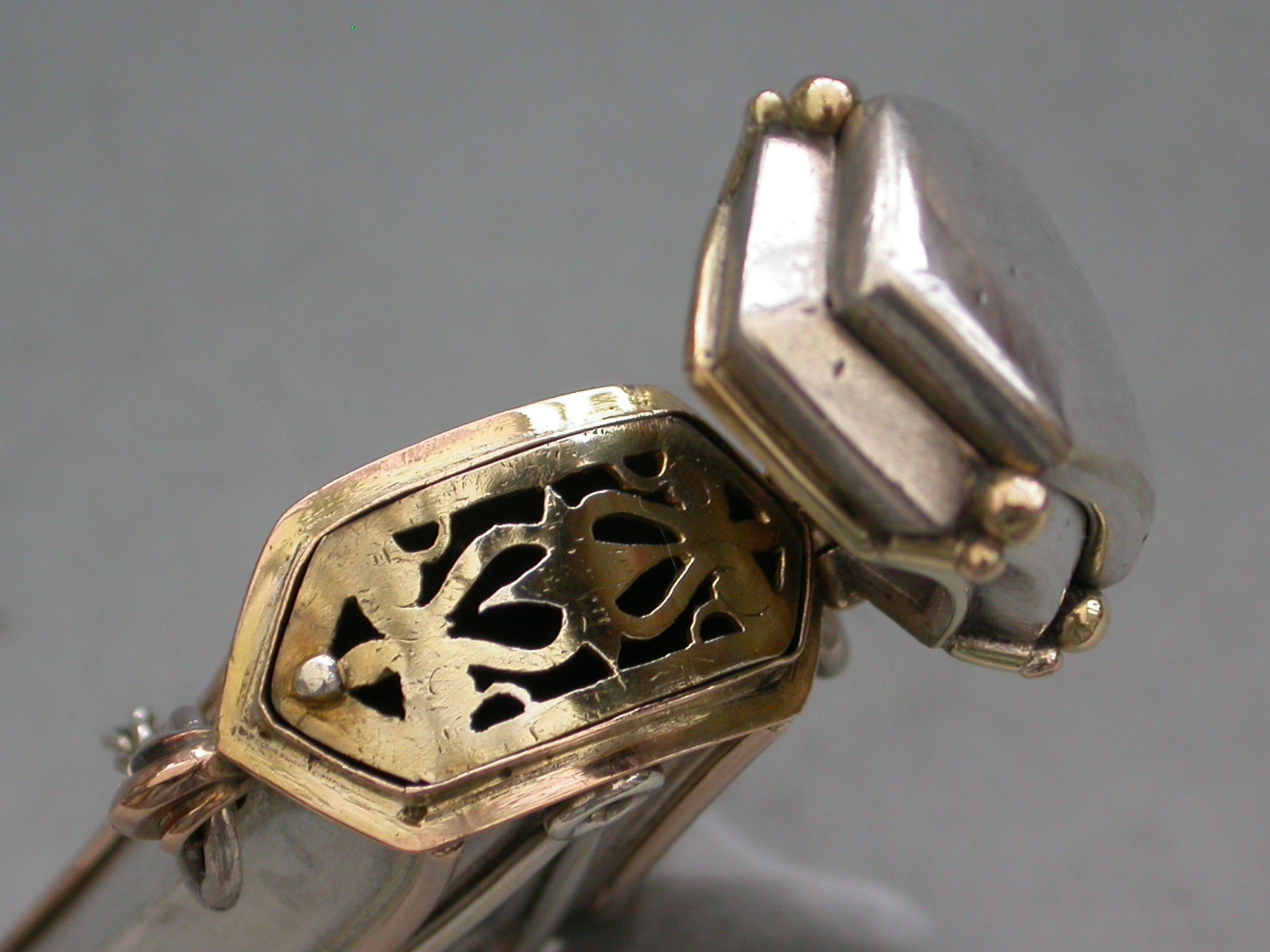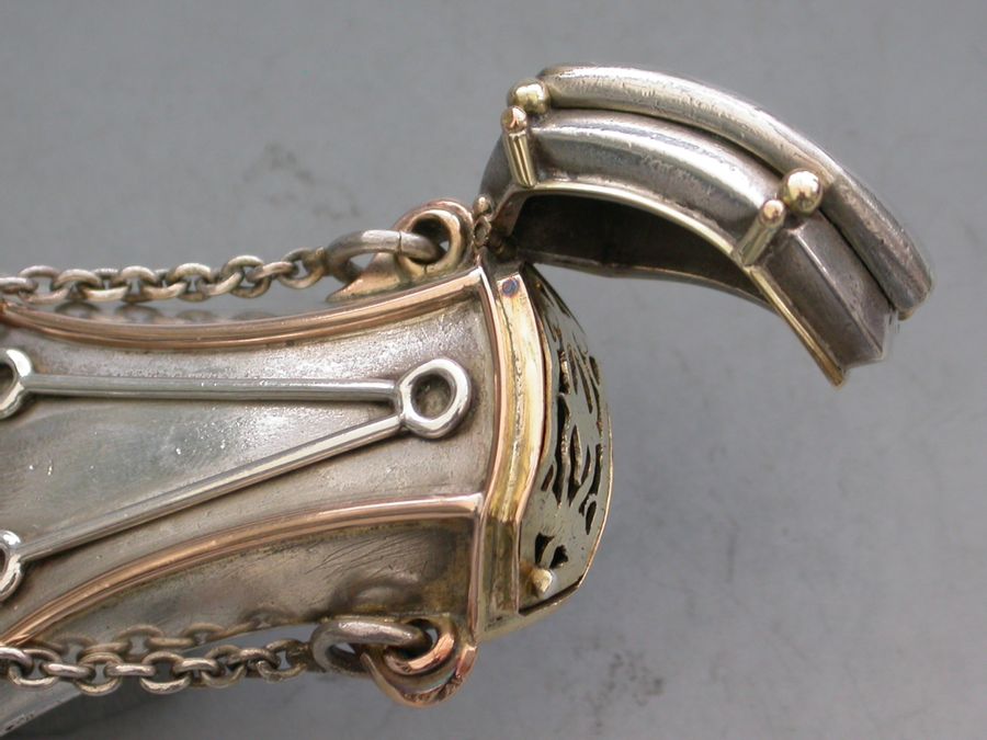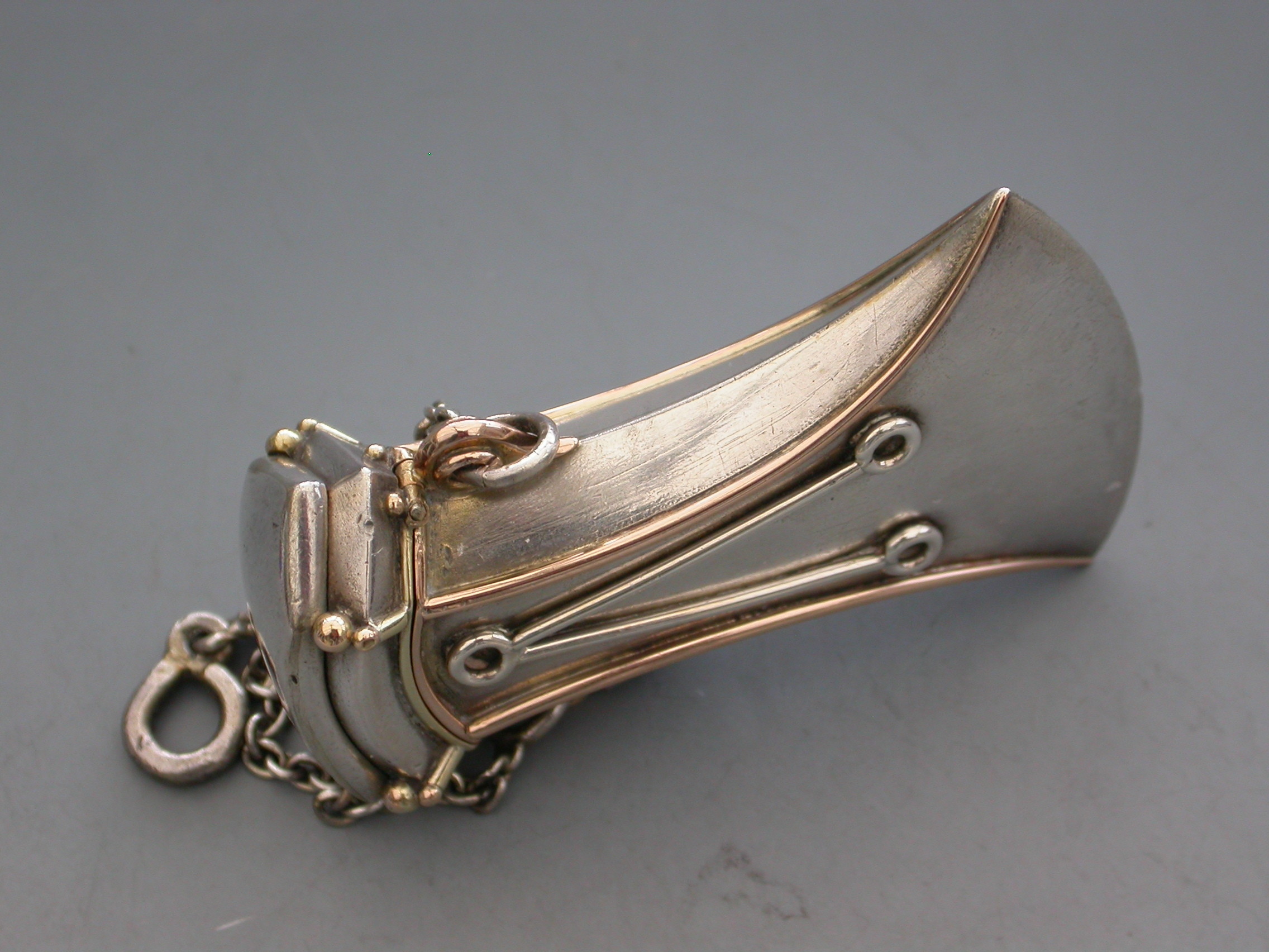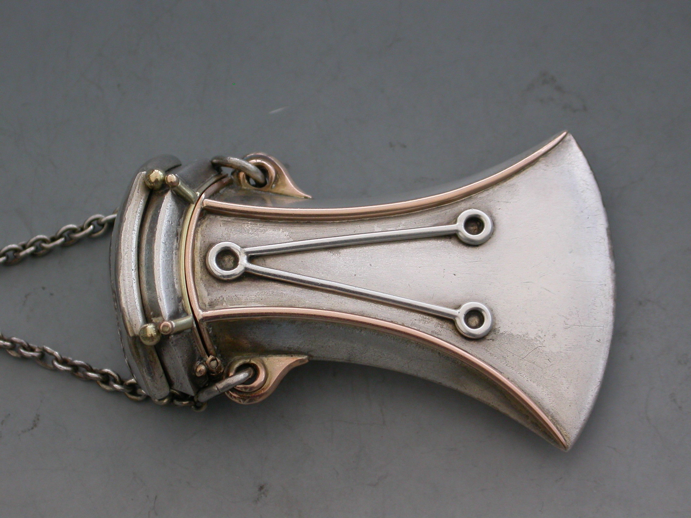 A rare and unusual novelty Scottish silver Vinaigrette made in the form of an axe head, with applied Celtic design strap work highlighted in gilt. The hinged domed cover opening to reveal a pierced grille.