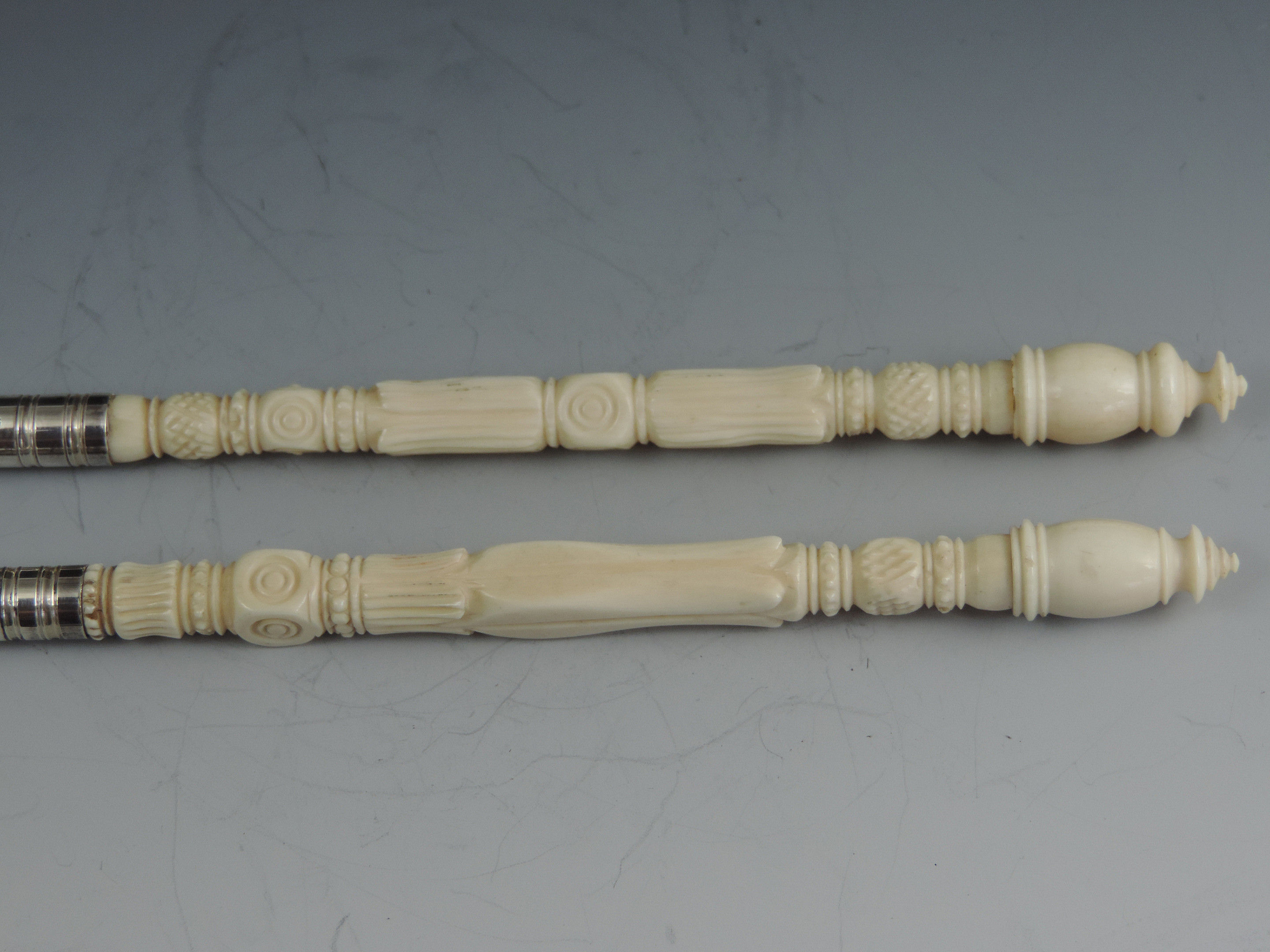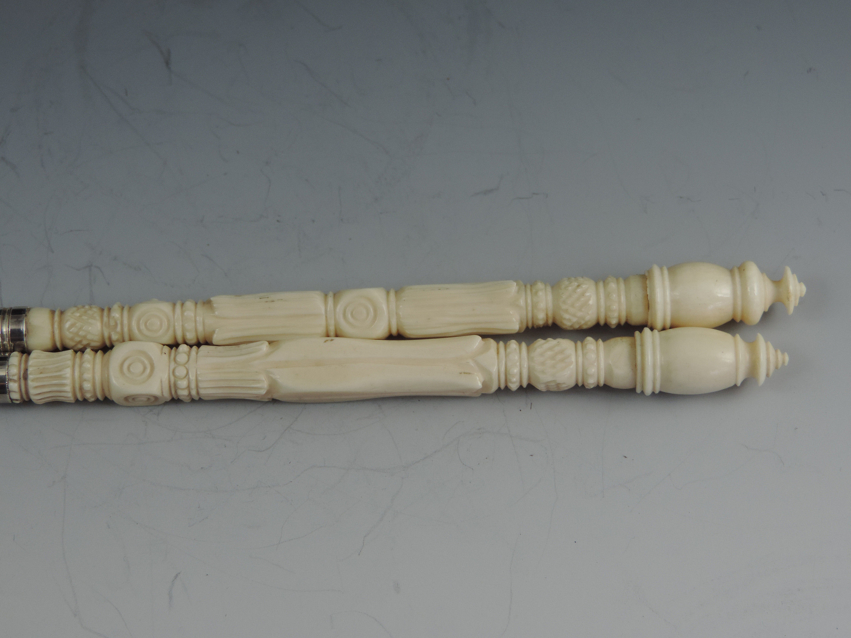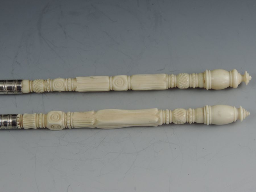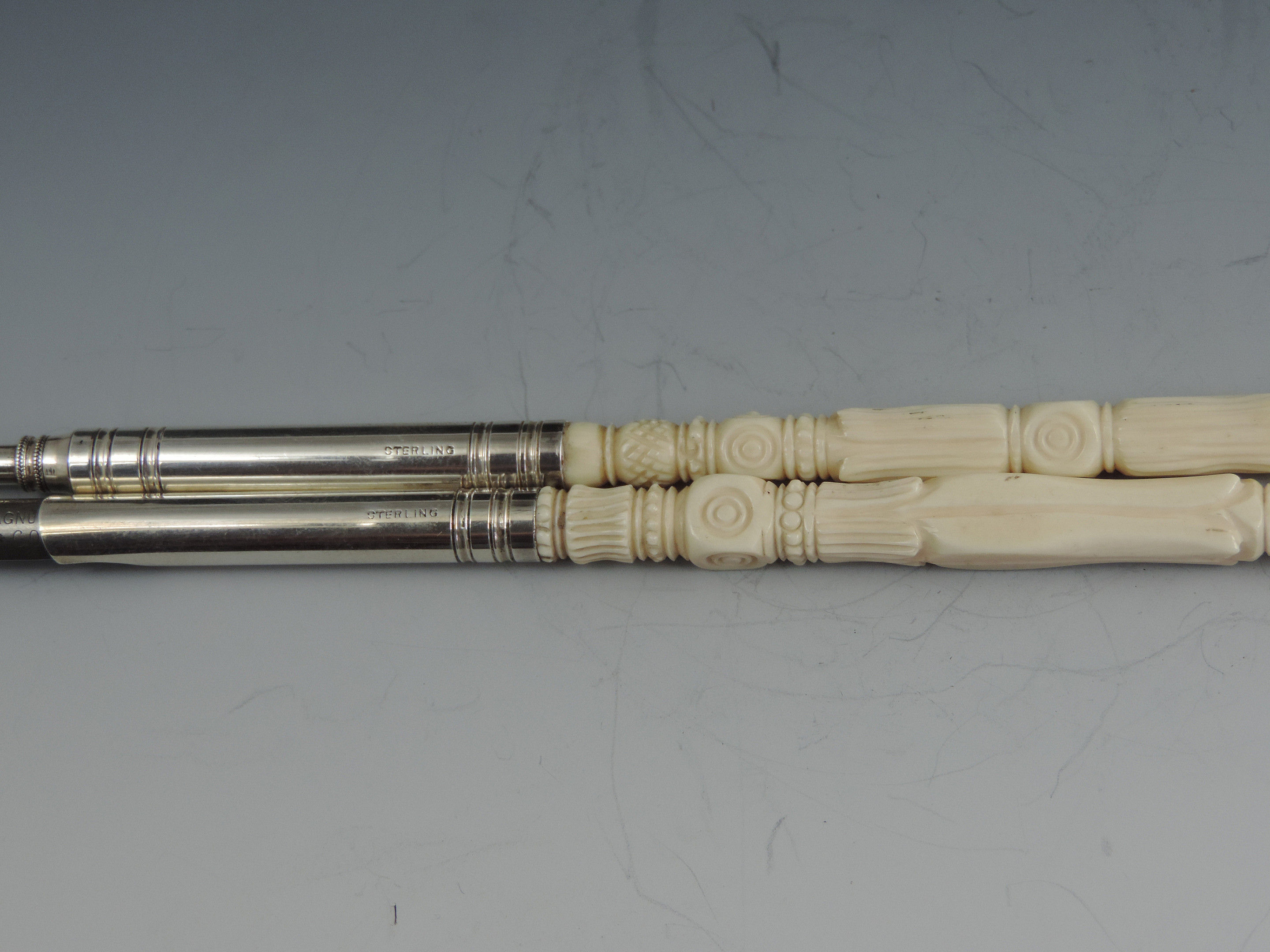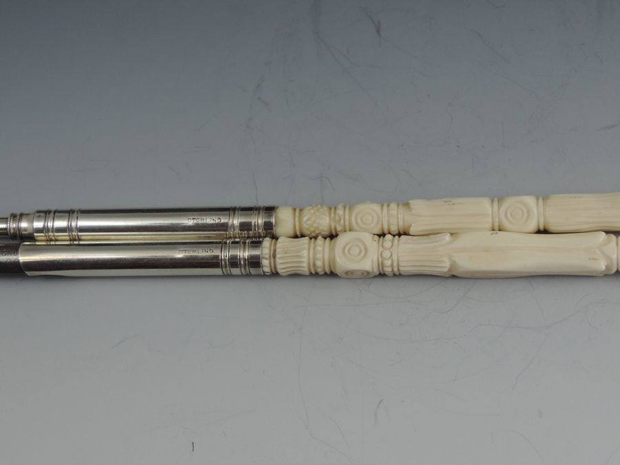 A fine quality late 19th century, probably American Sterling silver mounted matching Dip Pen and Propelling Pencil with complex turned ivory shafts and reeded silver ferrules marked - Sterling.