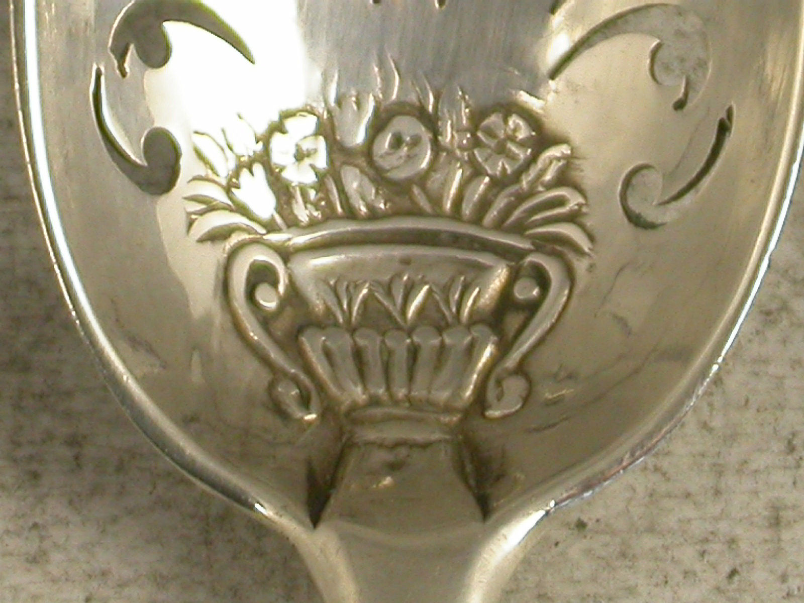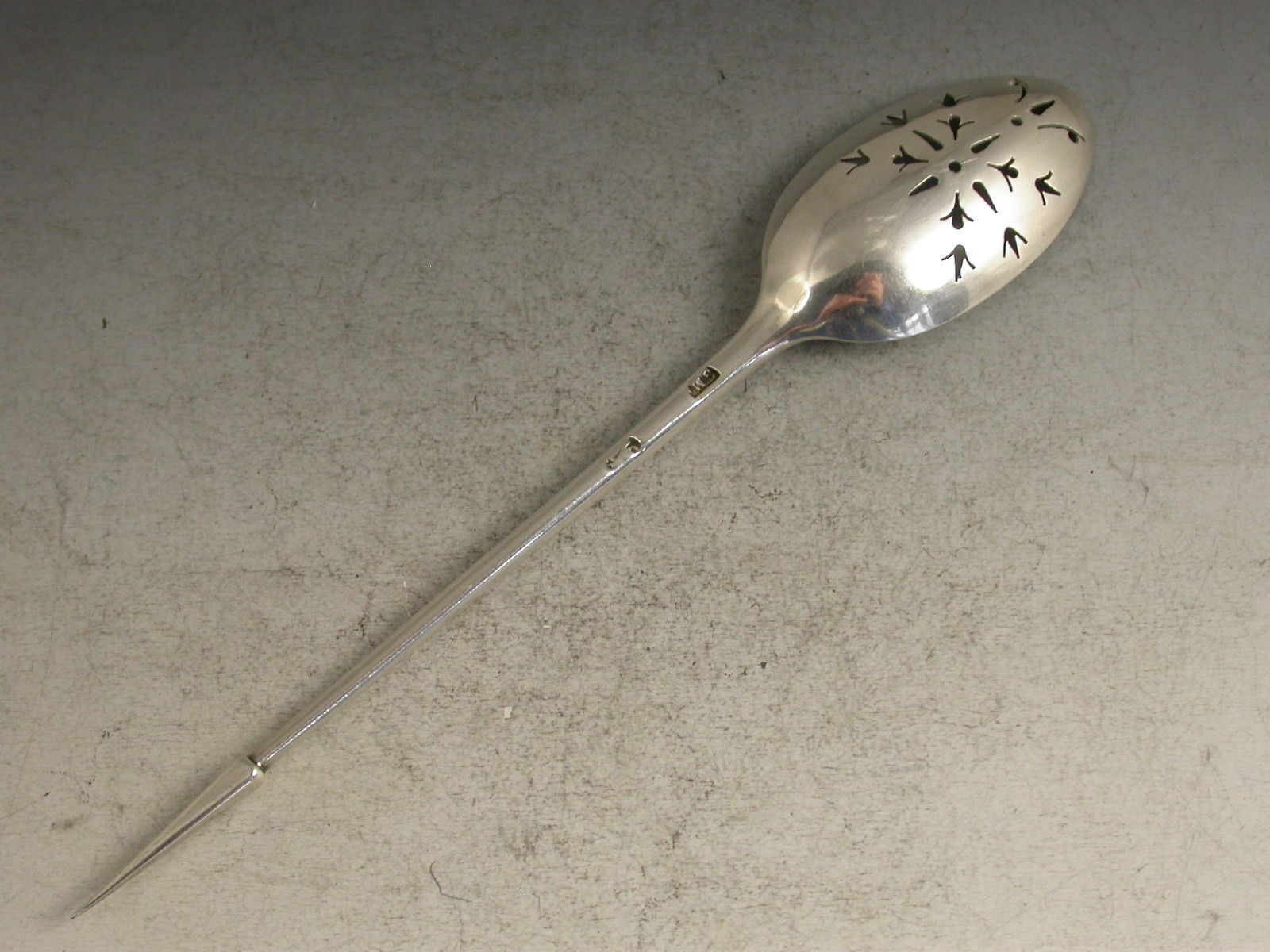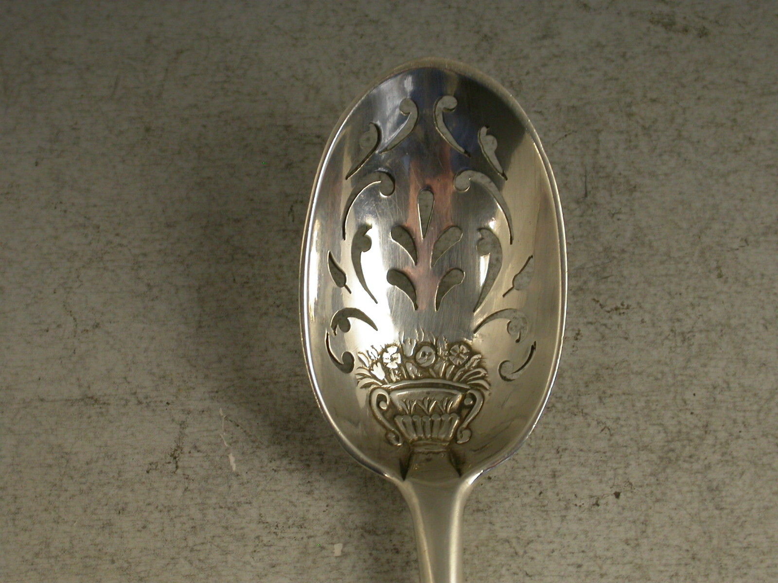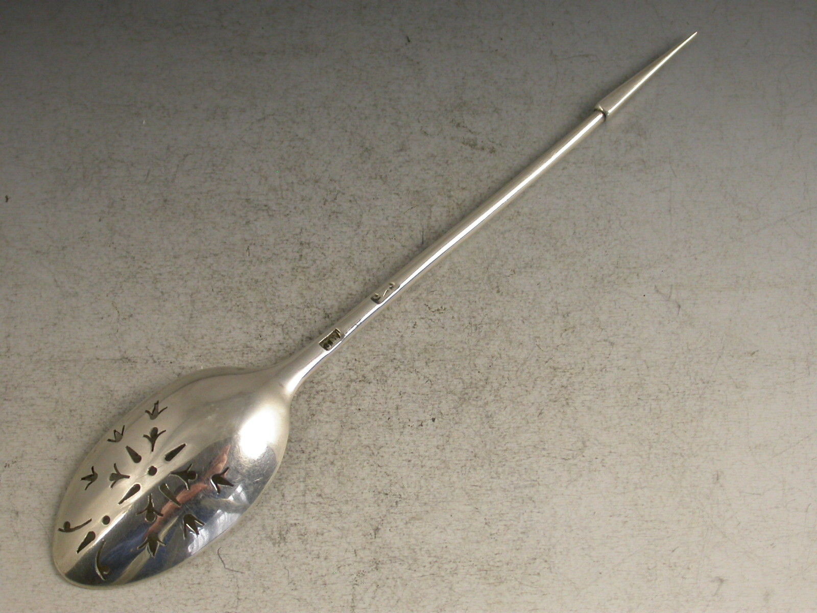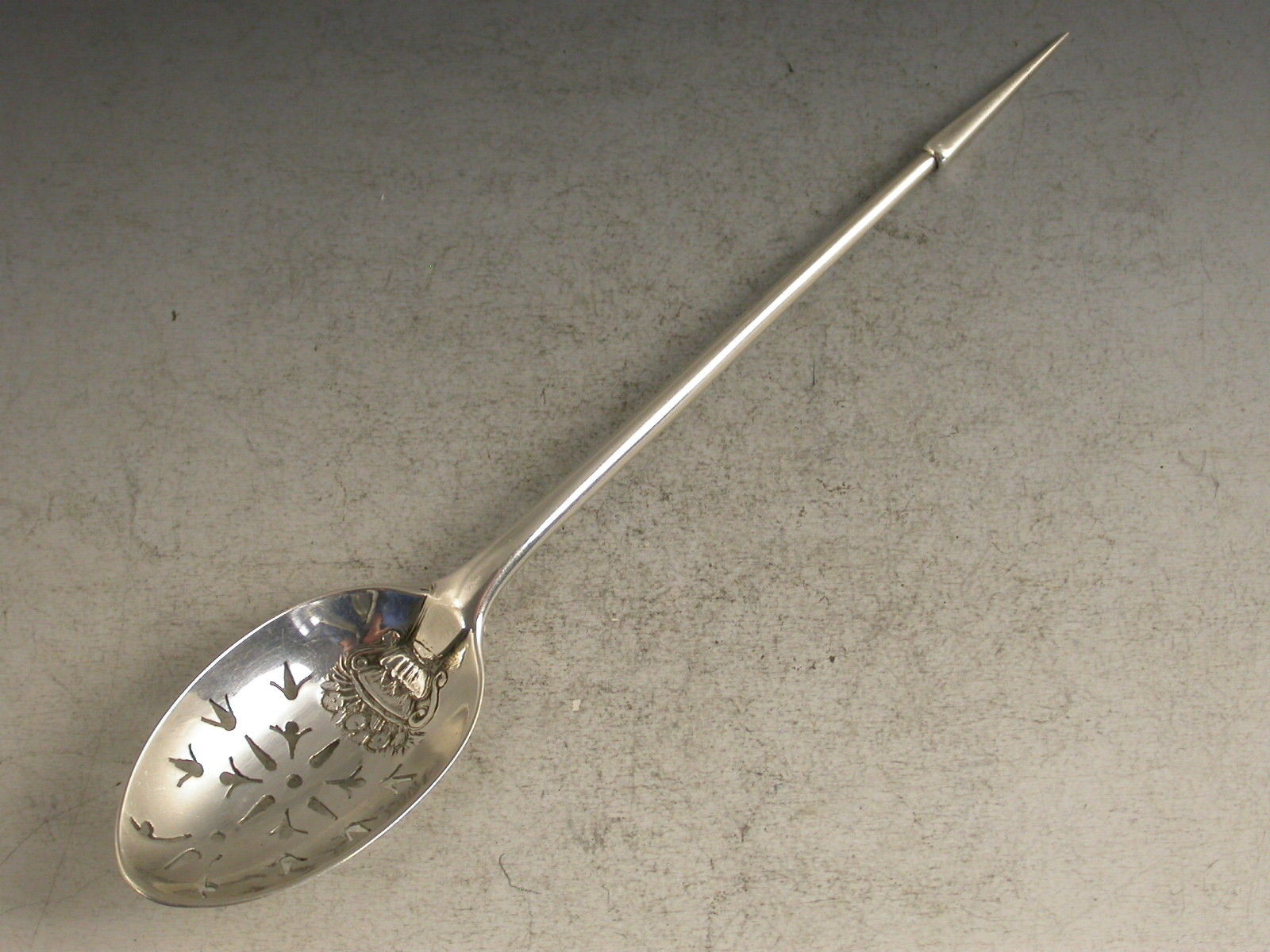 An extremely rare mid 18th century silver 'picture front' Mote Spoon, the plain tapering handle ending with a pointed finial, the oval bowl pierced with foliate motifs, pales and dots. Most unusually the front of the bowl is chased with a basket of flowers design.