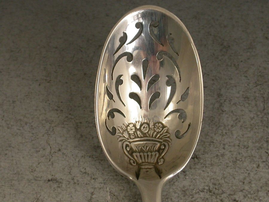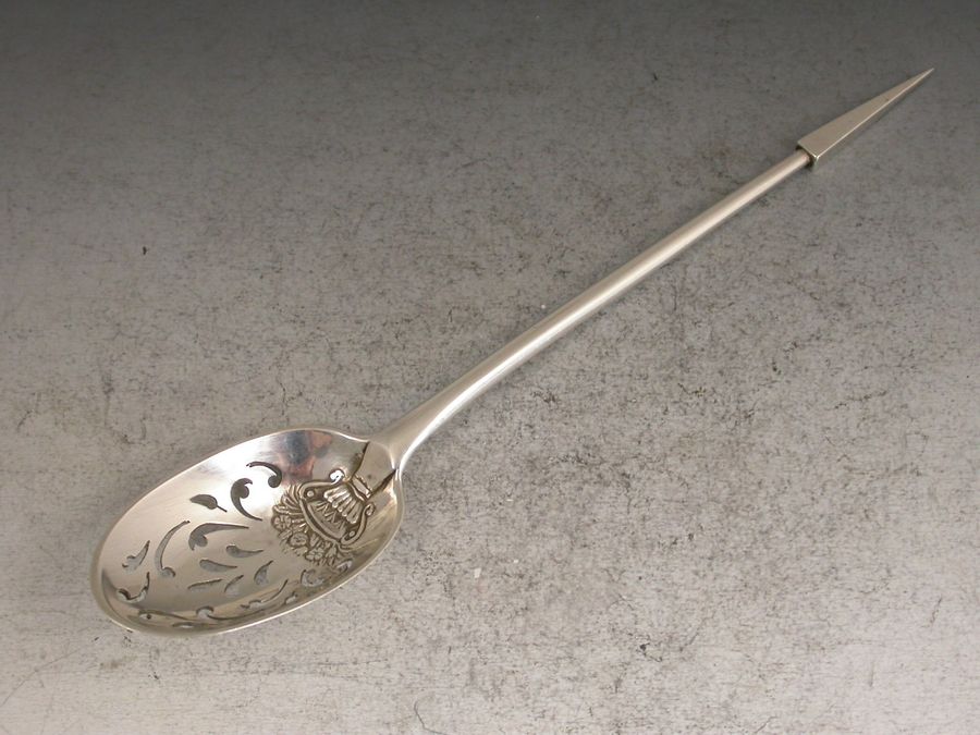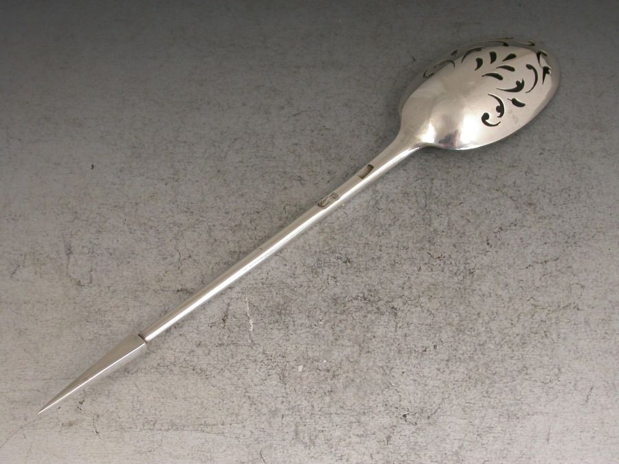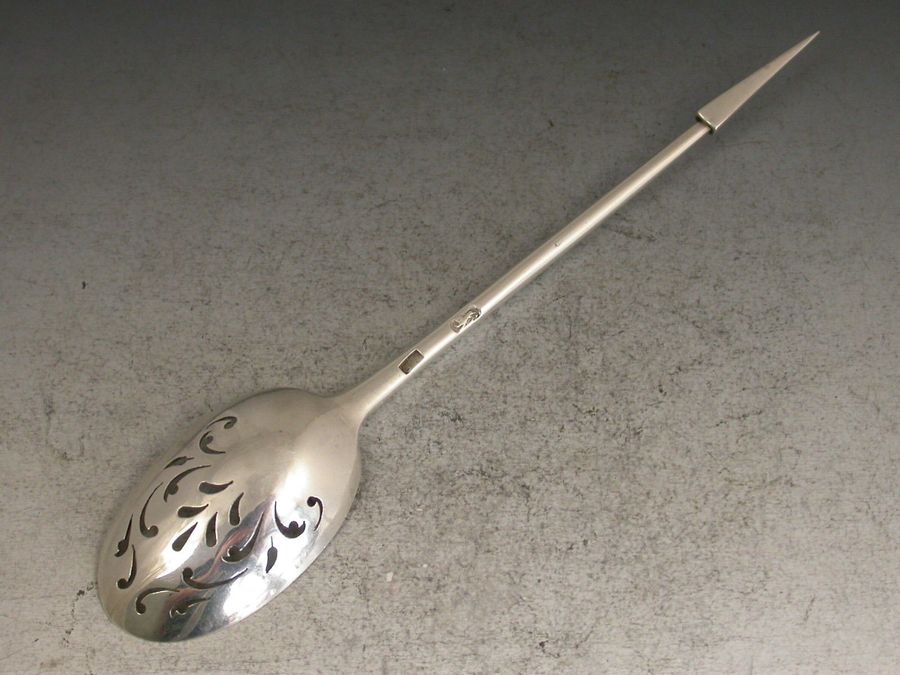 An extremely rare mid 18th century silver 'Picture-Front' Mote Spoon, the plain tapering handle ending with a large pointed finial. The oval bowl pierced with scrolls and serifs. Most unusually the front of the bowl is also chased with a basket of flowers design.