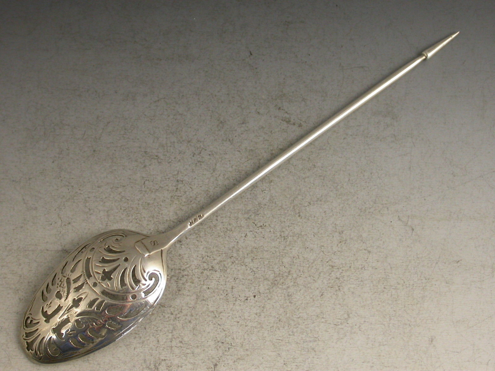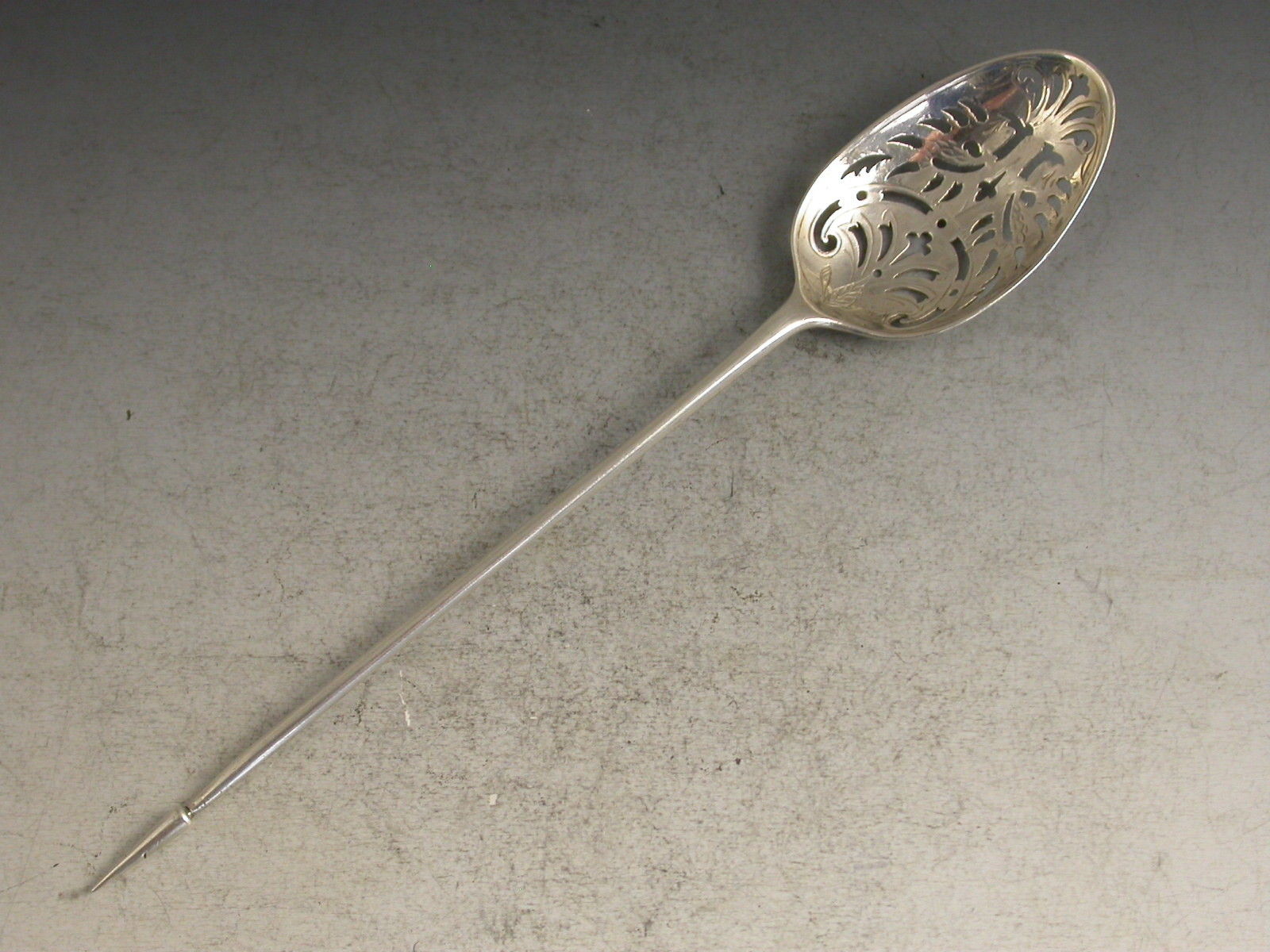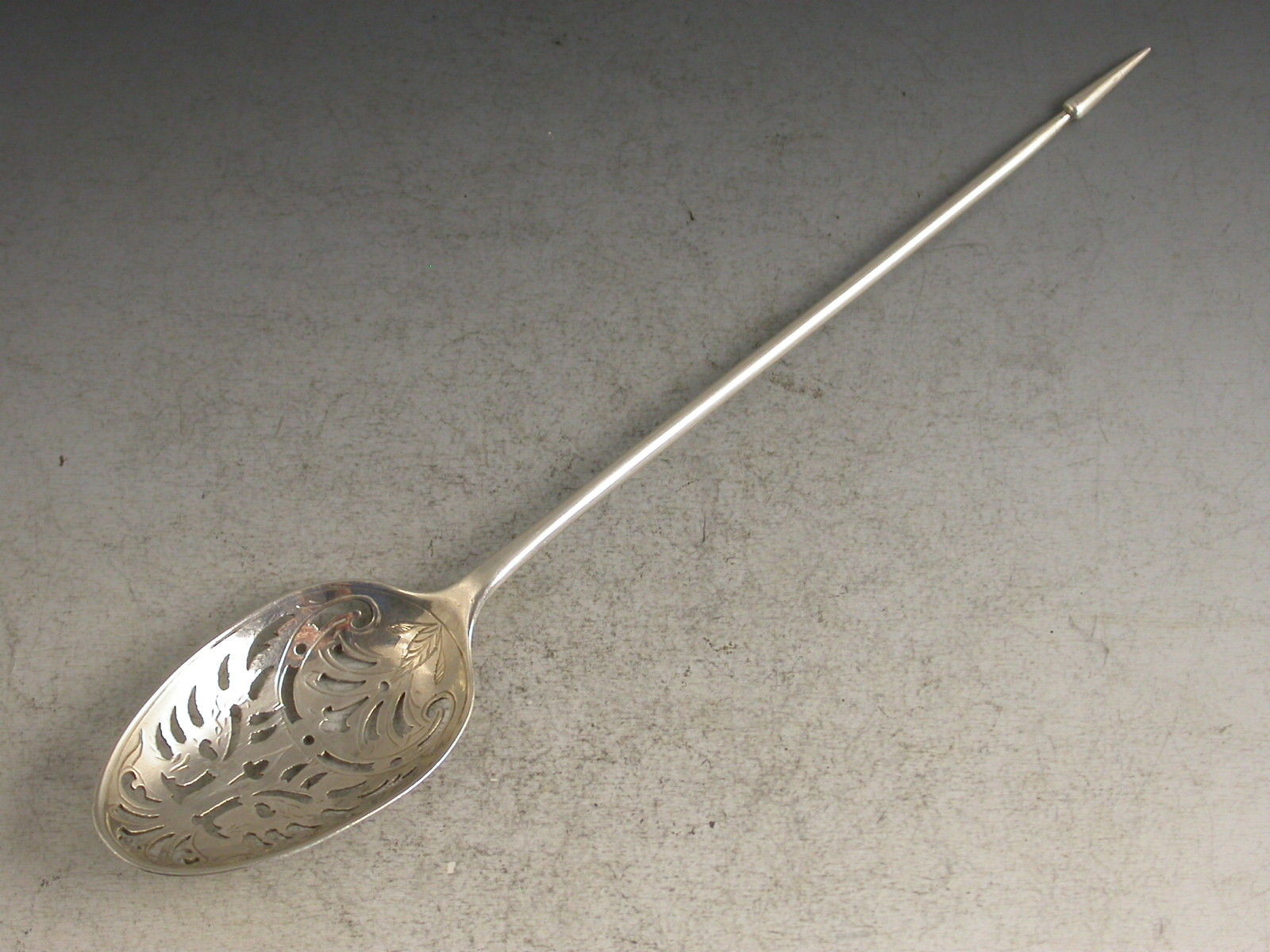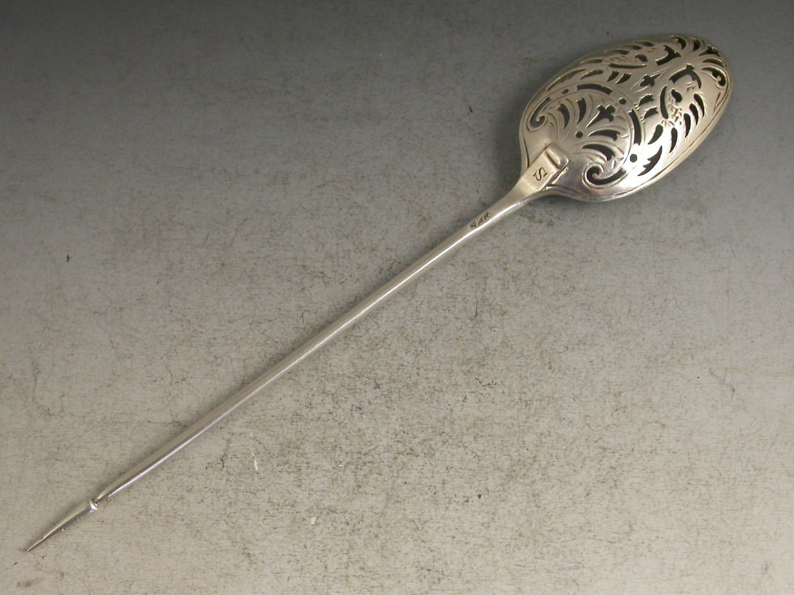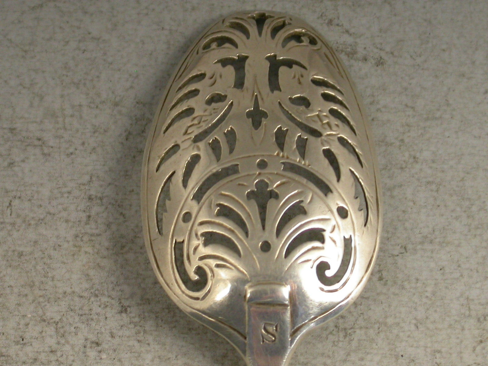 An unusual late George II /early George III mid 18th century silver Mote Spoon, the plain tapering handle terminating with a long diamond point finial, the short single drop engraved with an initial letter 'S', the wide oval bowl intricately pierced and engraved with a rococo shell pattern, scrolls, serifs and a fleur-de-lys and enhanced with foliate engraving on both sides.