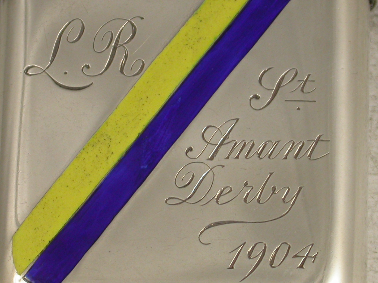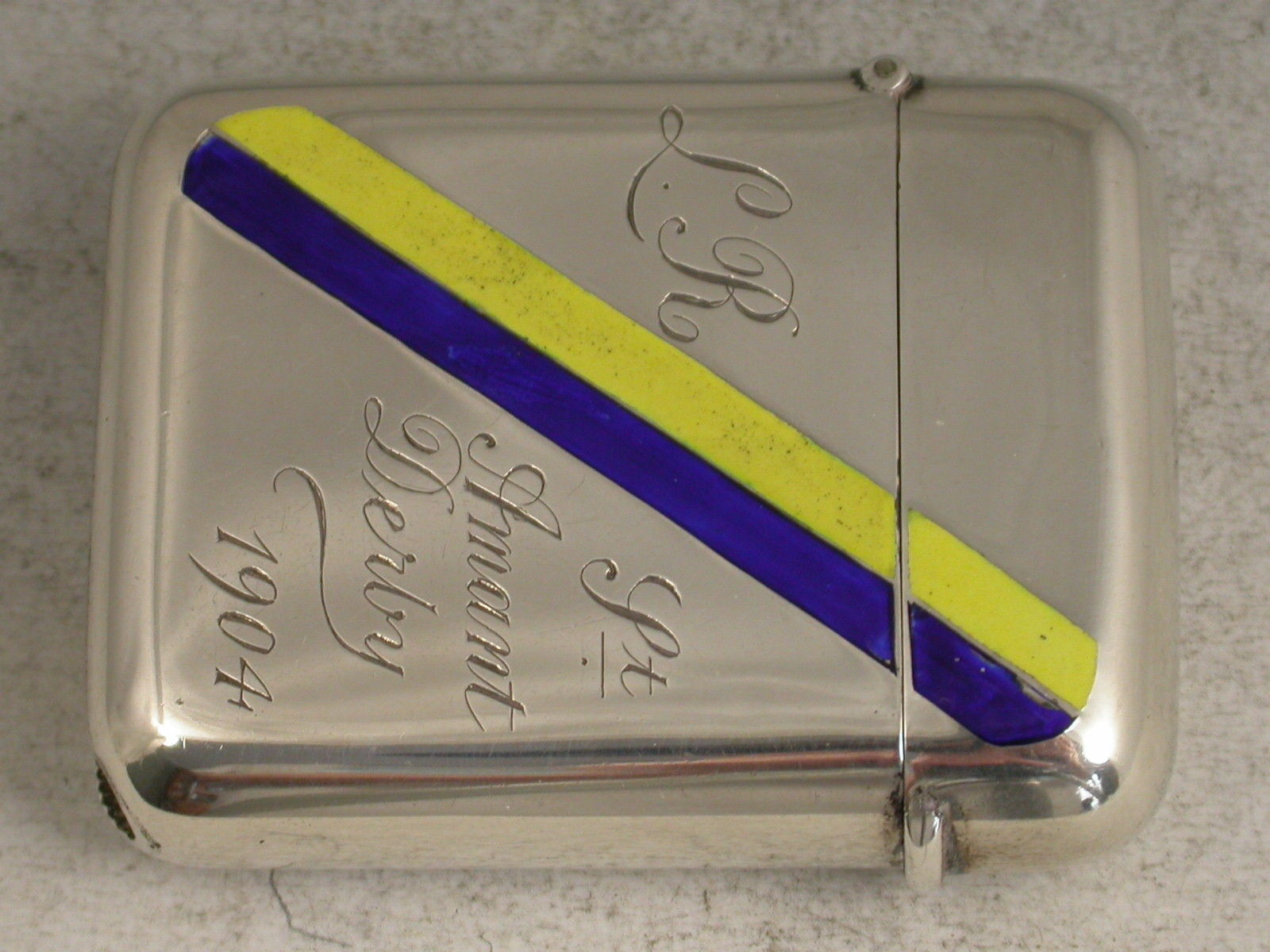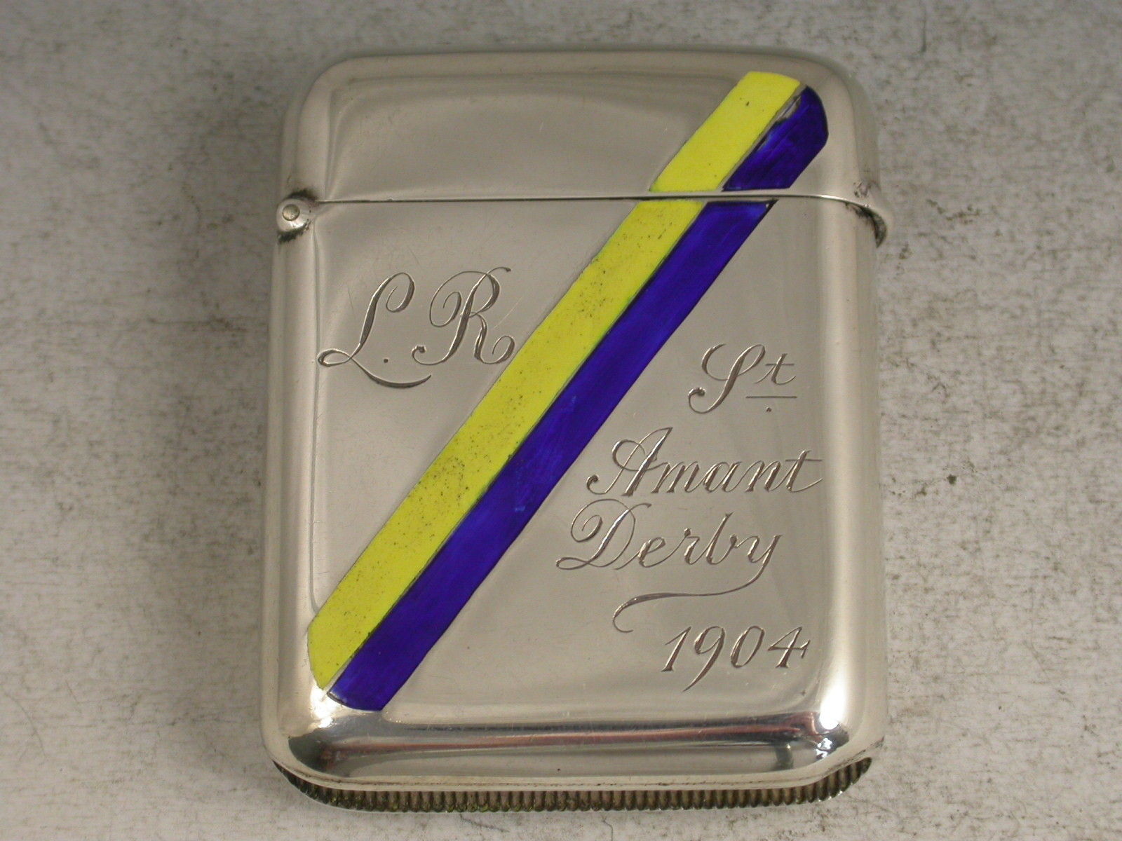 A rare Edwardian silver Vesta Case of rounded rectangular form with hinged flip-top lid, the case decorated with two diagonal enamel stripes in yellow and dark blue - the racing colours of Leopold de Rothschild. The case is also engraved with his initials 'L R' and St Amant Derby 1904.