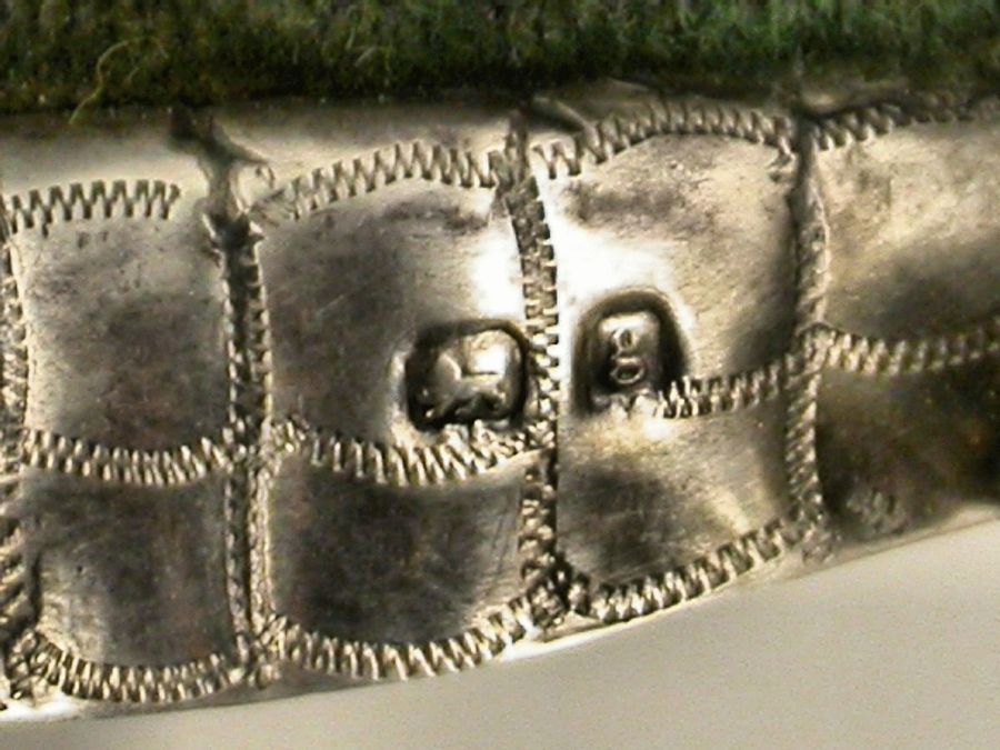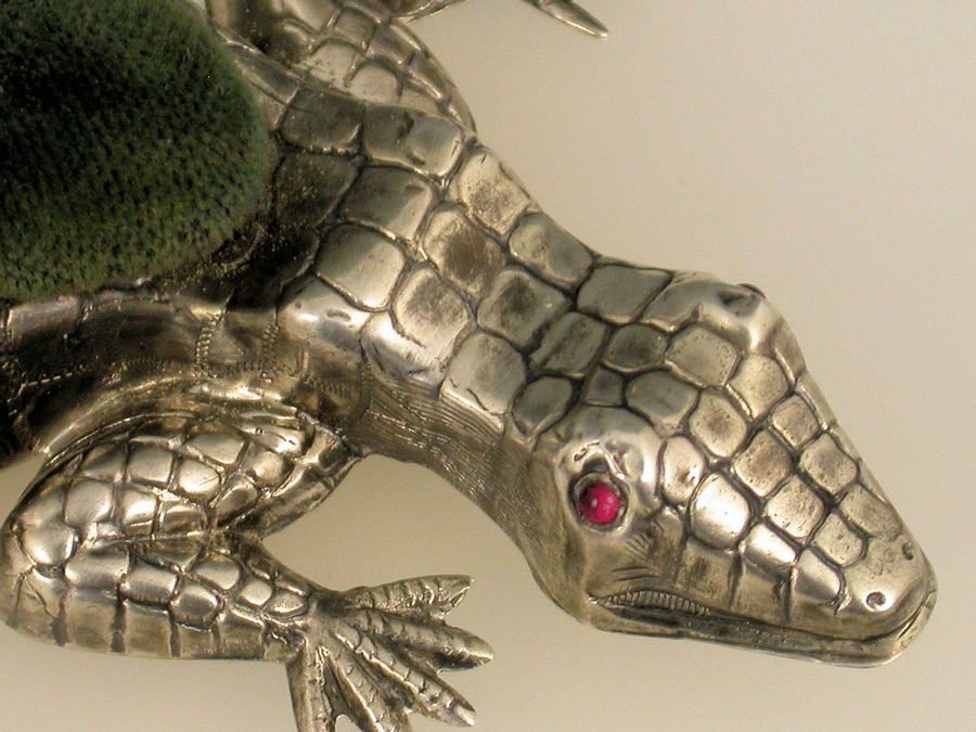 A rare Edwardian silver Pin Cushion modelled in the form of a Lizard, with ruby red garnet eyes and original green velvet cushion.