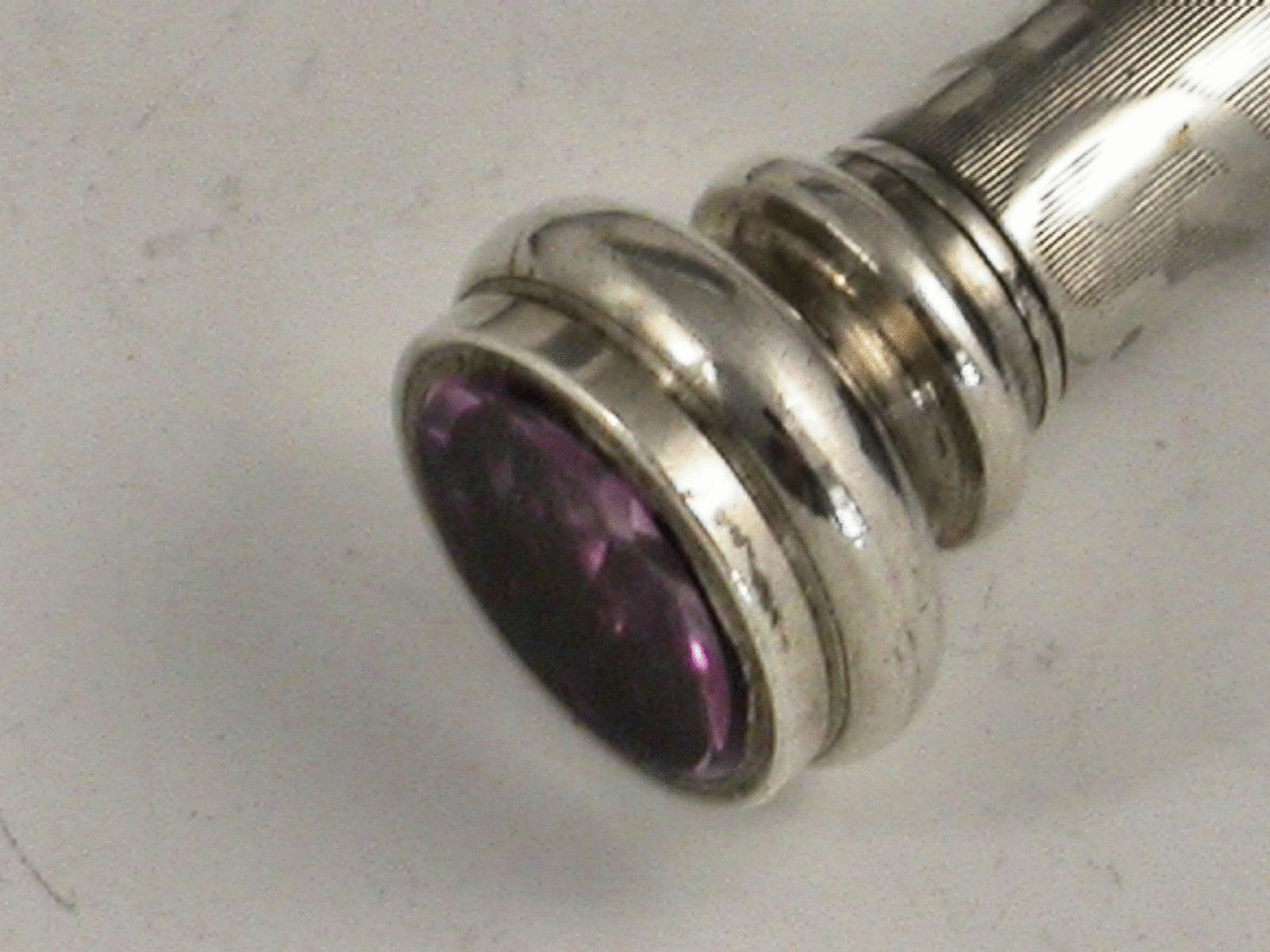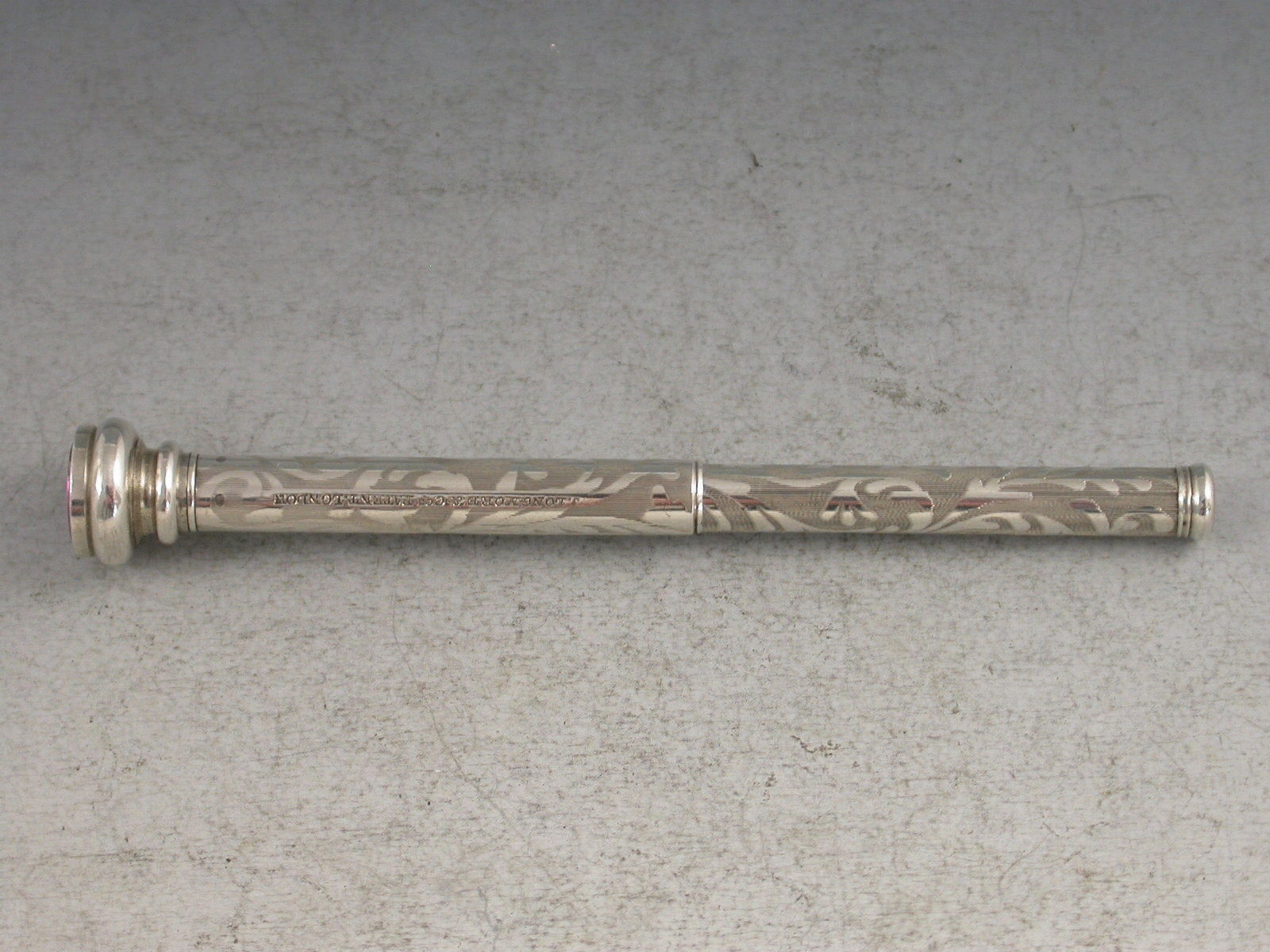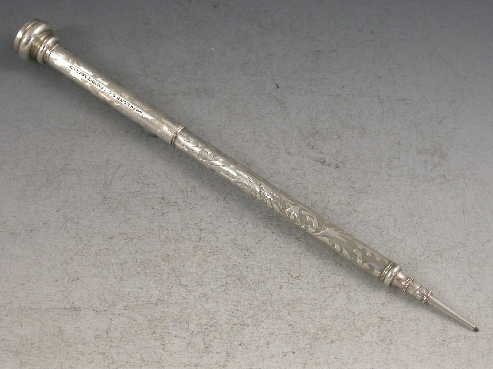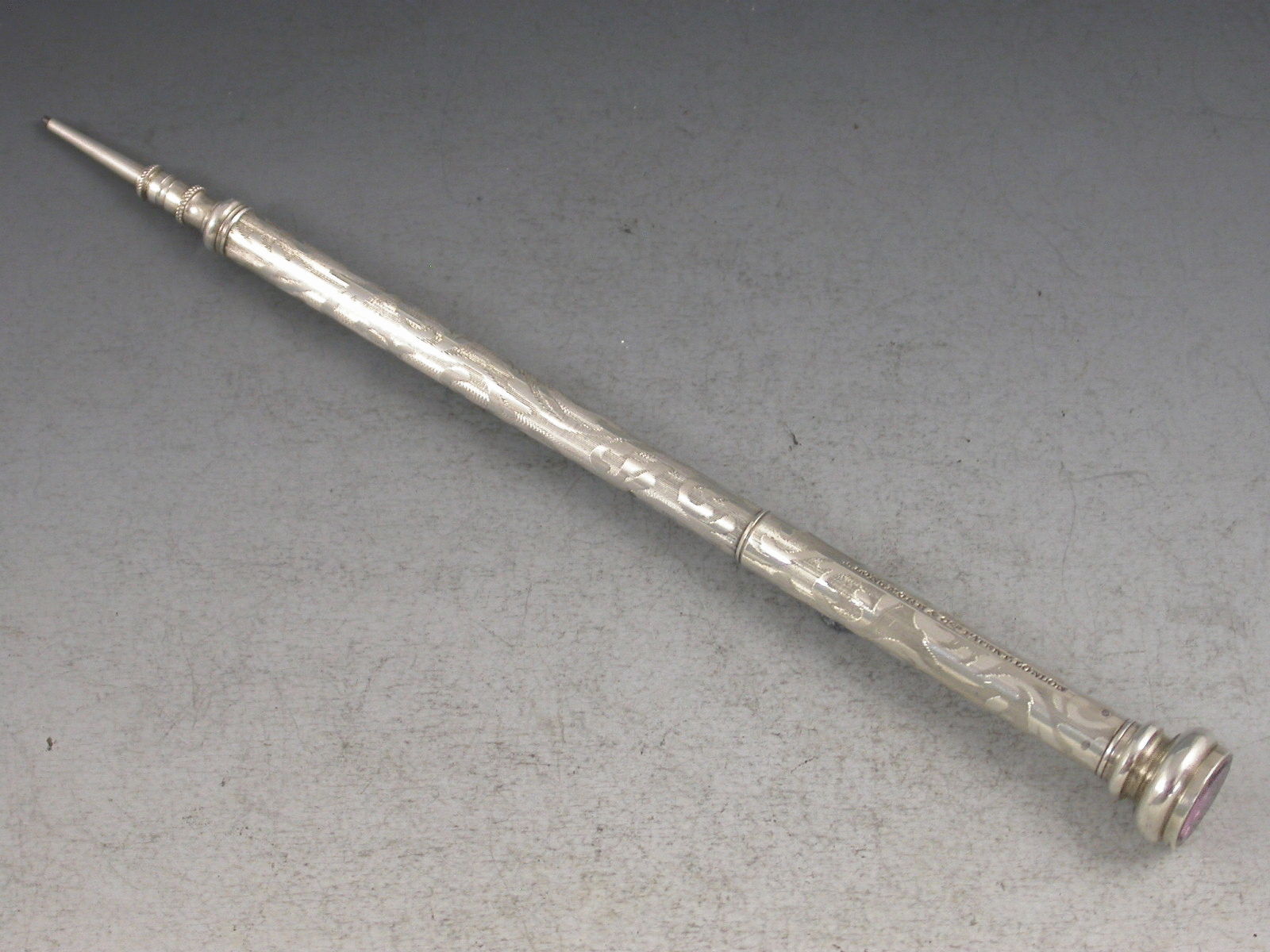 A rare early Victorian silver Propelling Pencil with engraved scroll decoration on an engine turned ground. Unusual propelling mechanism with the two halves of the body pulling in opposite directions – J. Longmore & Co’s Patent. Screw off end cap with amethyst coloured seal stone.