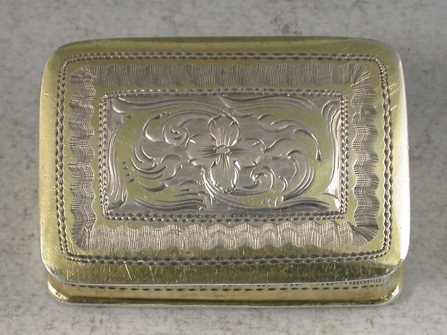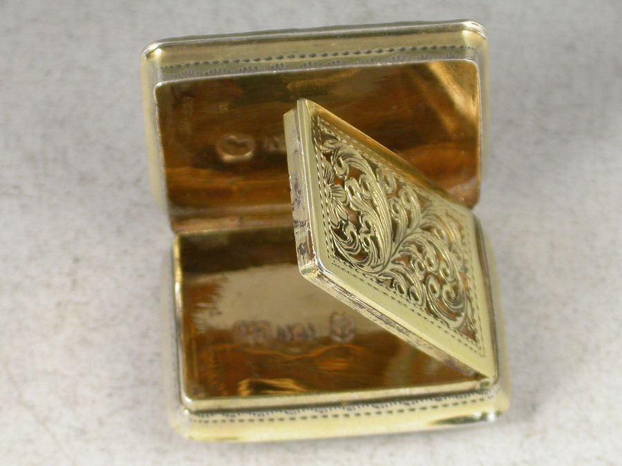 A rare Victorian silver gilt Vinaigrette of rectangular cushion shape, the lid engraved with the Masonic symbol of ‘The all seeing eye’ and the text “May it watch over you”. The base and sides with bright cut engraved decoration. The interior with finely pierced grille