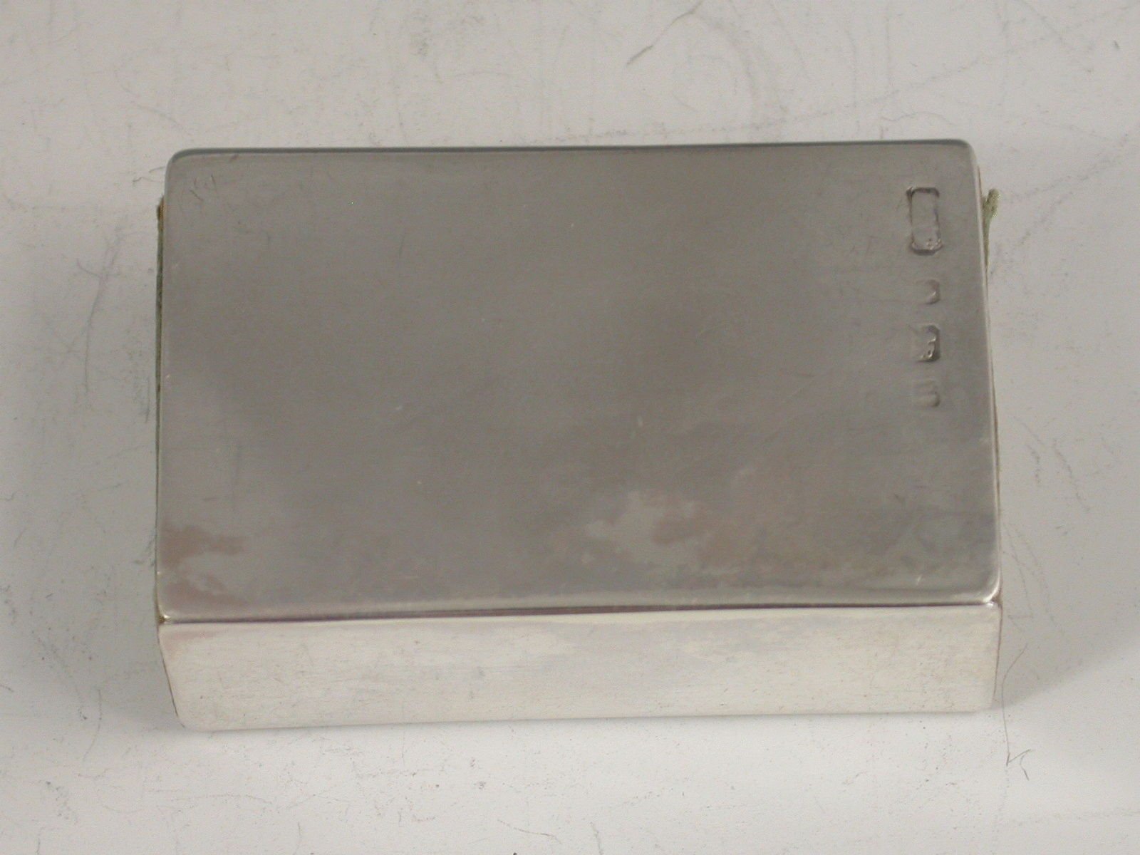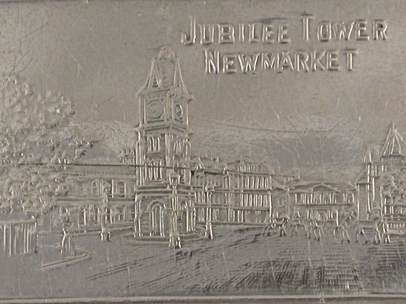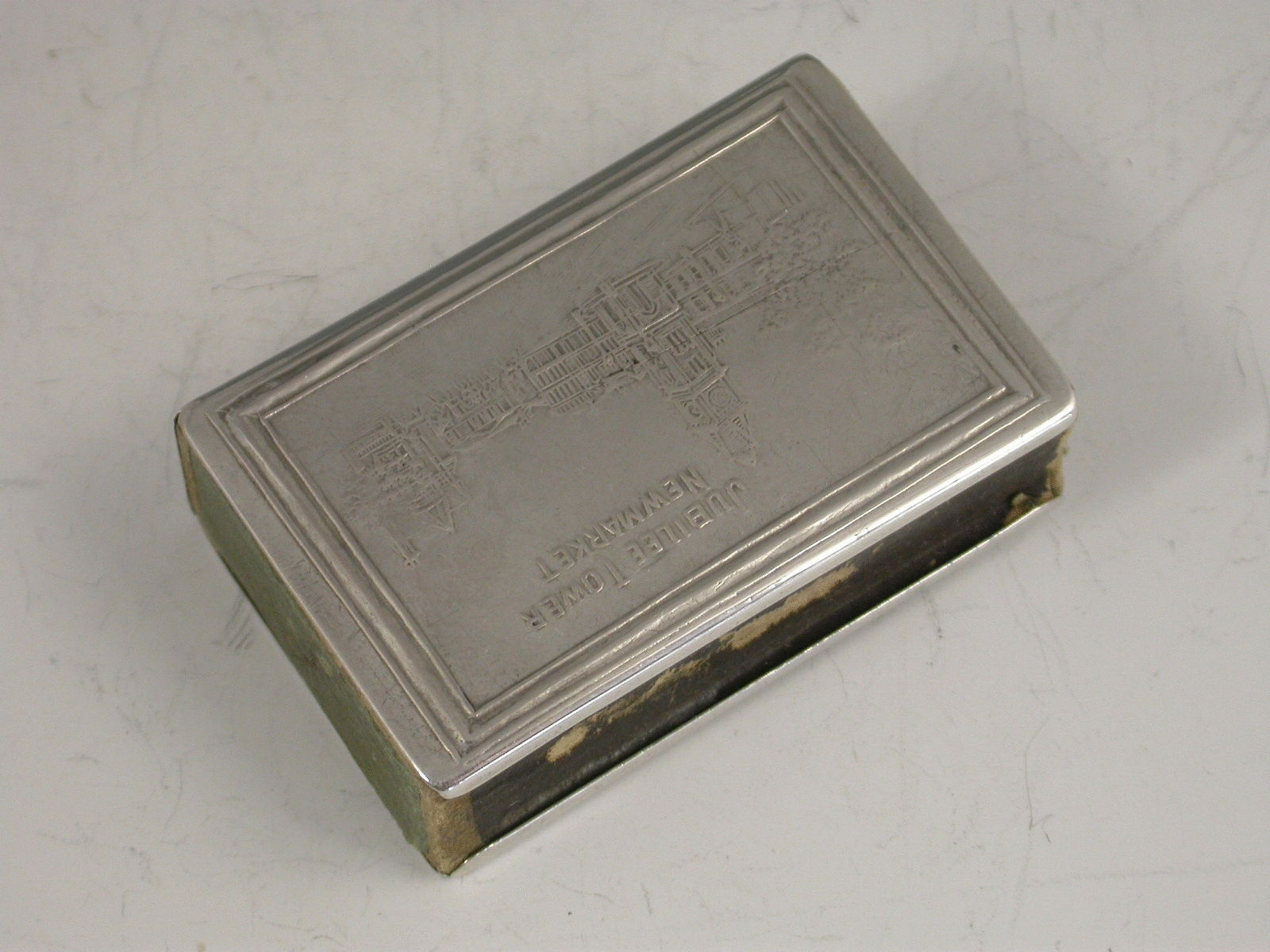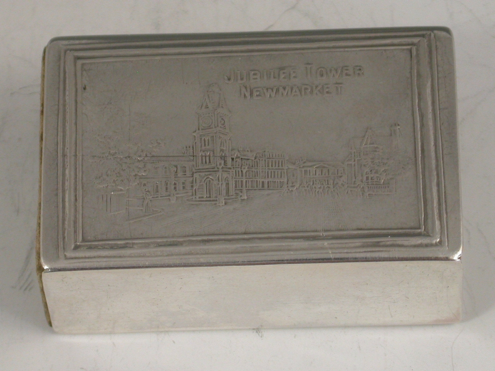 A rare early Edwardian silver “Castle Top” Matchbox Cover of plain sprung rectangular form, the cover with stamped and raised view depicting The Jubilee Tower, Newmarket with horses in the square, reeded picture frame border.