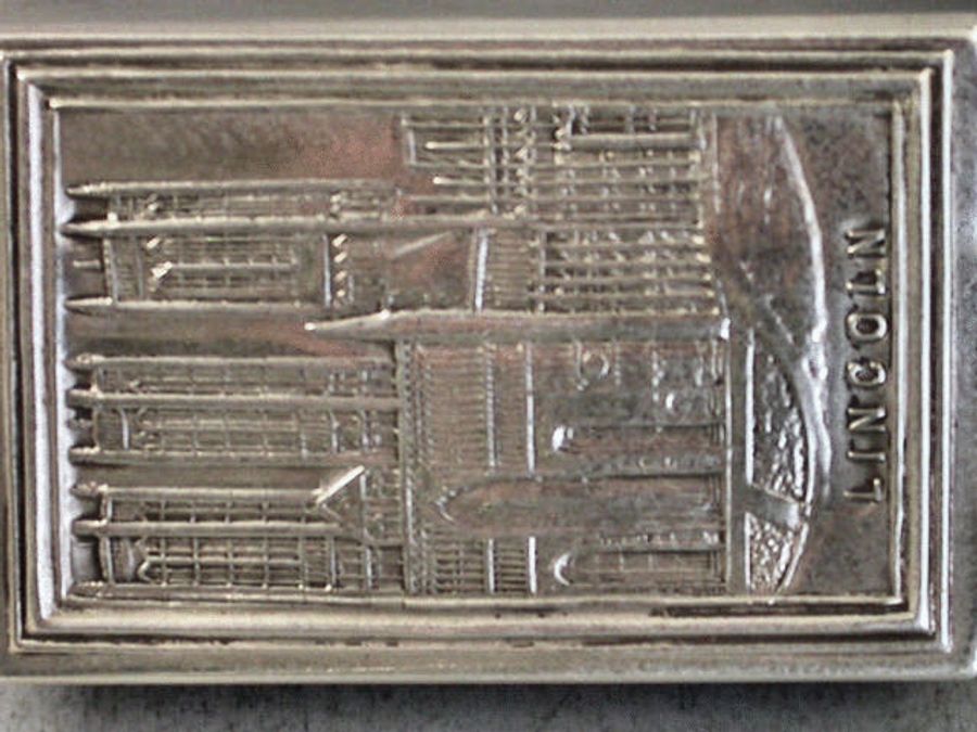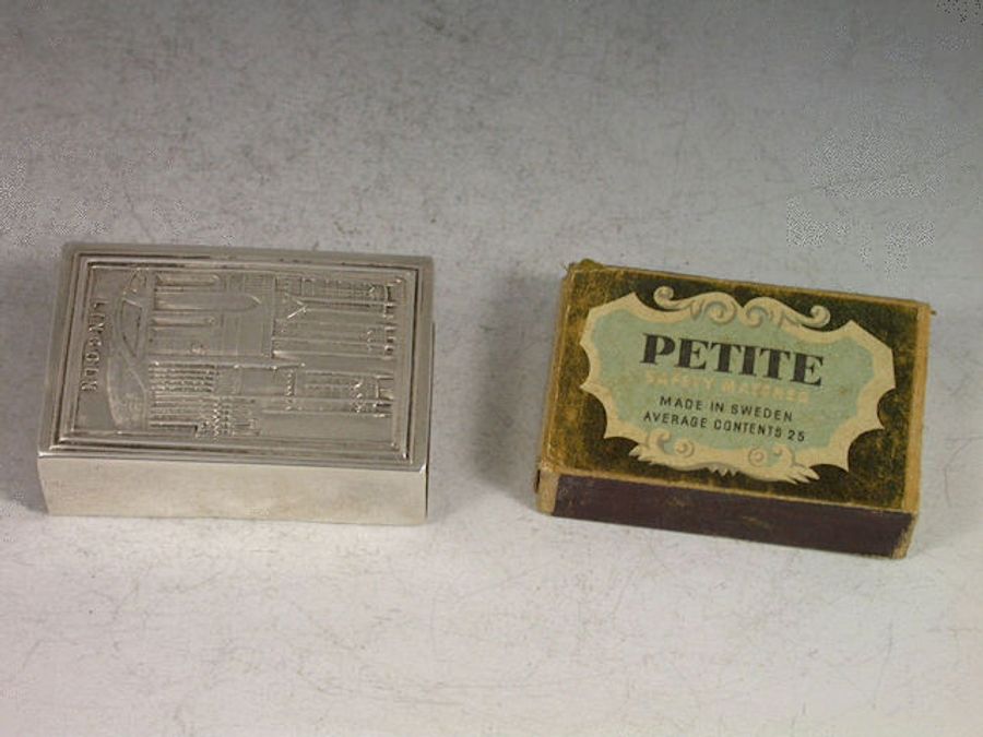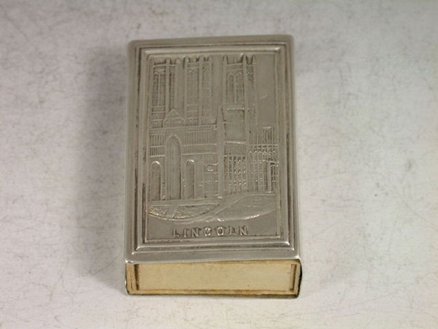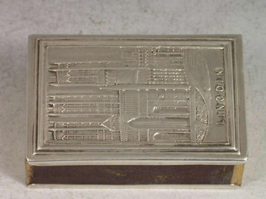 A rare early Edwardian silver “Castle Top” Matchbox Cover of plain sprung rectangular form, the cover with stamped and raised view depicting Lincoln Cathedral, with reeded picture frame border.