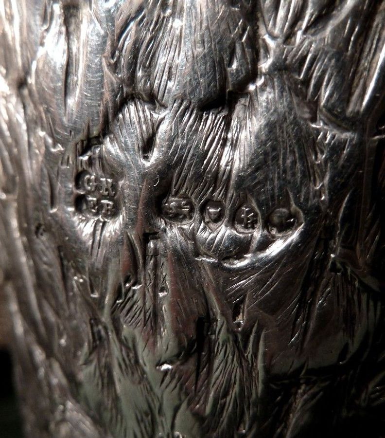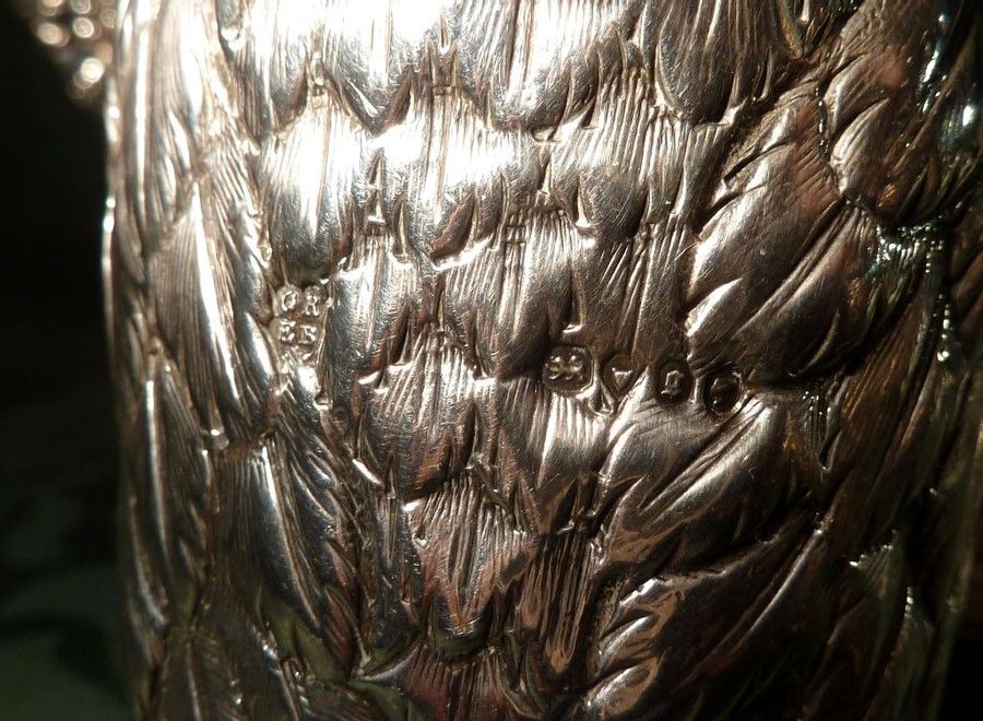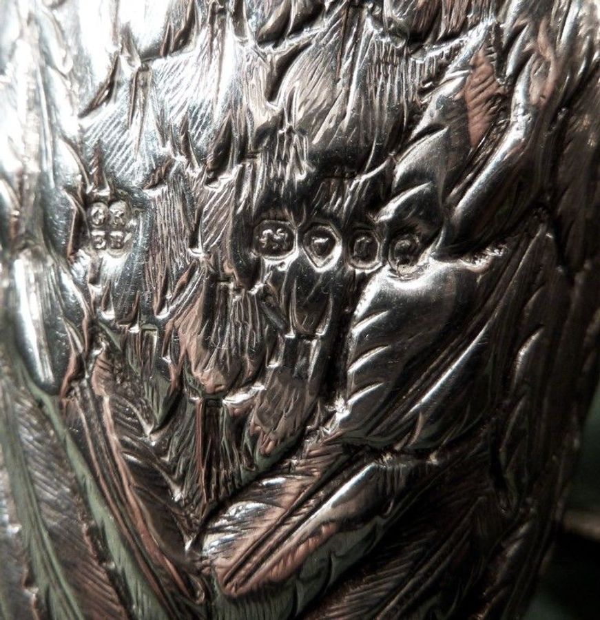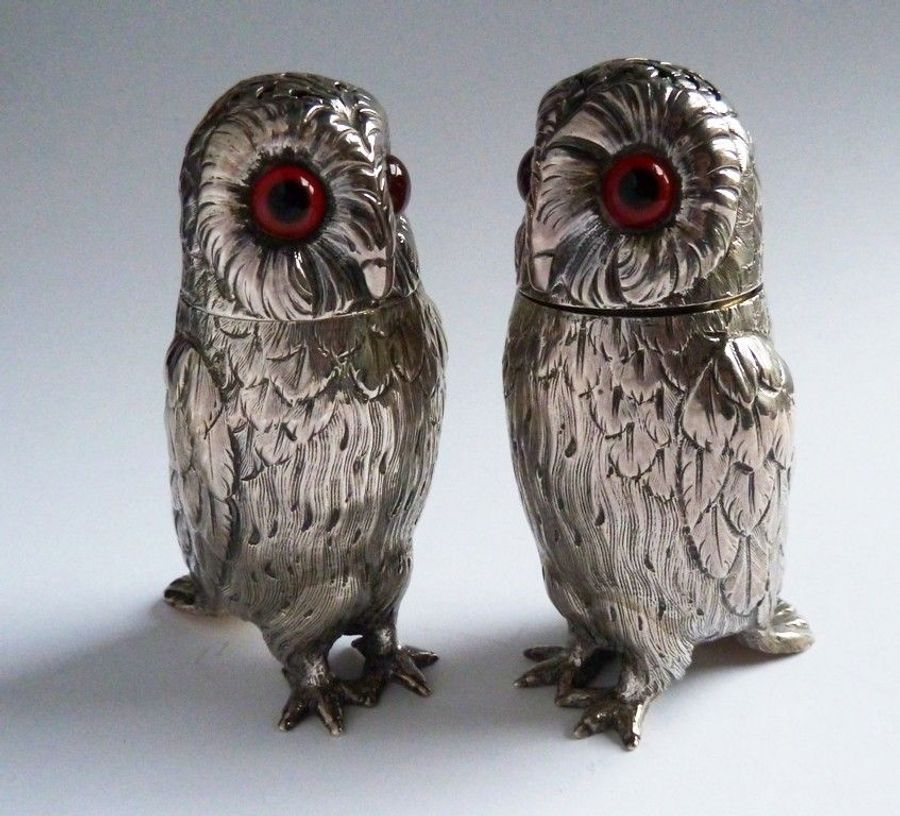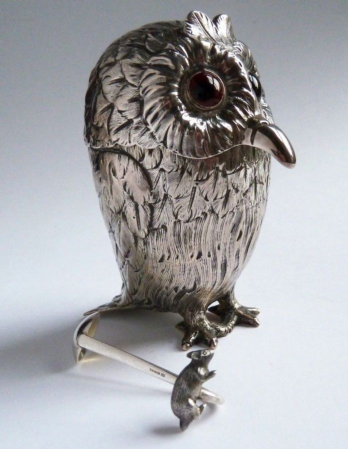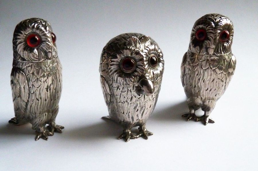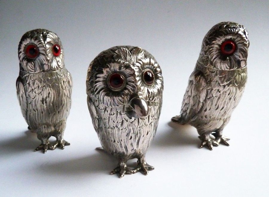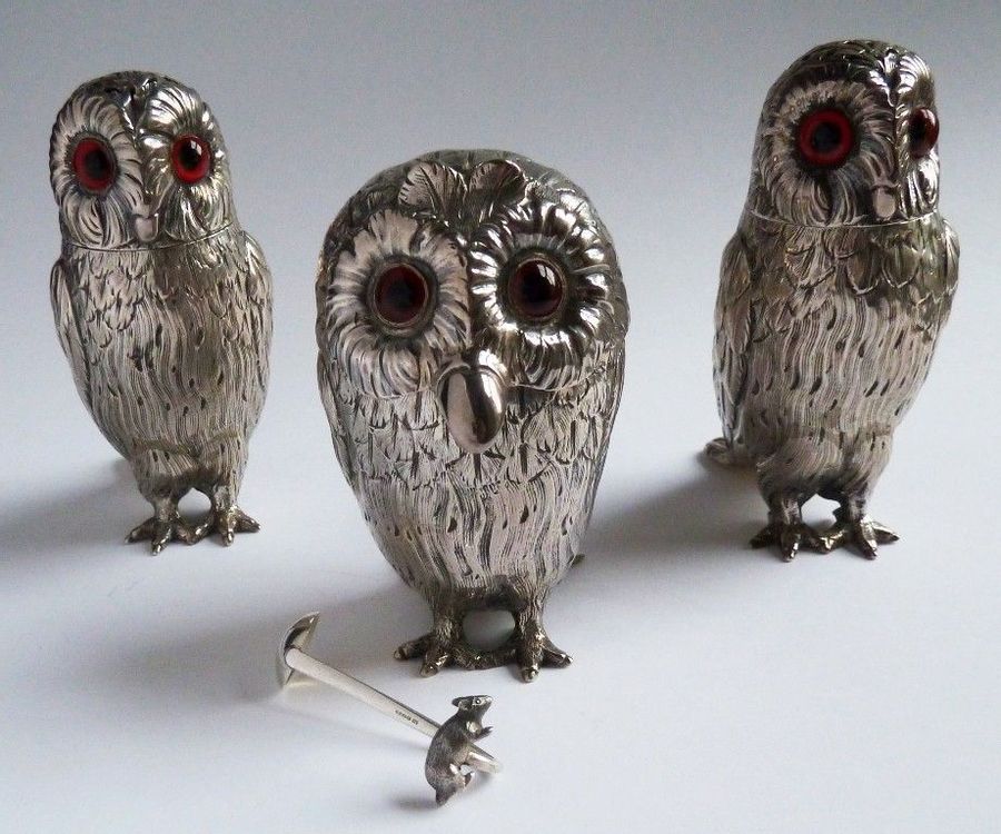 A very fine garniture or matched set of three Victorian silver Condiments, made in the form of Owls, consisting of a pair of Peppers and a Mustard Pot with associated modern silver Spoon with mouse terminal. Amber glass eyes.