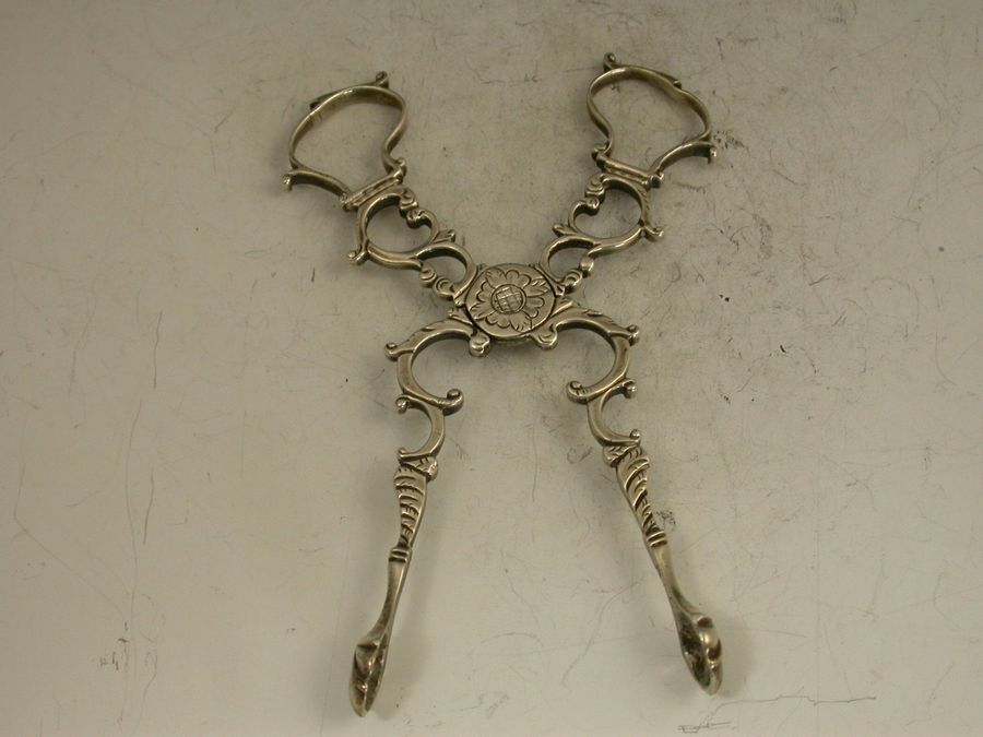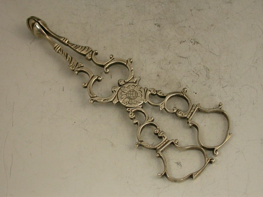 A good pair of mid 18th century Irish silver Sugar Nips of rococo scroll form with shaped finger rings and flower engraved hinge.