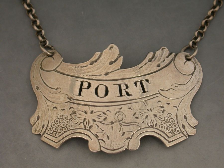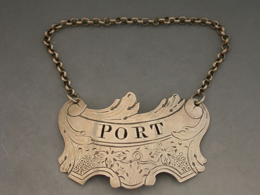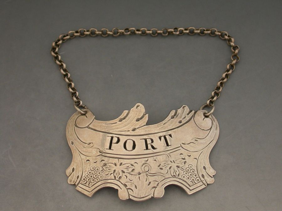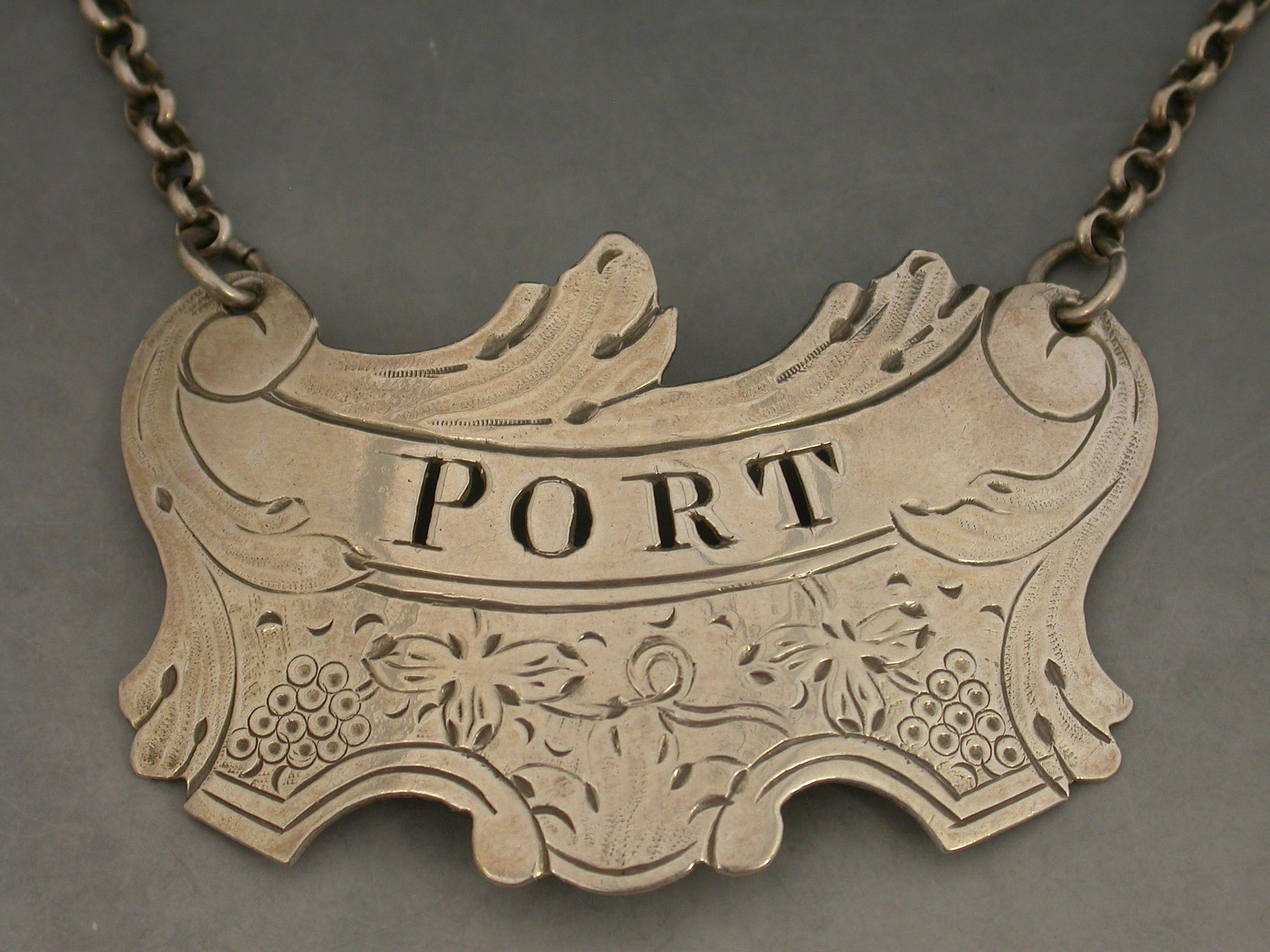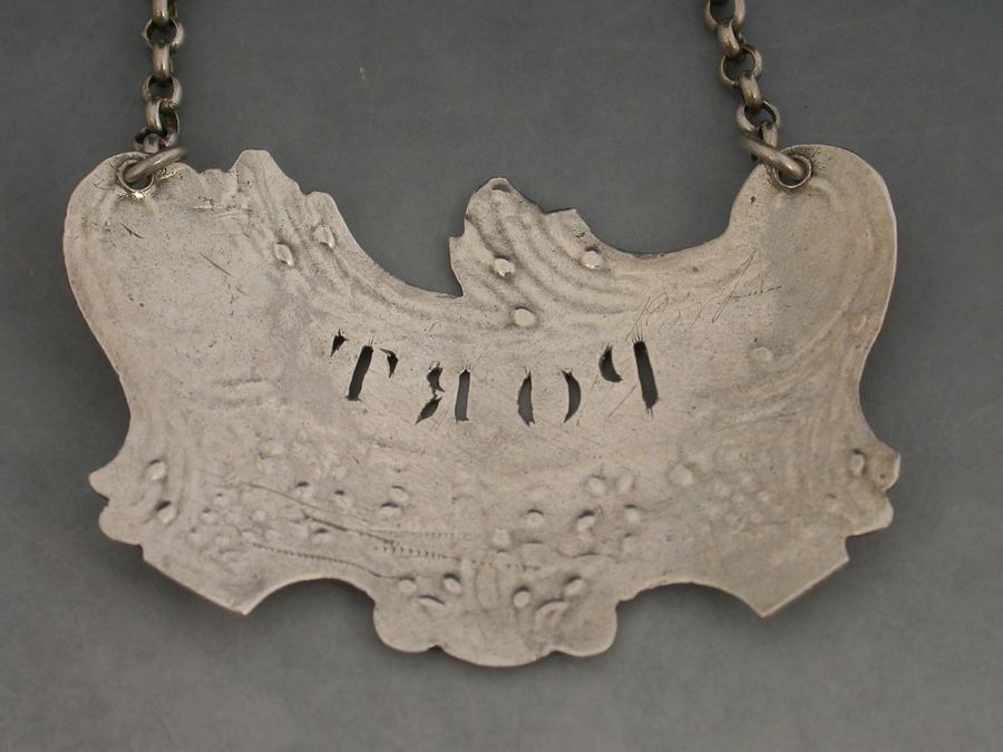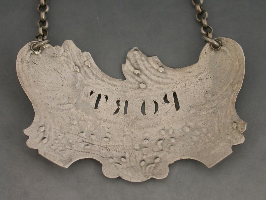 A rare late George II / early George III Provincial silver Wine Label of ""quiffed escutcheon"" form, the engraved Rococo style shape and decoration possibly inspired by the waves of the sea. Pierced for Port.