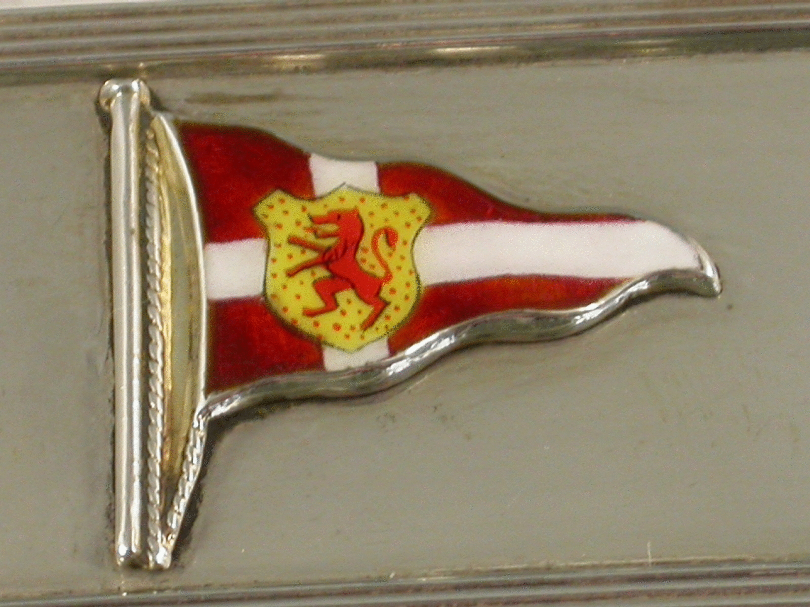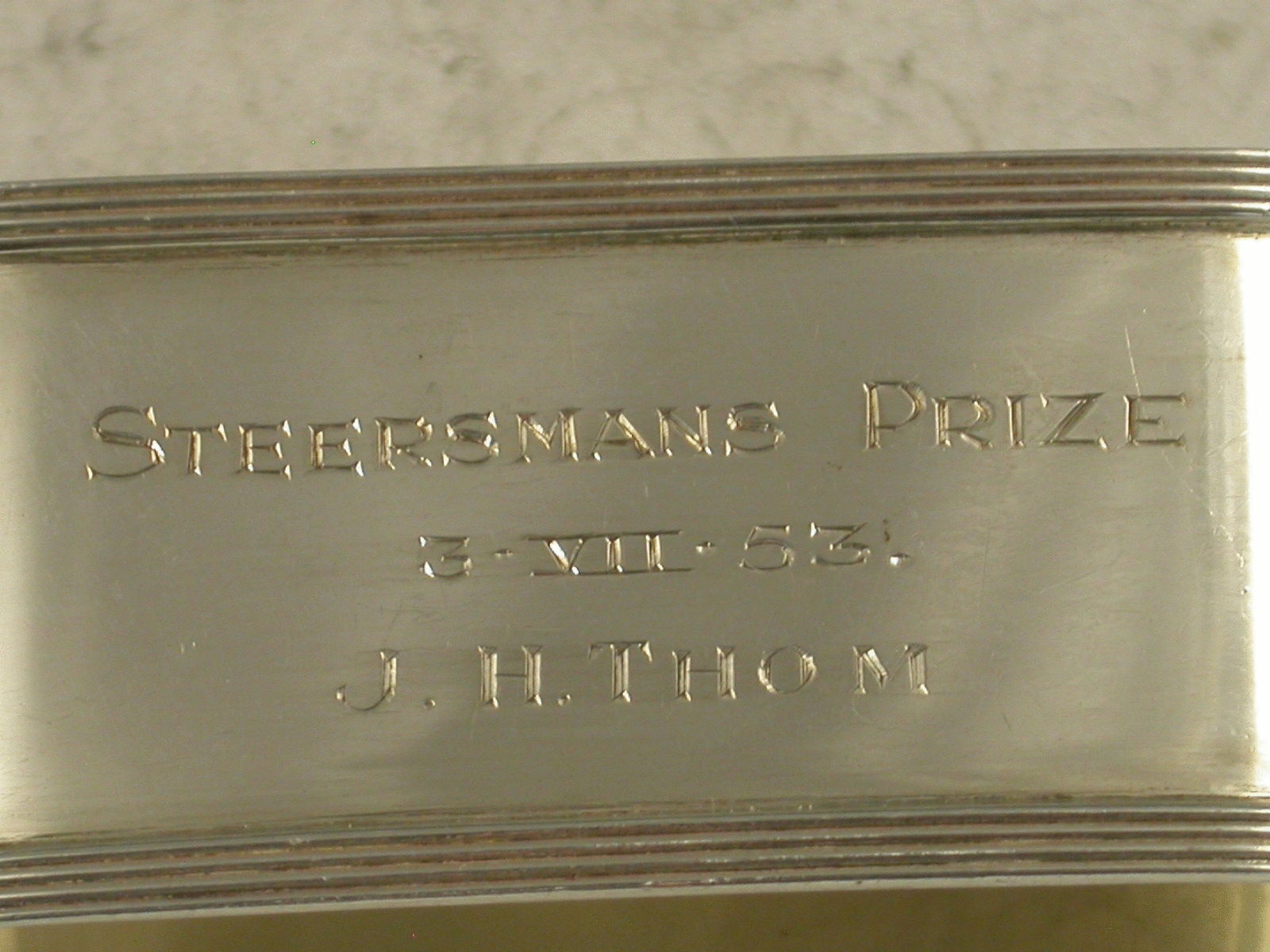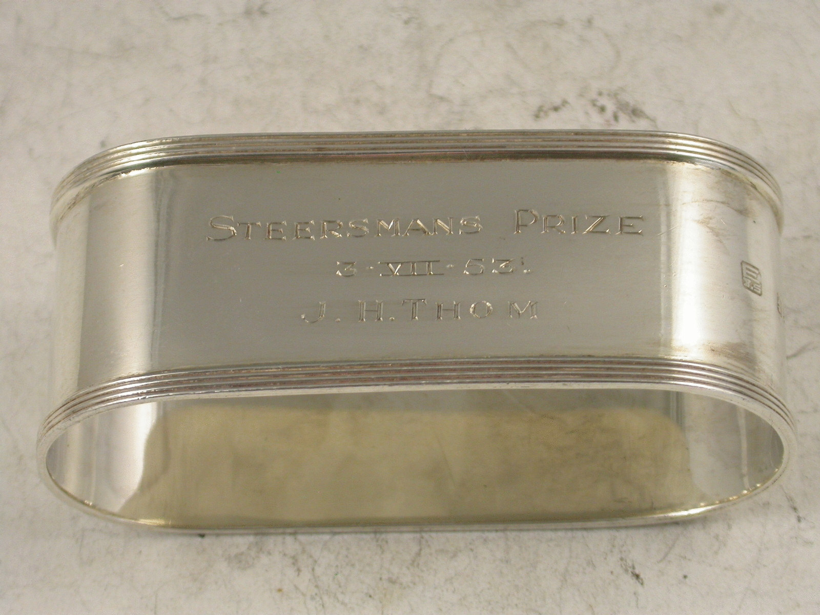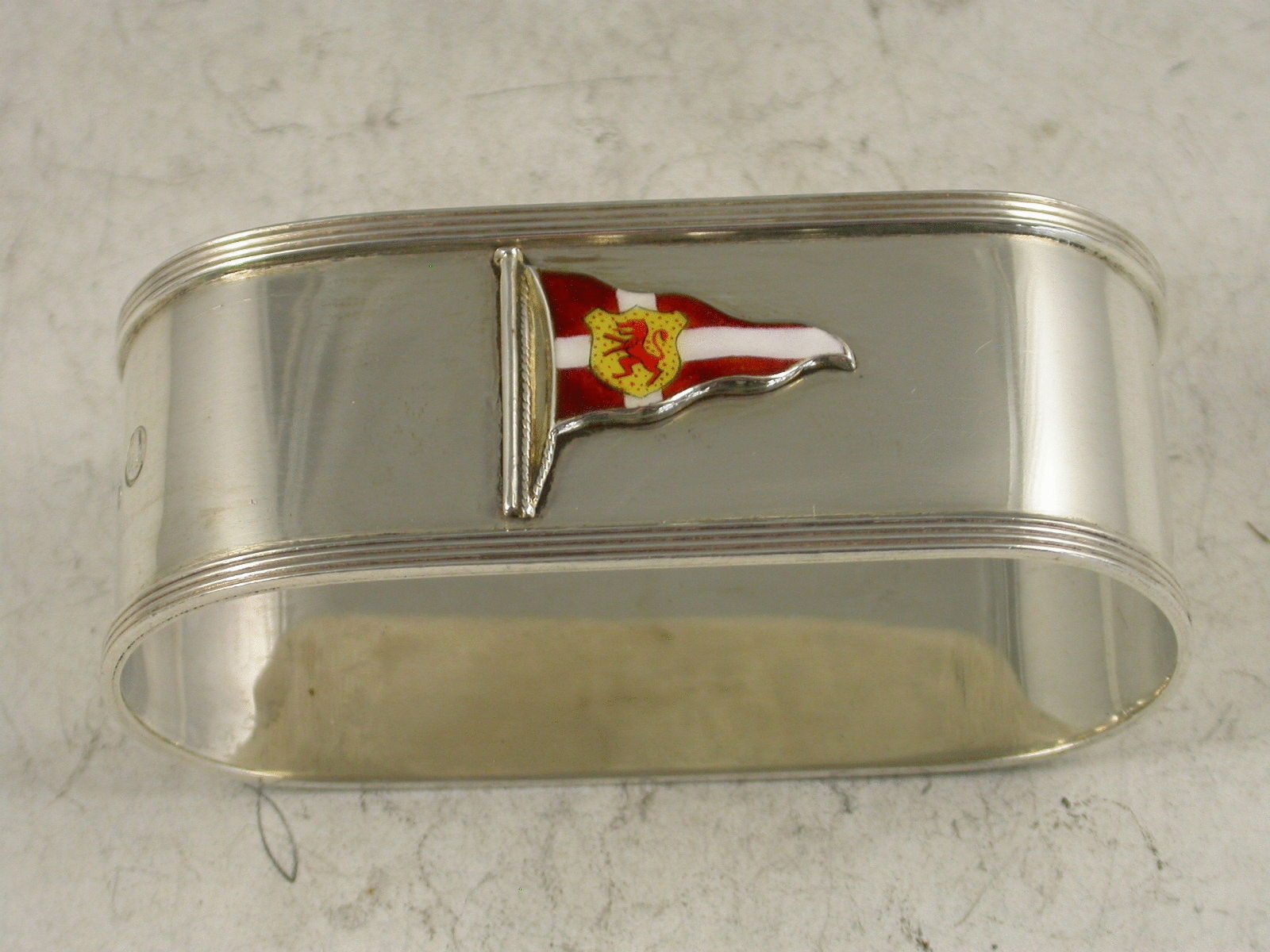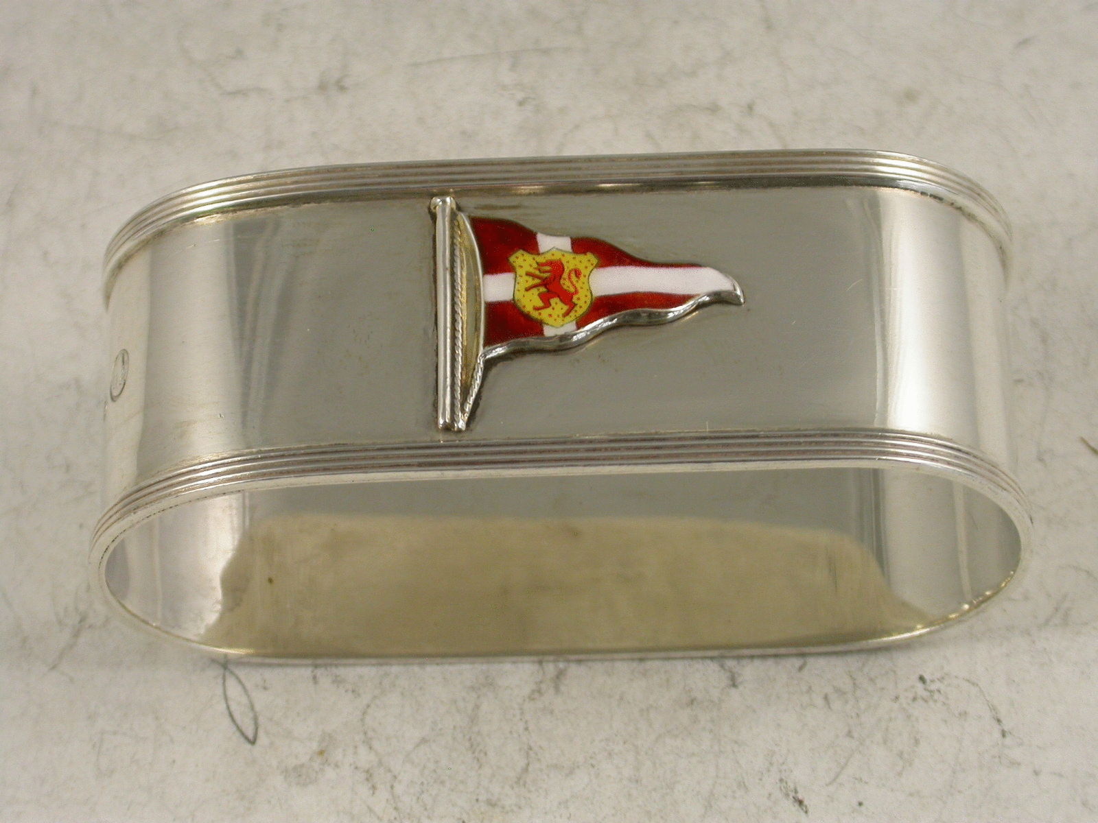 A nice quality mid 20th century silver Prize Napkin Ring of elongated oval form with raised reeded borders, the front applied with an enamel pennant of the Clyde Corinthian Yacht Club. The reverse engraved : Steermans Prize 3.VII.53. J.H.Thom.