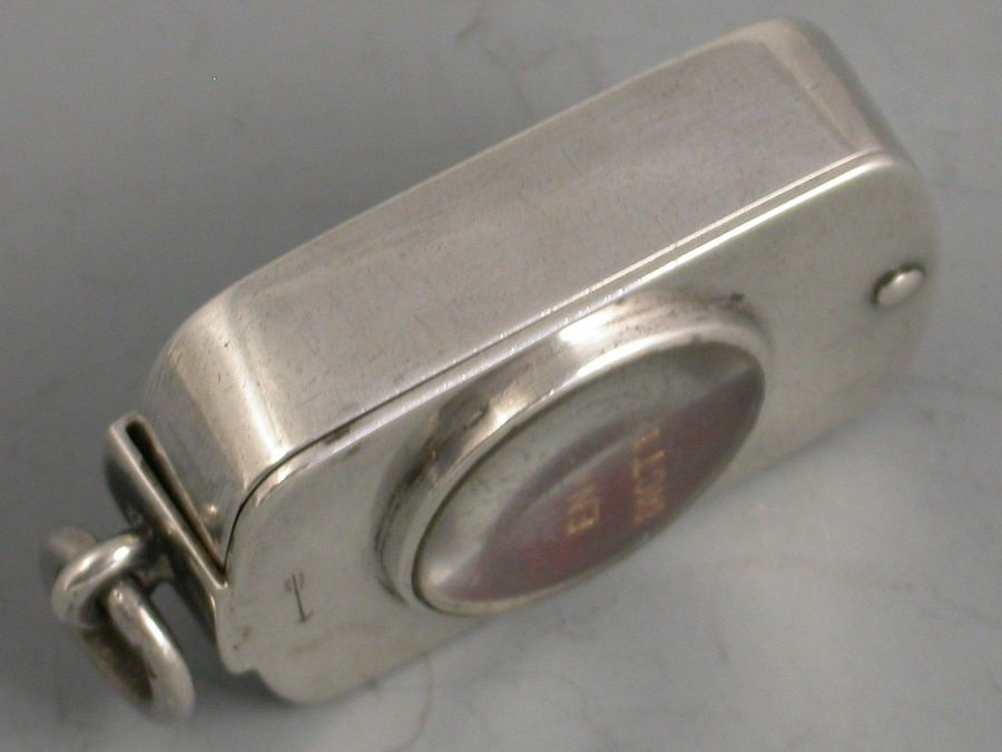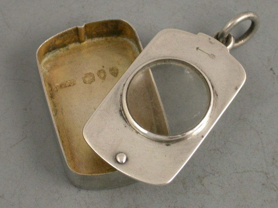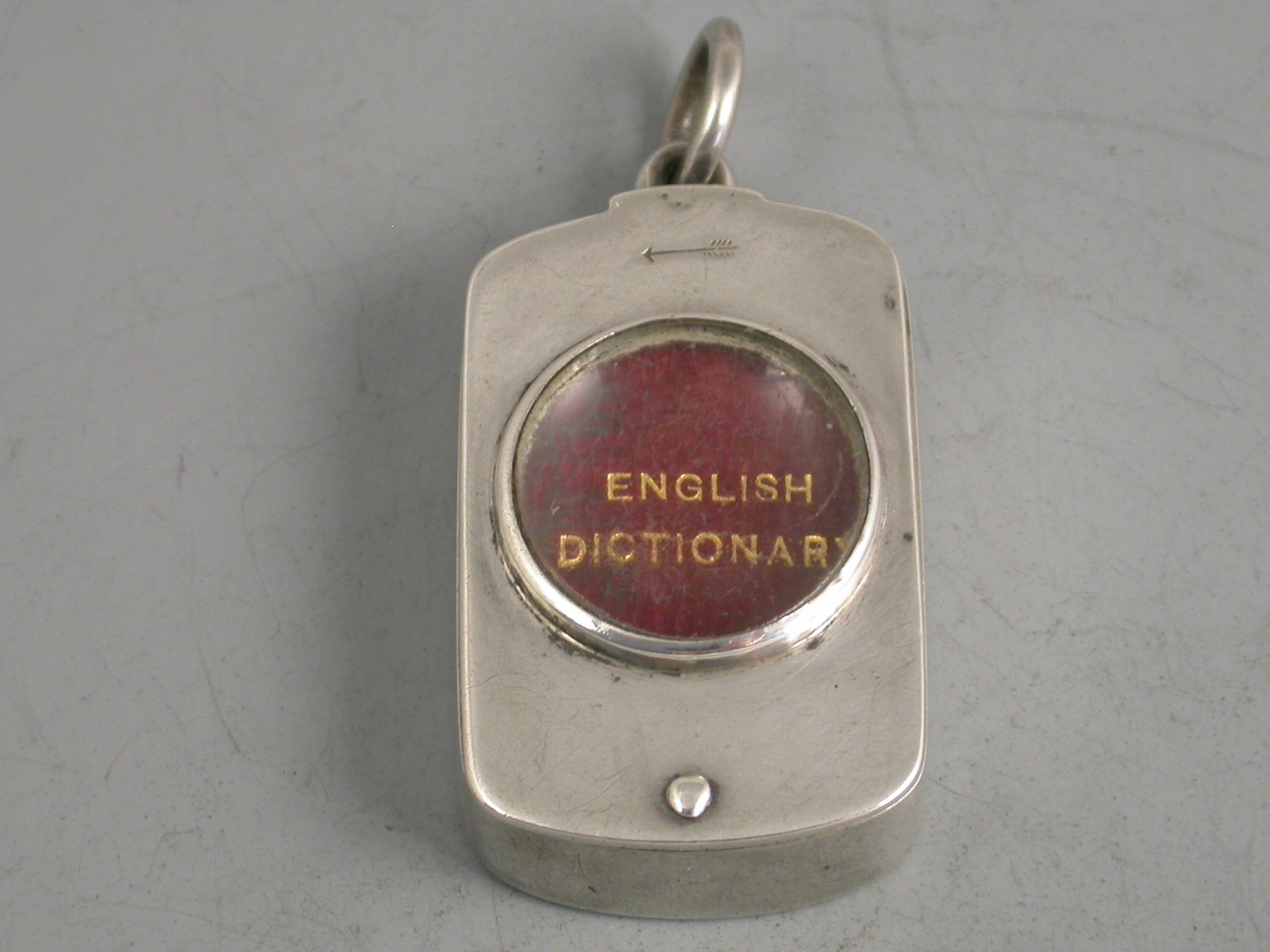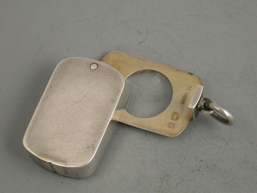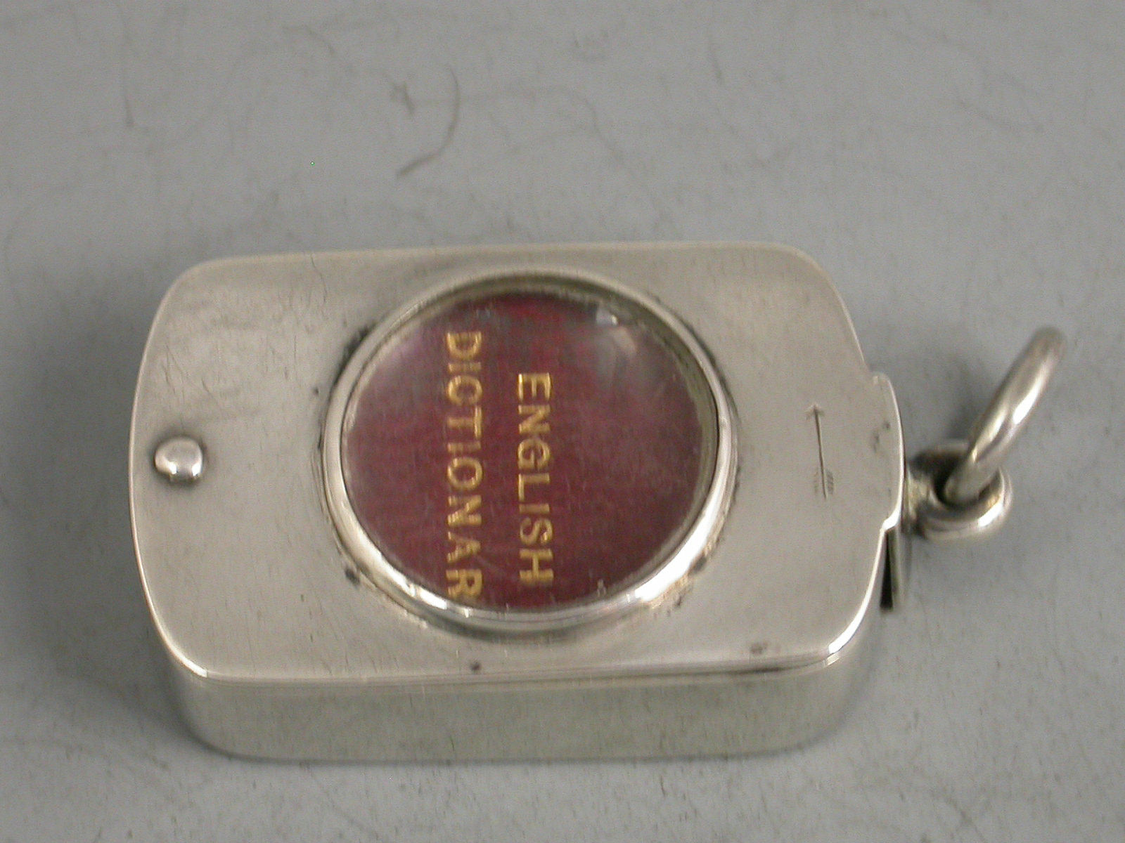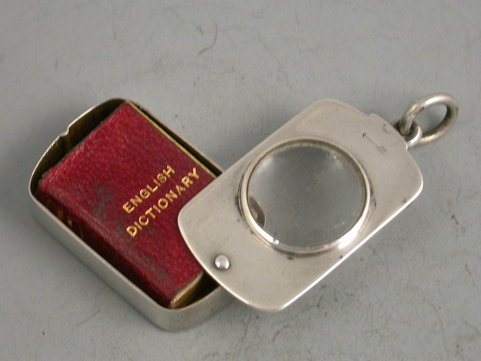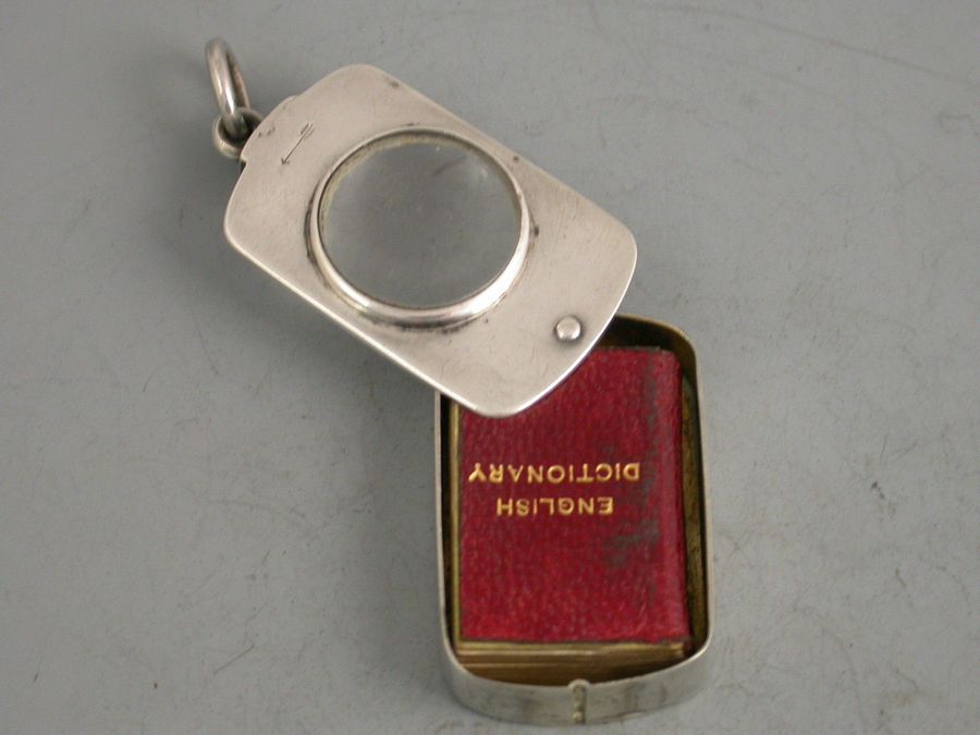 A rare Victorian silver Case of rounded oblong form with pinned swivelling opening mechanism and inset with a magnifying glass to the lid, the silver gilt interior containing an original miniature English Dictionary with red leather cover and gilt lettering. The text requiring the magnifying glass to be read.