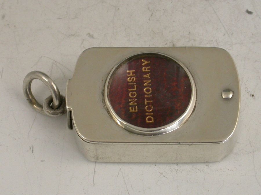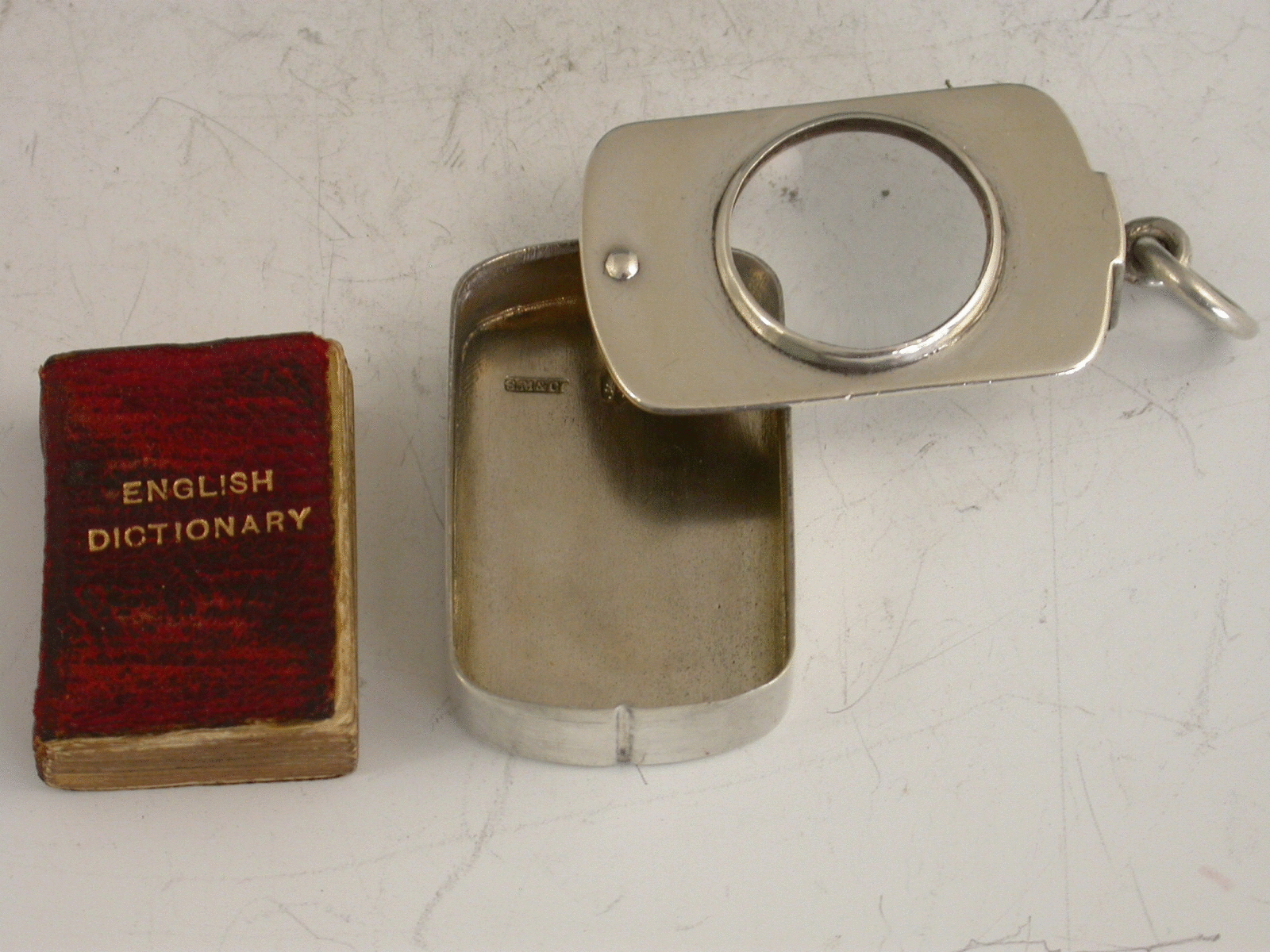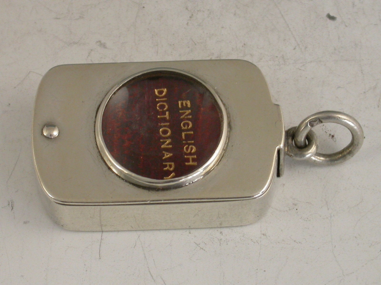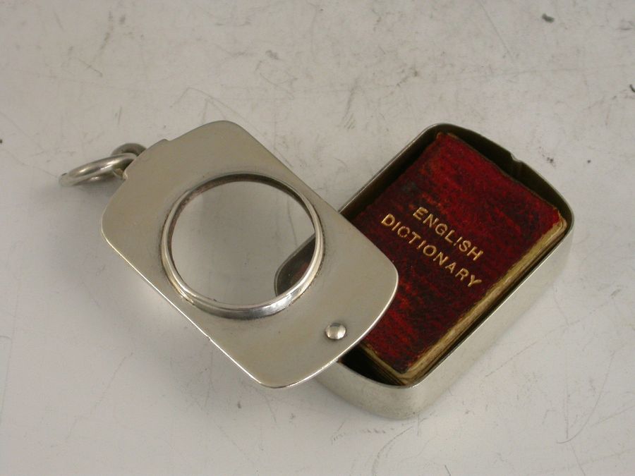 A rare Victorian silver Case with magnifying glass to lid, of rounded oblong form with pinned swivel opening mechanism, containing an original BRYCE’S ENGLISH DICTIONARY with red leather cover and gilt lettering. The text requiring the magnifying glass to be read.