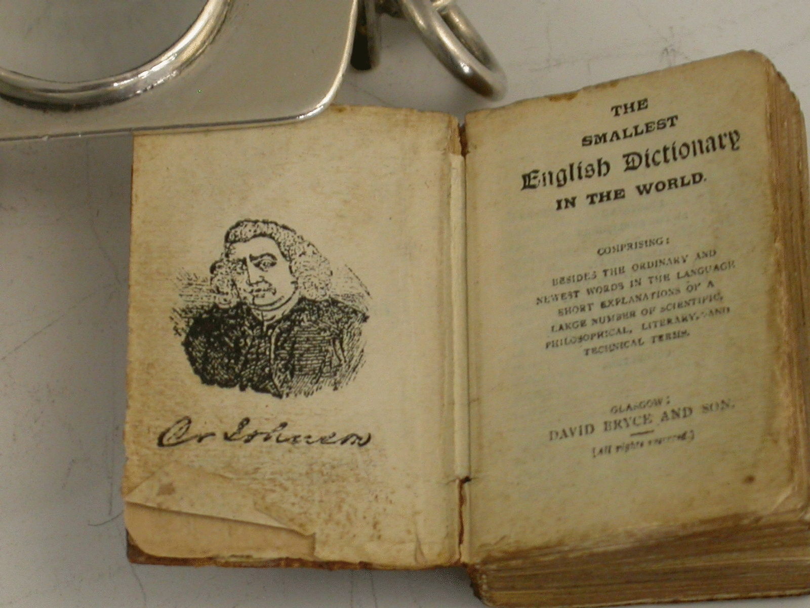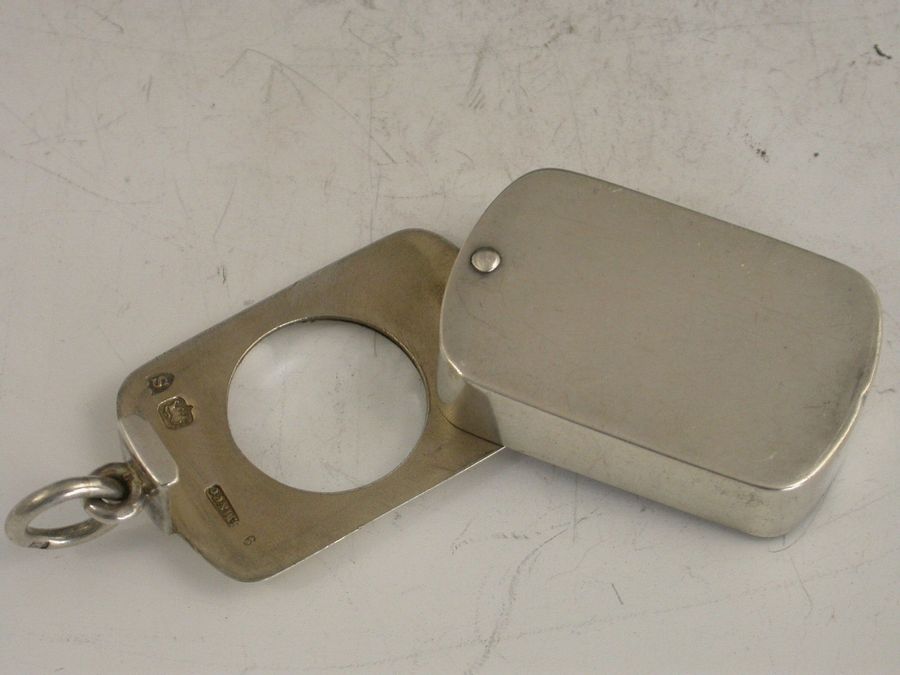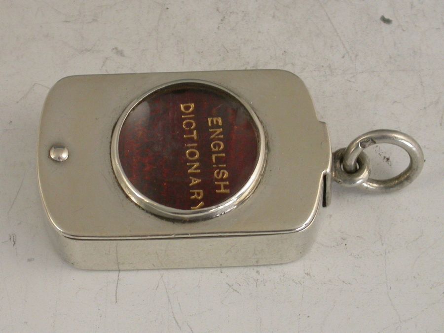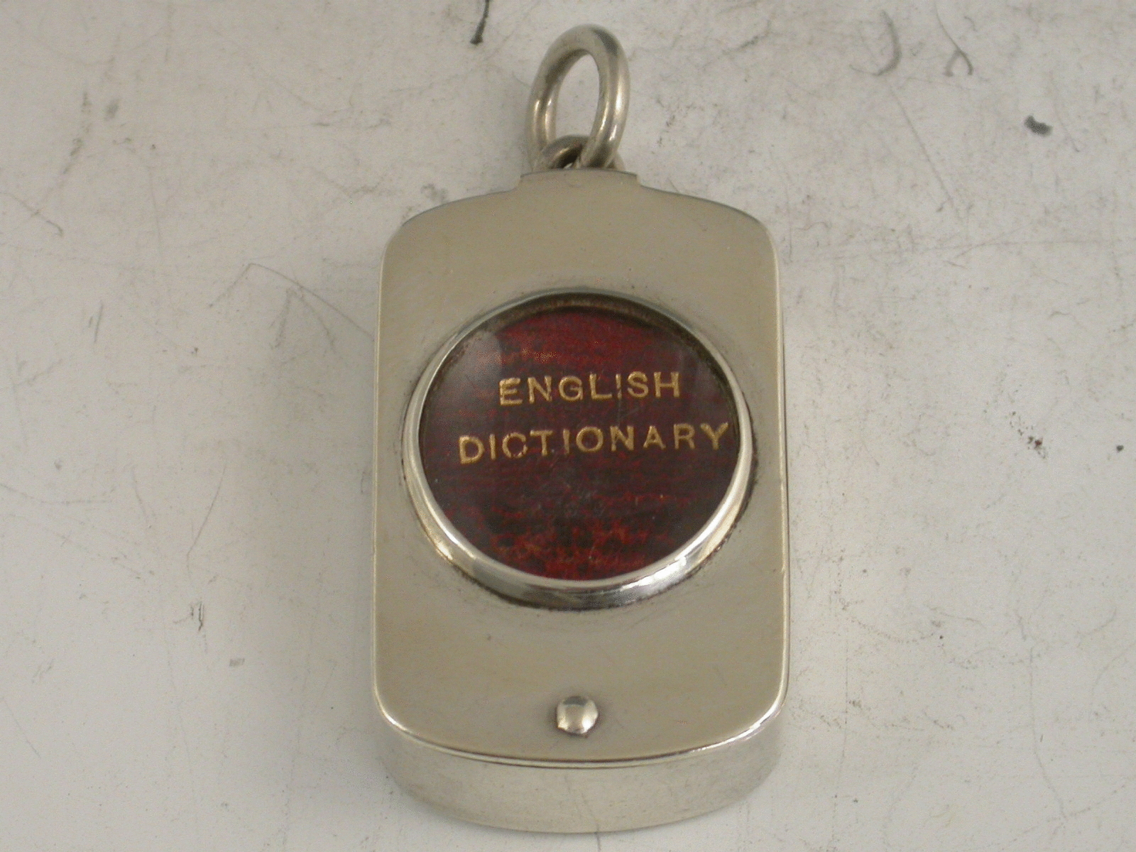 A rare Victorian silver Case with magnifying glass to lid, of rounded oblong form with pinned swivel opening mechanism, containing an original BRYCE’S ENGLISH DICTIONARY with red leather cover and gilt lettering. The text requiring the magnifying glass to be read.