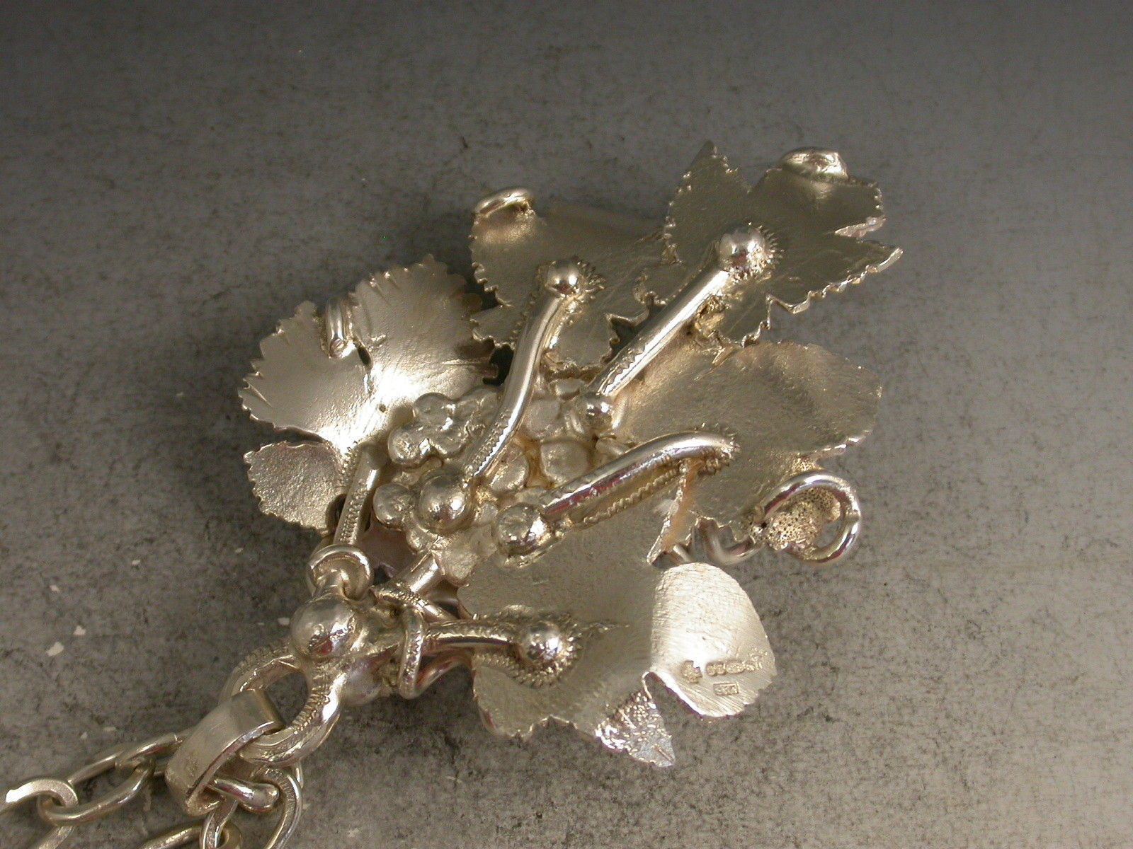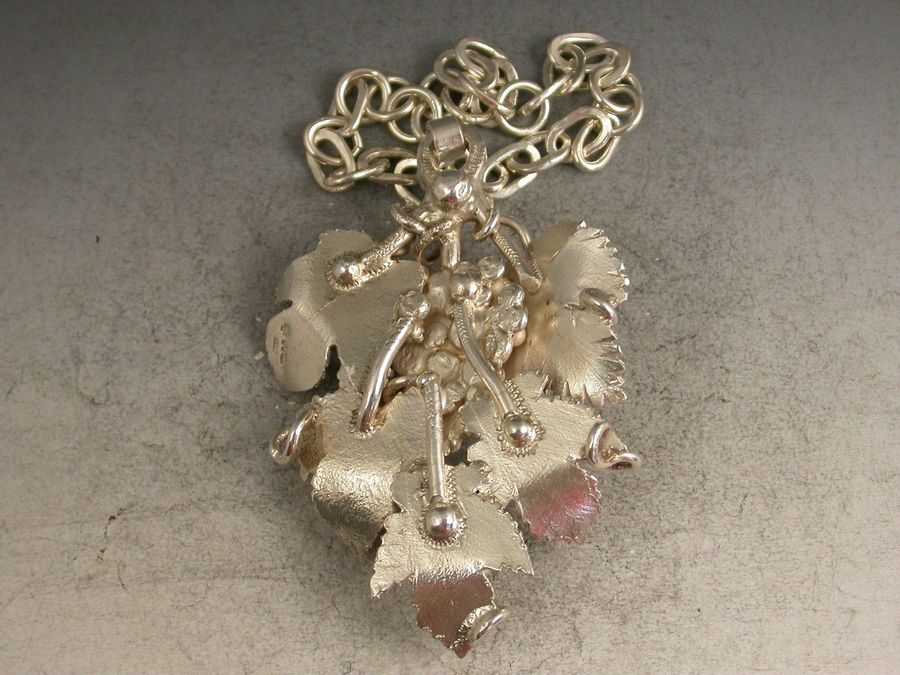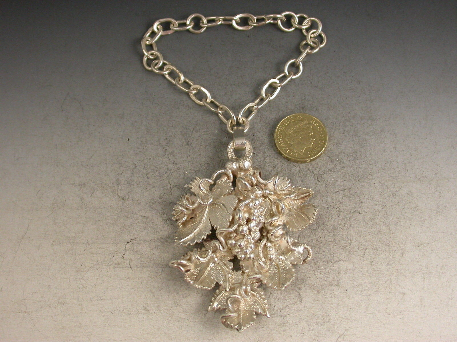 A large and substantial modern contemporary cast silver Decanter Label elaborately formed from conjoined vine leaves with twisted tendrils surrounding a central bunch of grapes. Complete with heavy linked suspension chain.