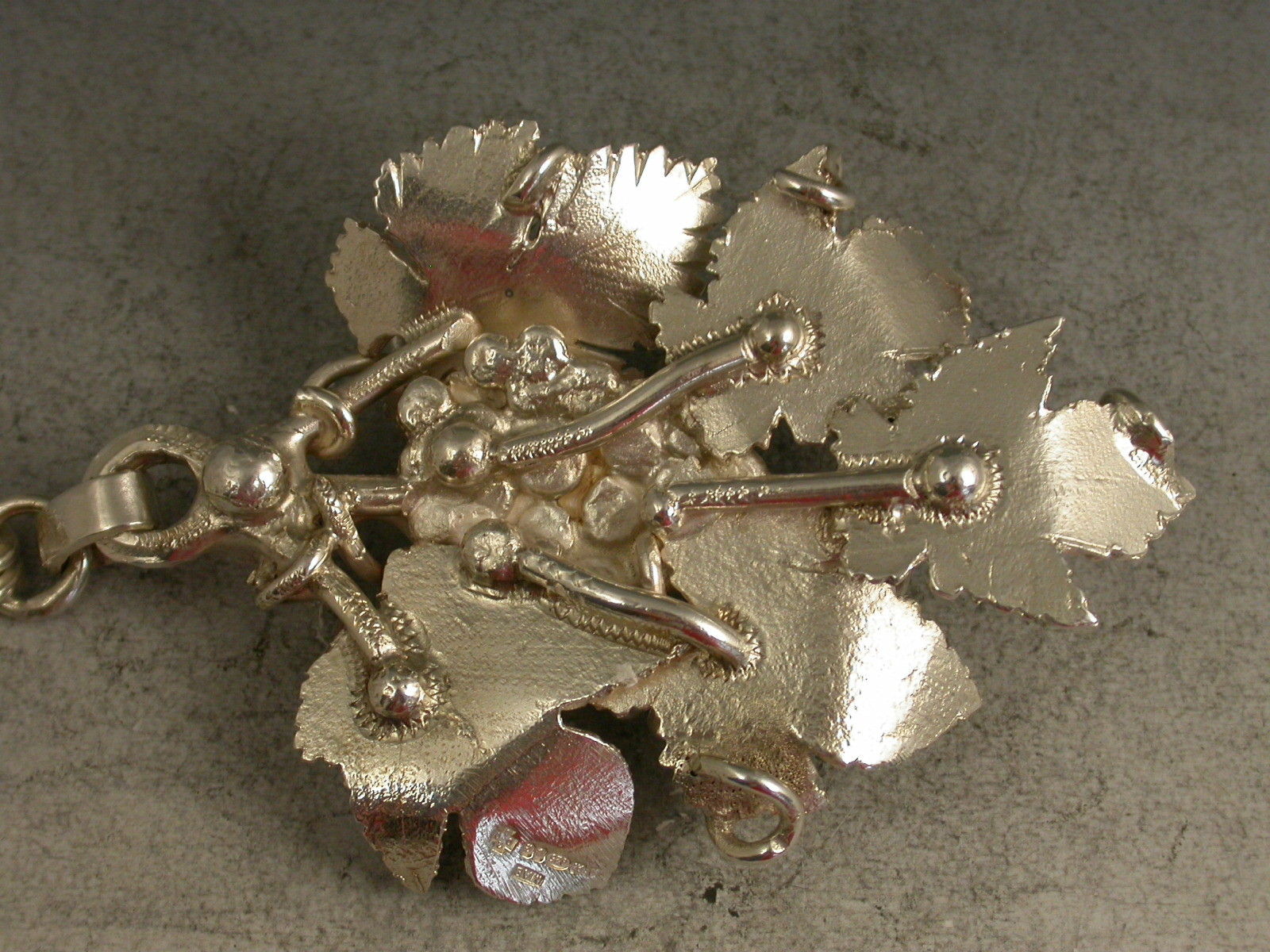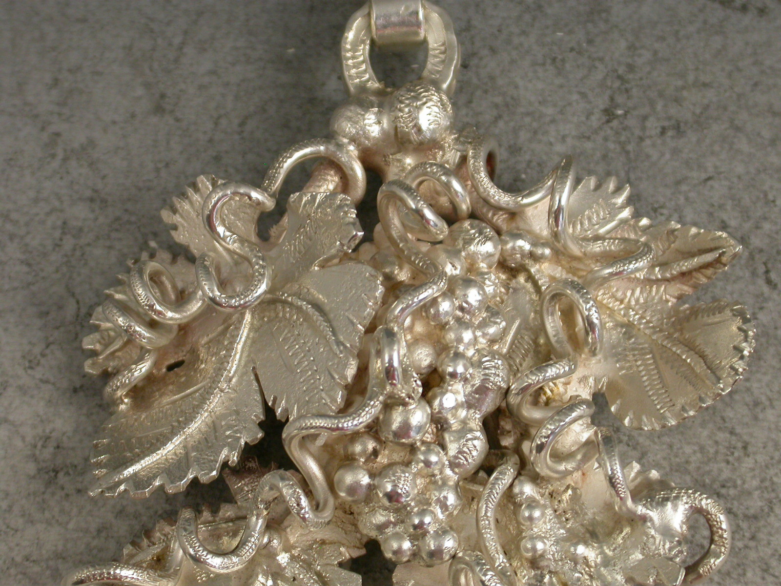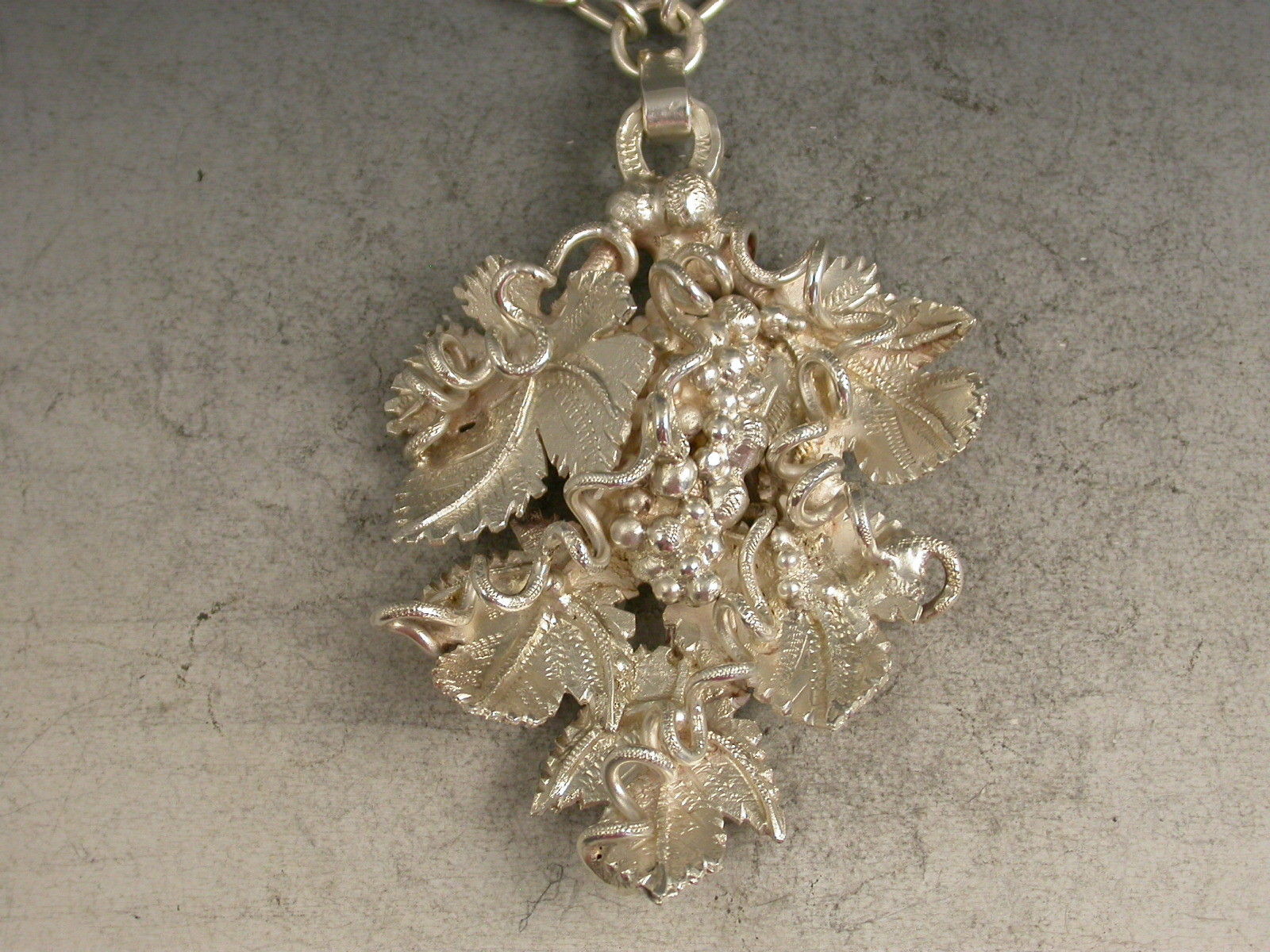 A large and substantial modern contemporary cast silver Decanter Label elaborately formed from conjoined vine leaves with twisted tendrils surrounding a central bunch of grapes. Complete with heavy linked suspension chain.