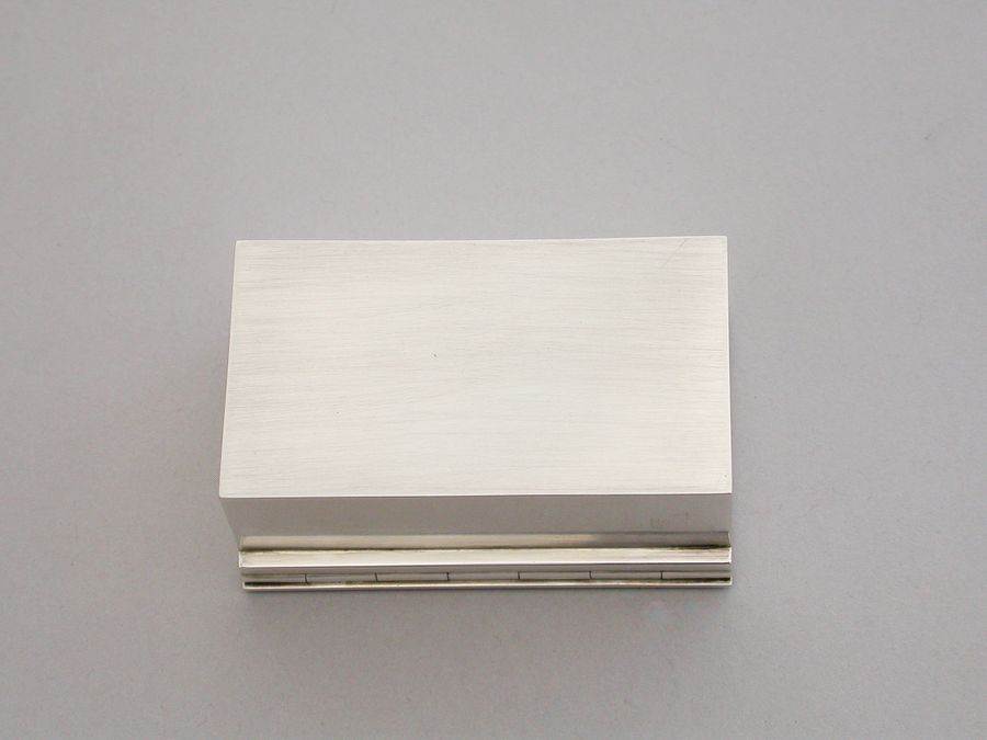 A modern Limited Edition silver double Stamp Box of plain rectangular form, the cover with applied facsimile of a Penny Black Stamp, the hinged lid opening to twin compartments with sloped bases and engraved, "Stamp Box Society, 1990, Commemorating the 150th Anniversary of the Penny Black, Limited Edition No 21/40".