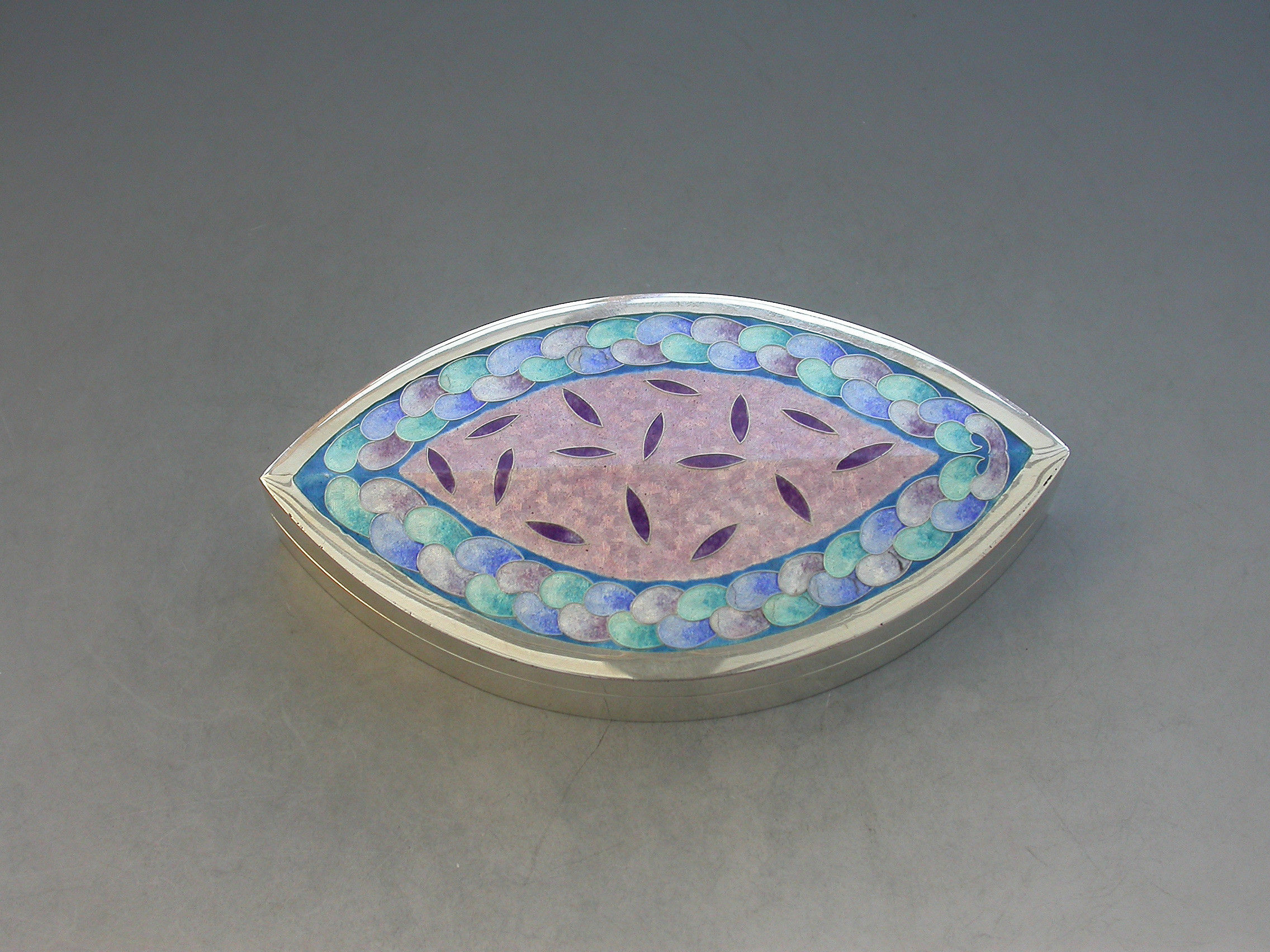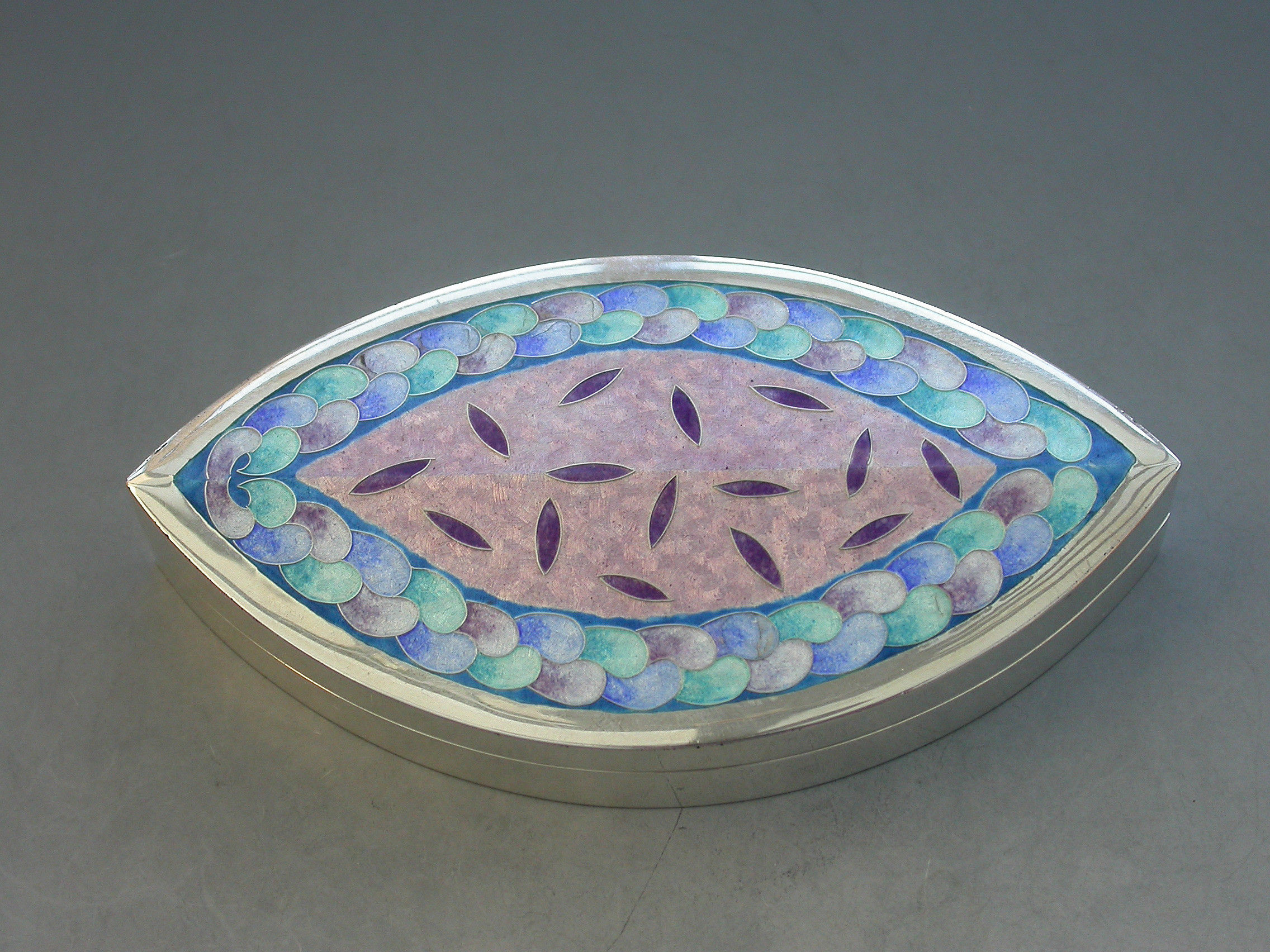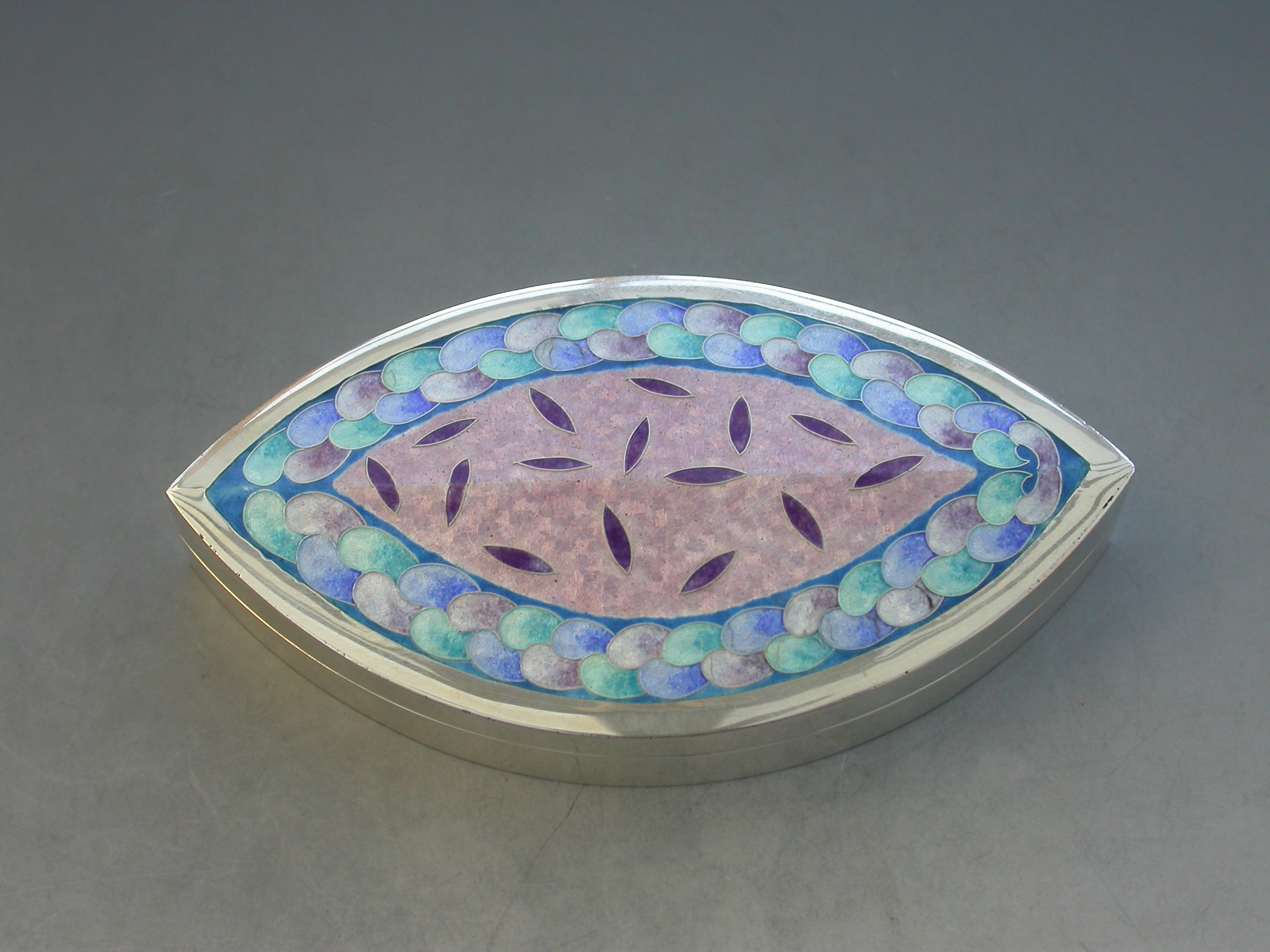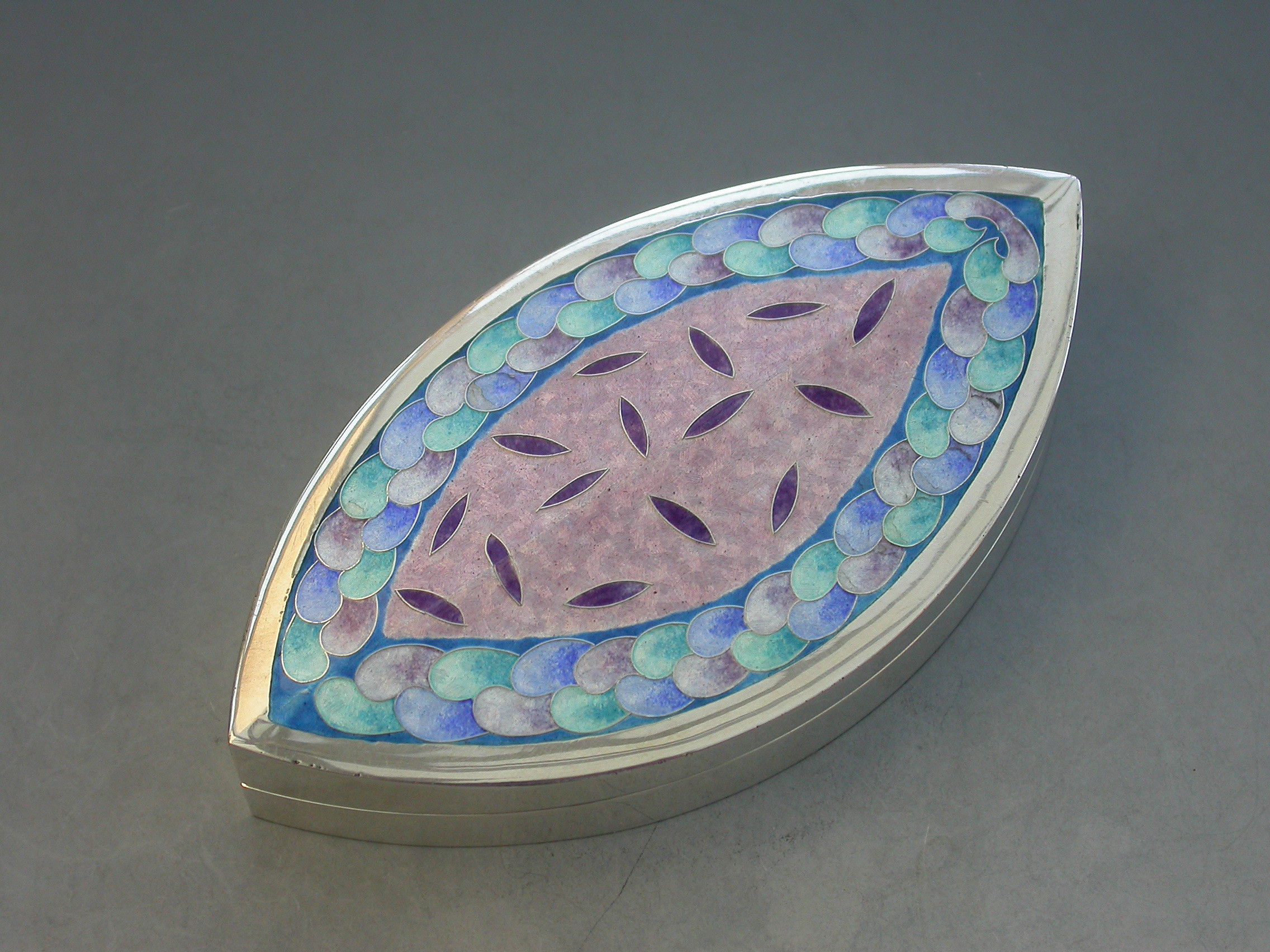A very fine and heavy quality boat shaped silver box, the cover decorated with pink, blue, green and lilac pastel coloured enamels, by Maureen Edgar.