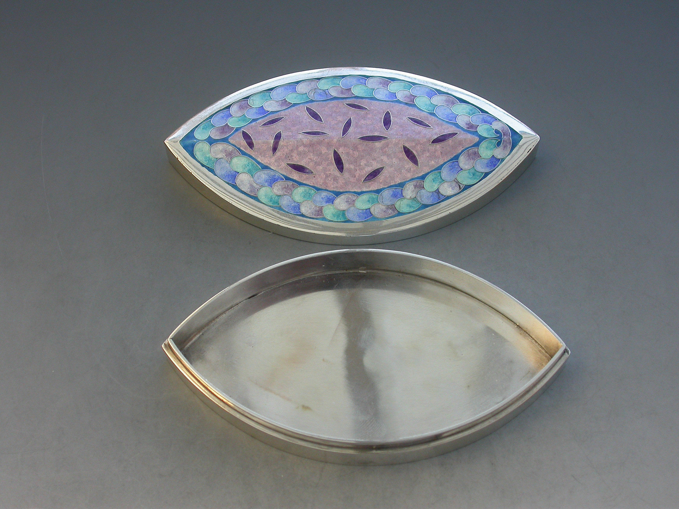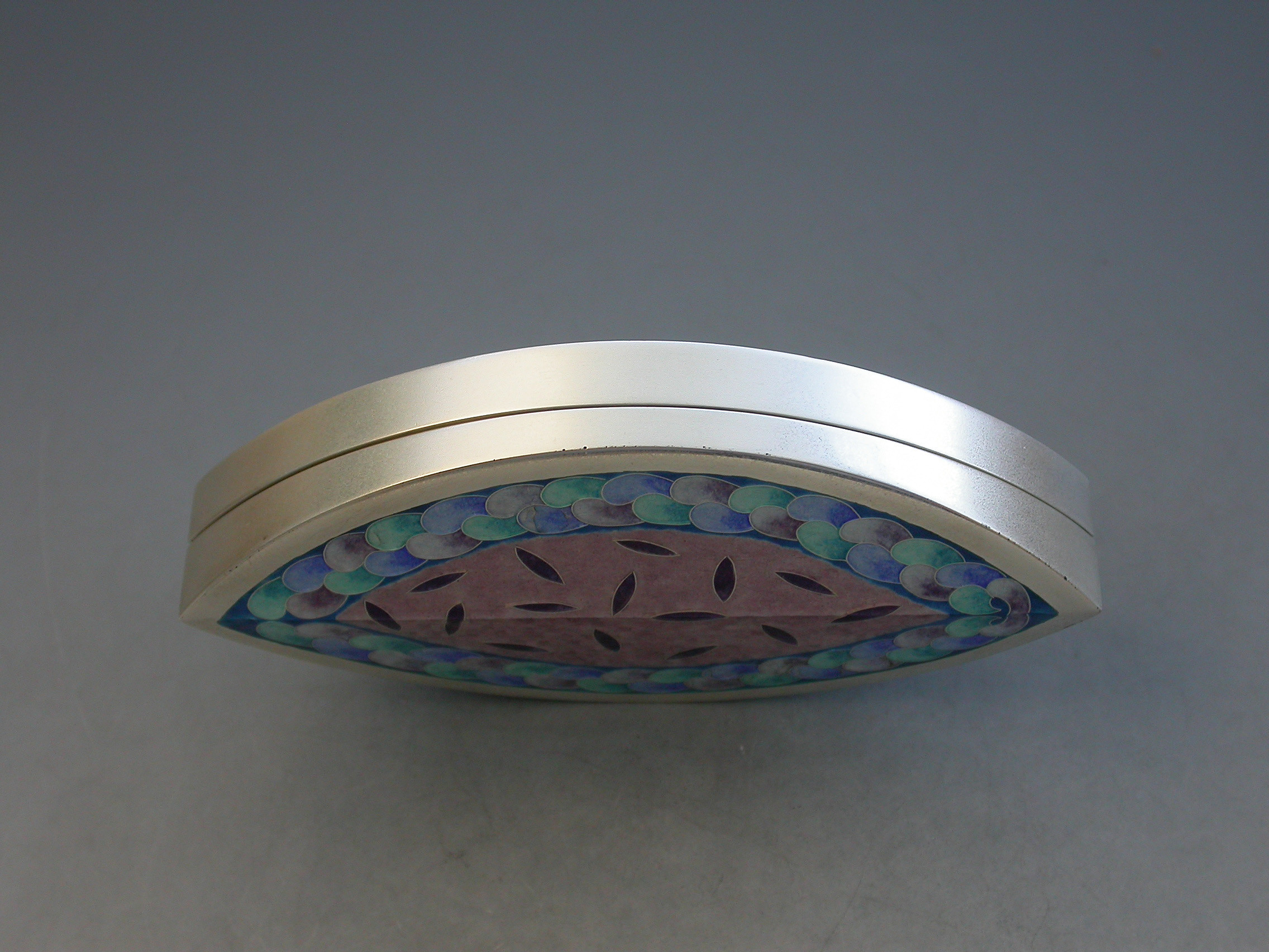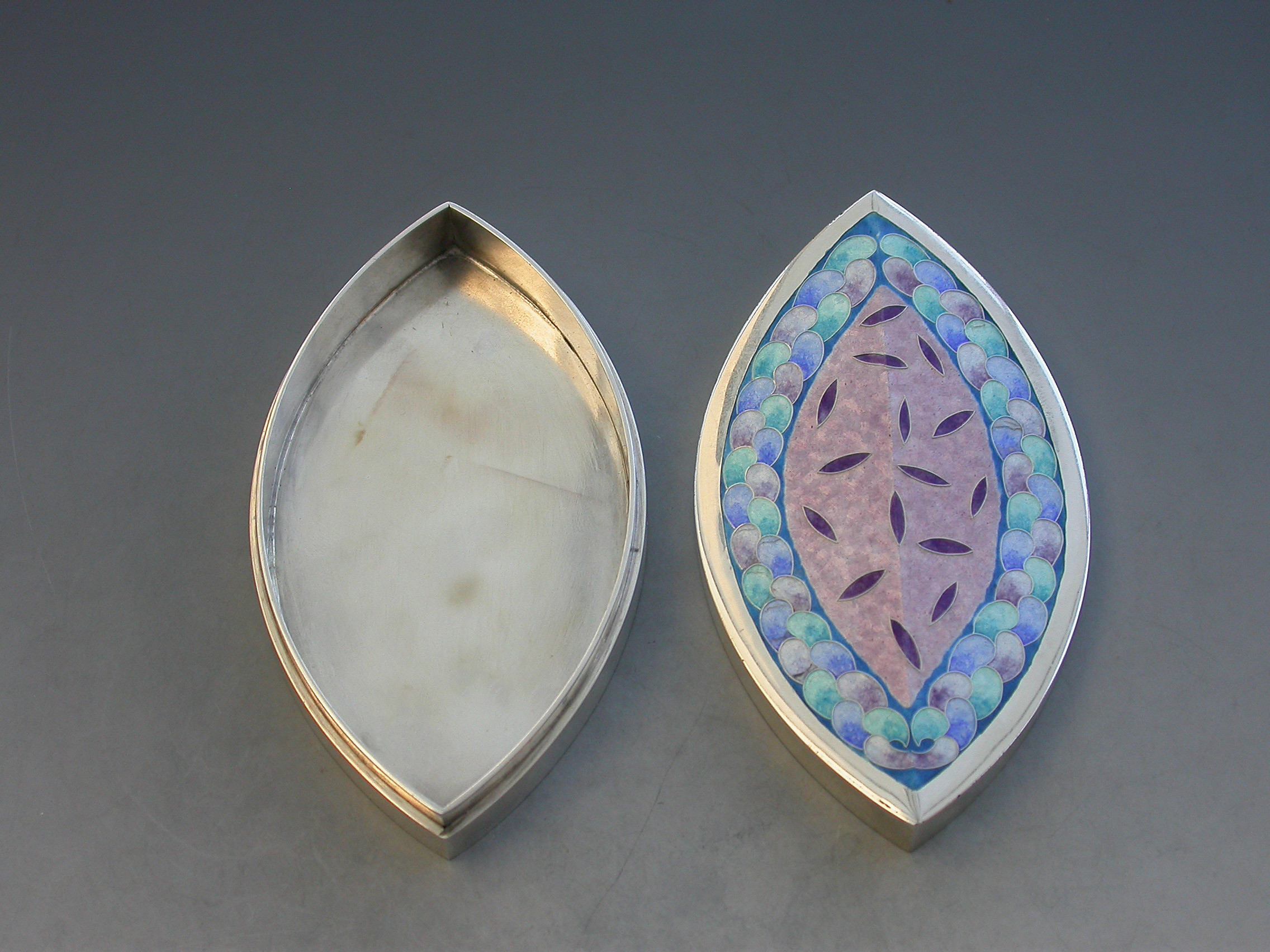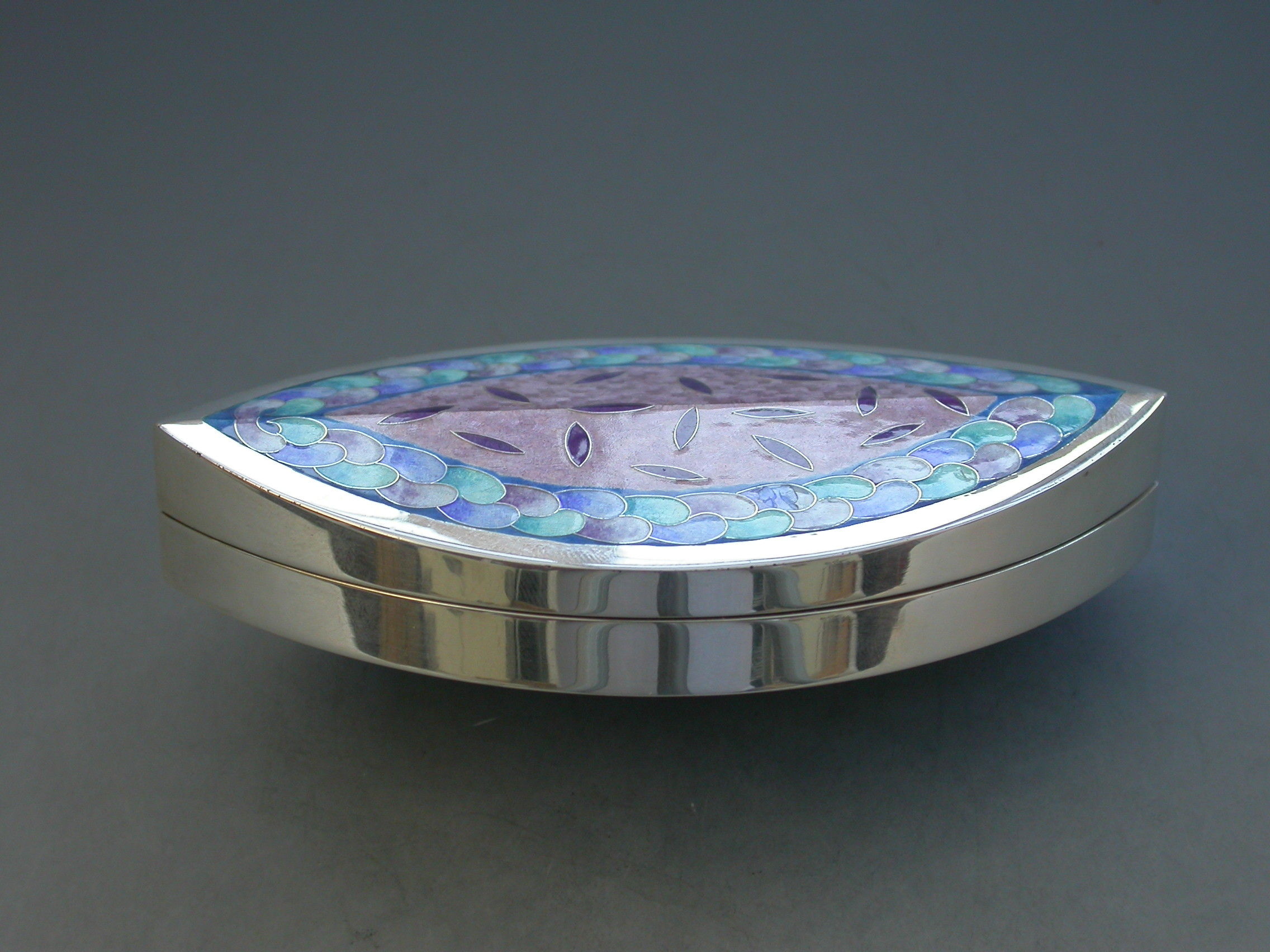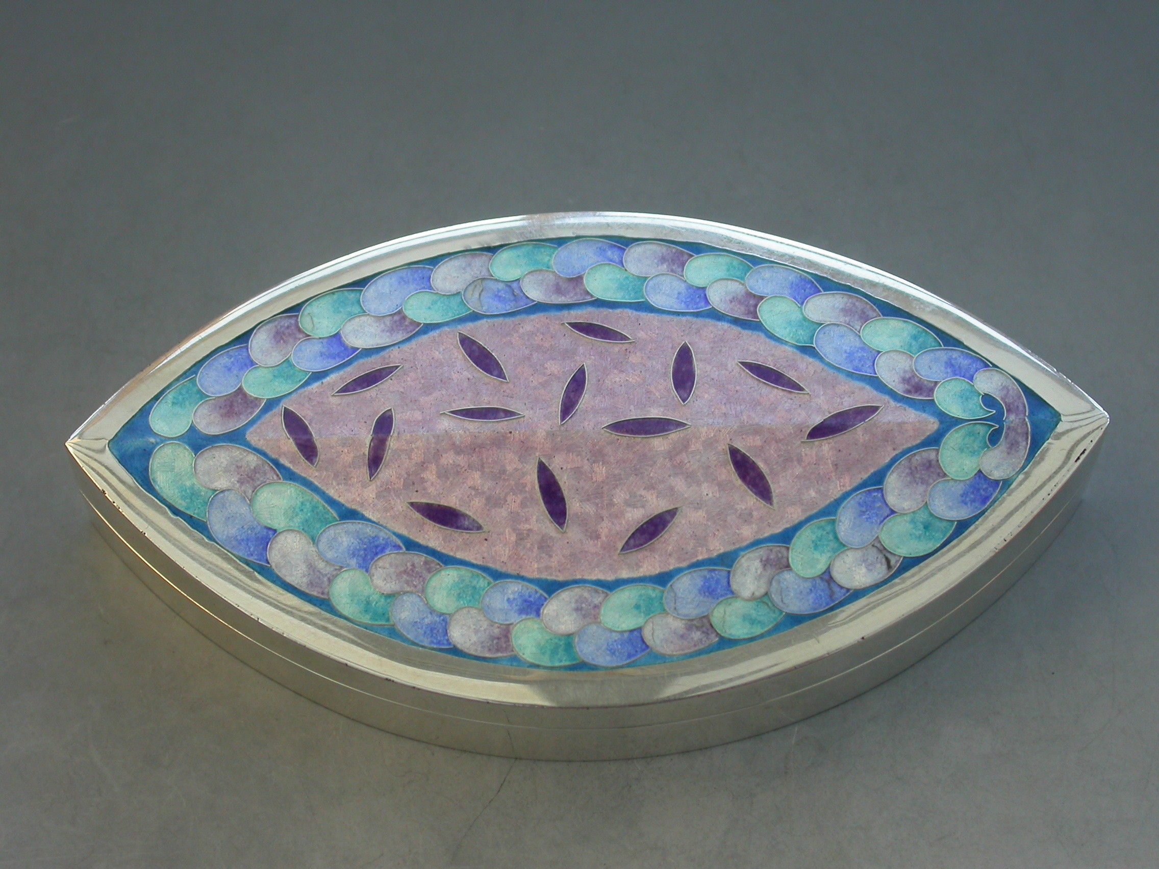A very fine and heavy quality boat shaped silver box, the cover decorated with pink, blue, green and lilac pastel coloured enamels, by Maureen Edgar.
