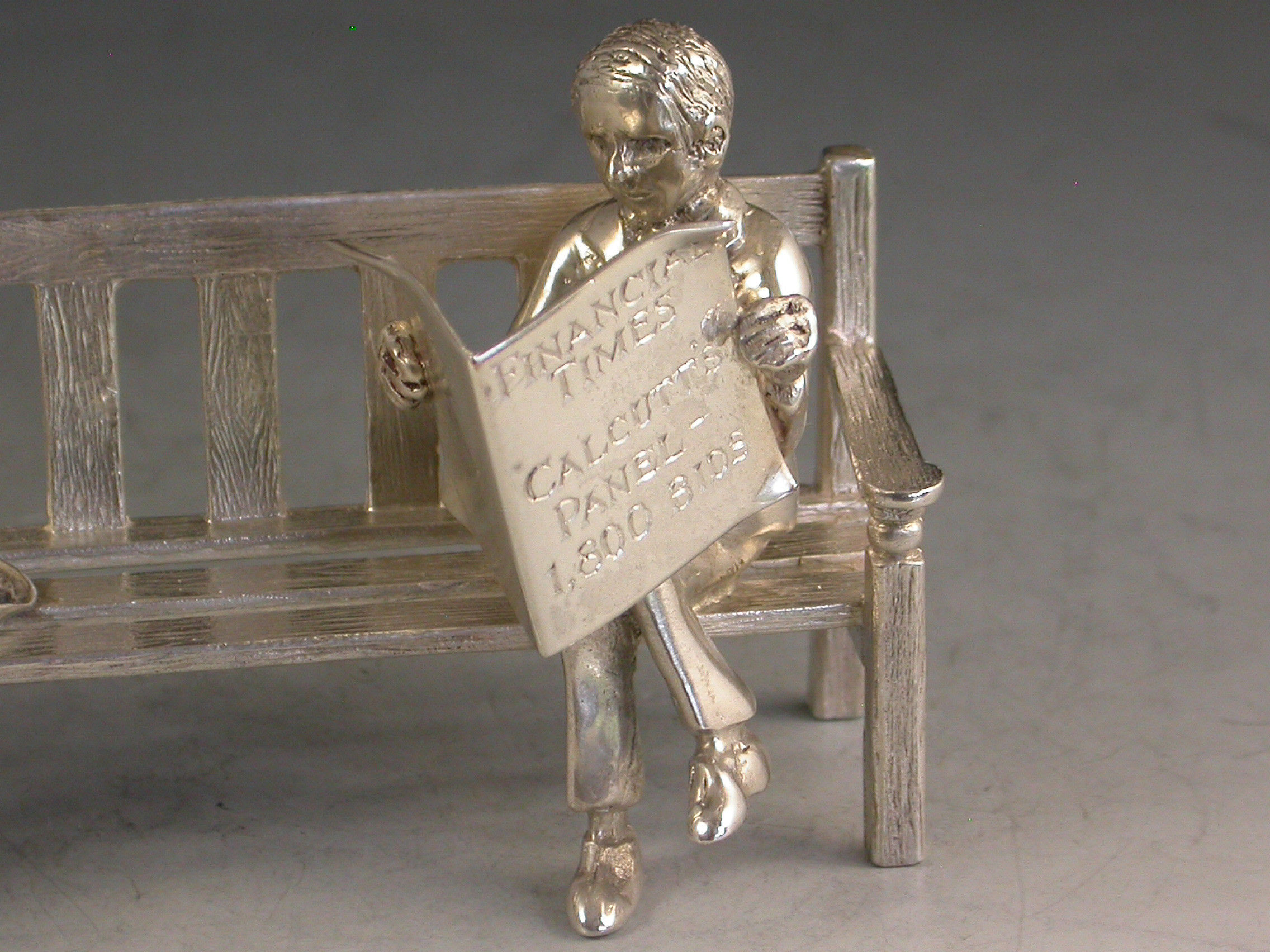 A modern silver model of a Gentleman sitting on a wooden bench, with hat and brolly next to him, reading a newspaper. The newspaper has inscribed on it 'Financial Times, Calcutts Panel - 1800 bids'.