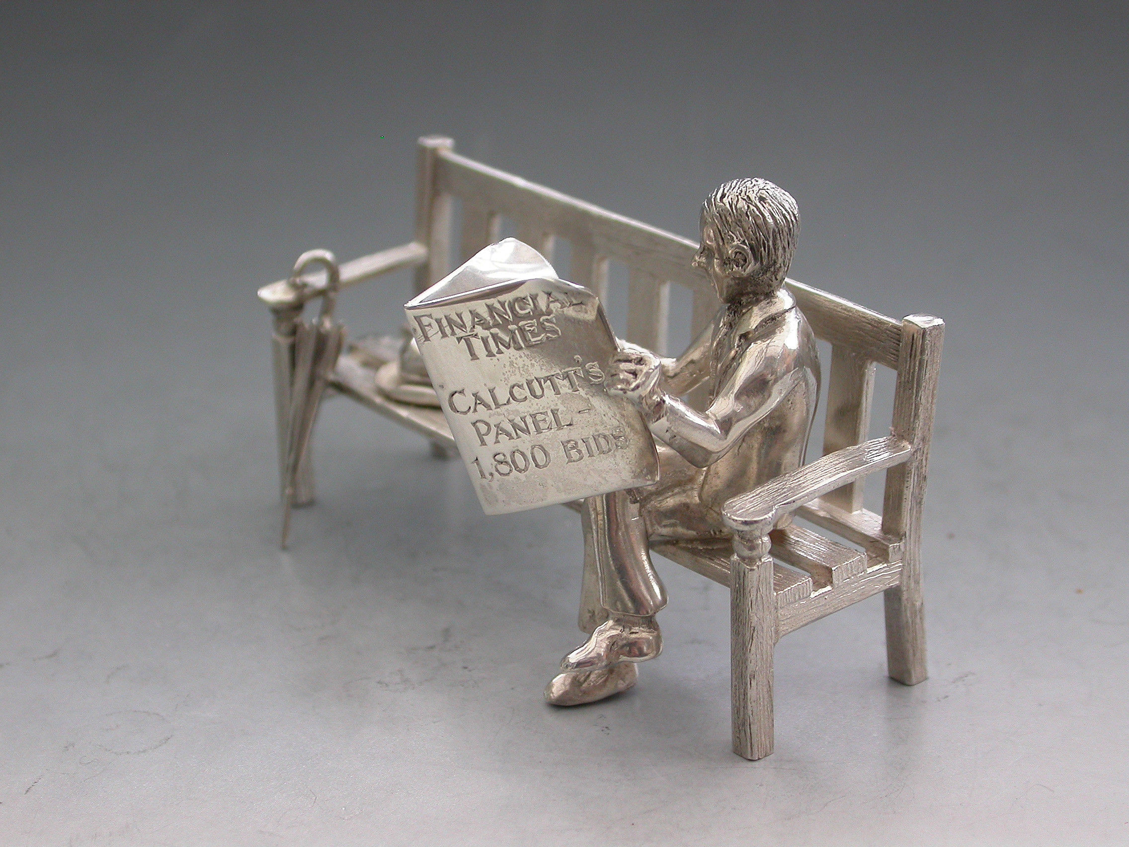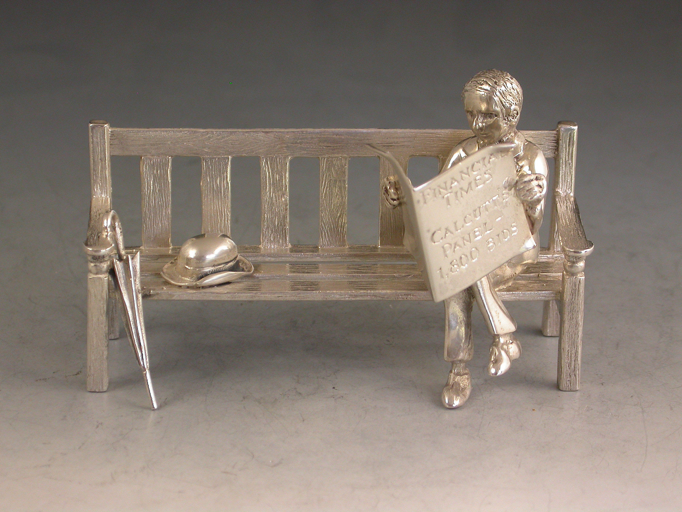 Modern Silver Model Gentleman Sitting on a Bench ""Calcutts Panel, 1800 Bids""