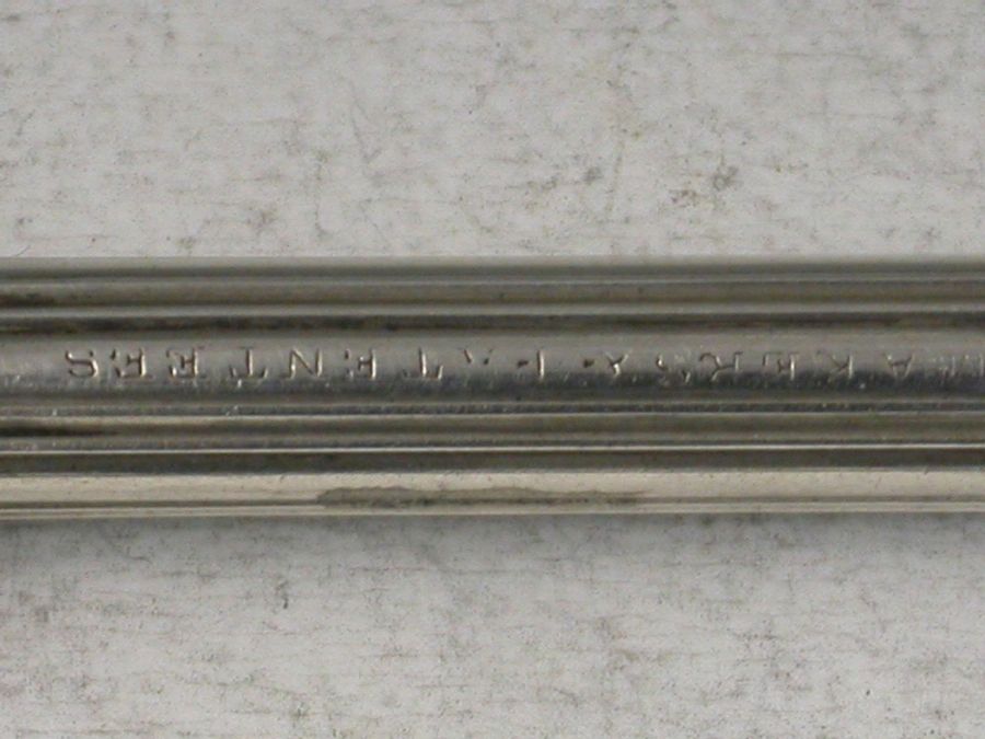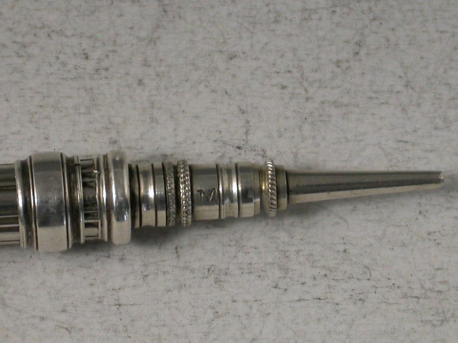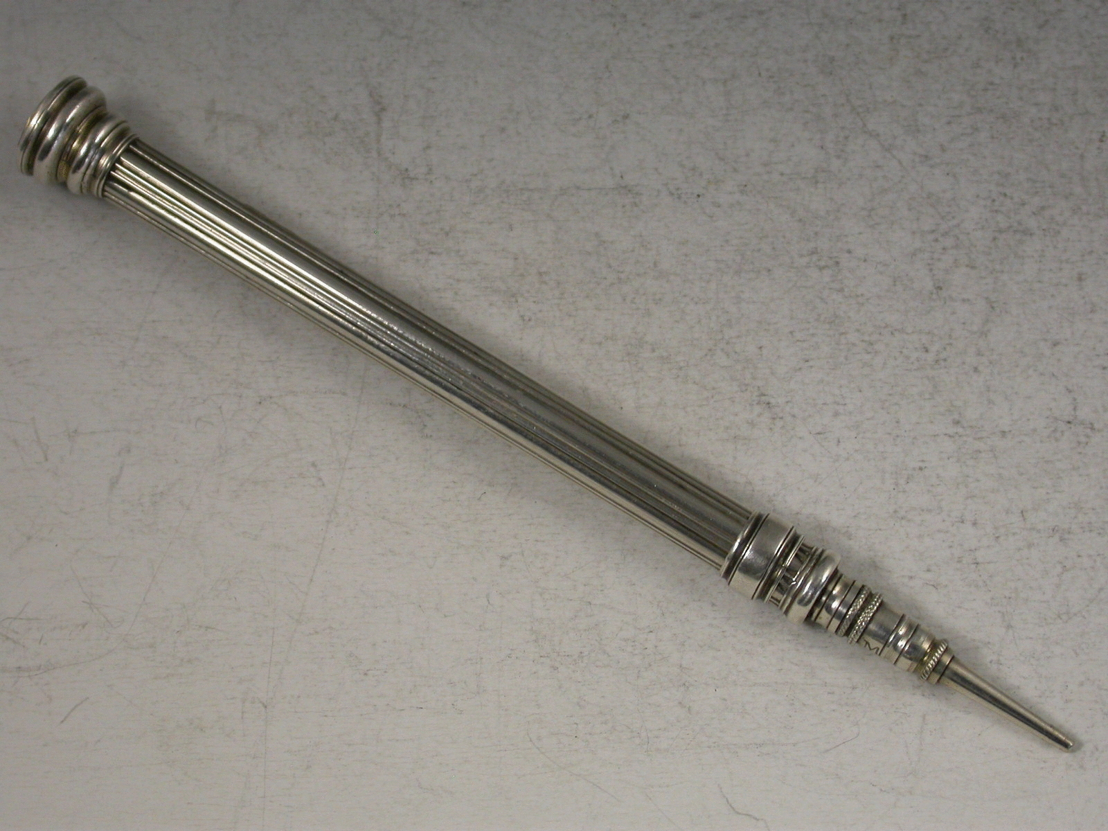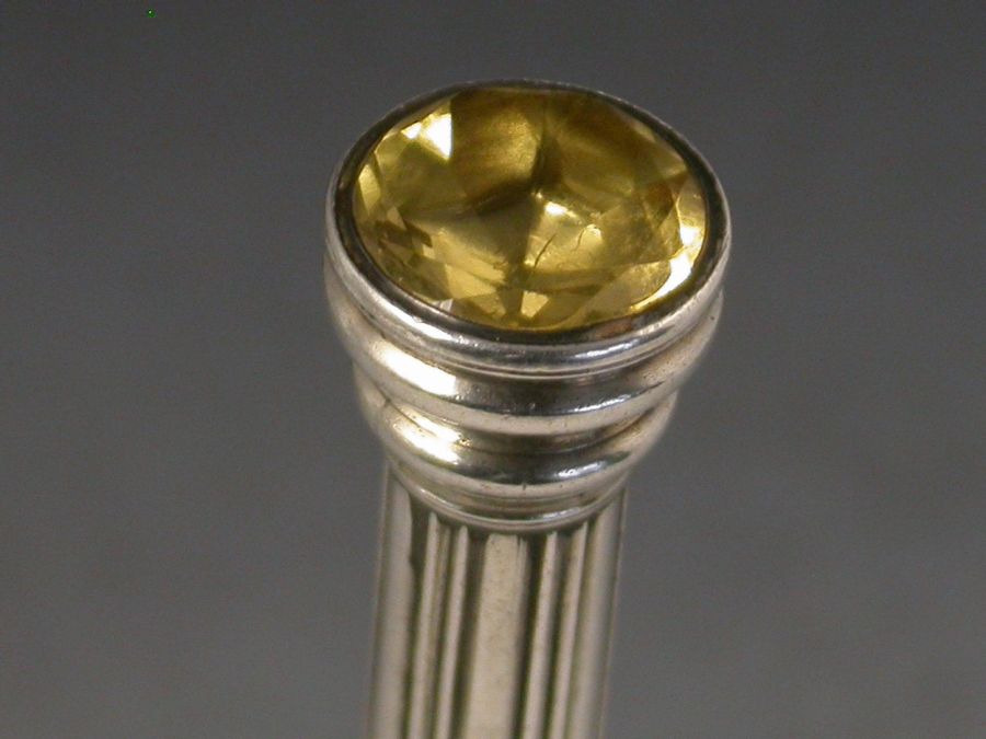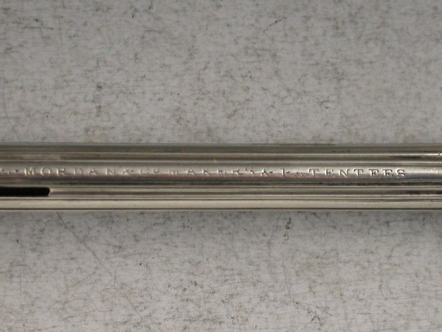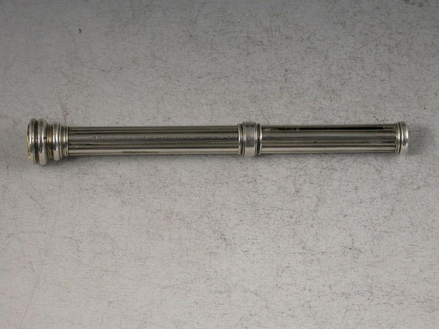 An early silver Slider Propelling Pencil with plain ribbed body and screw off top set with citrine seal stone. Stamped S. Mordan & Co Makers & Patentees c1830 – 45.