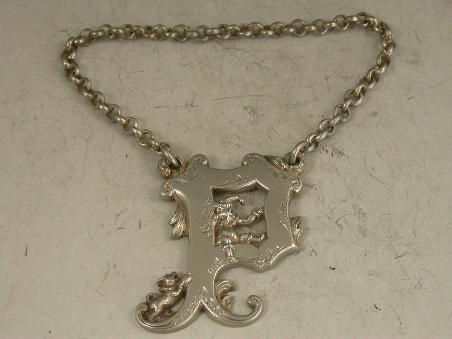 A very fine quality and rare early Victorian heavy cast silver Wine Label in the form of a stylized capital letter 'P' enhanced with leaves and Mr Punch and his dog Toby.