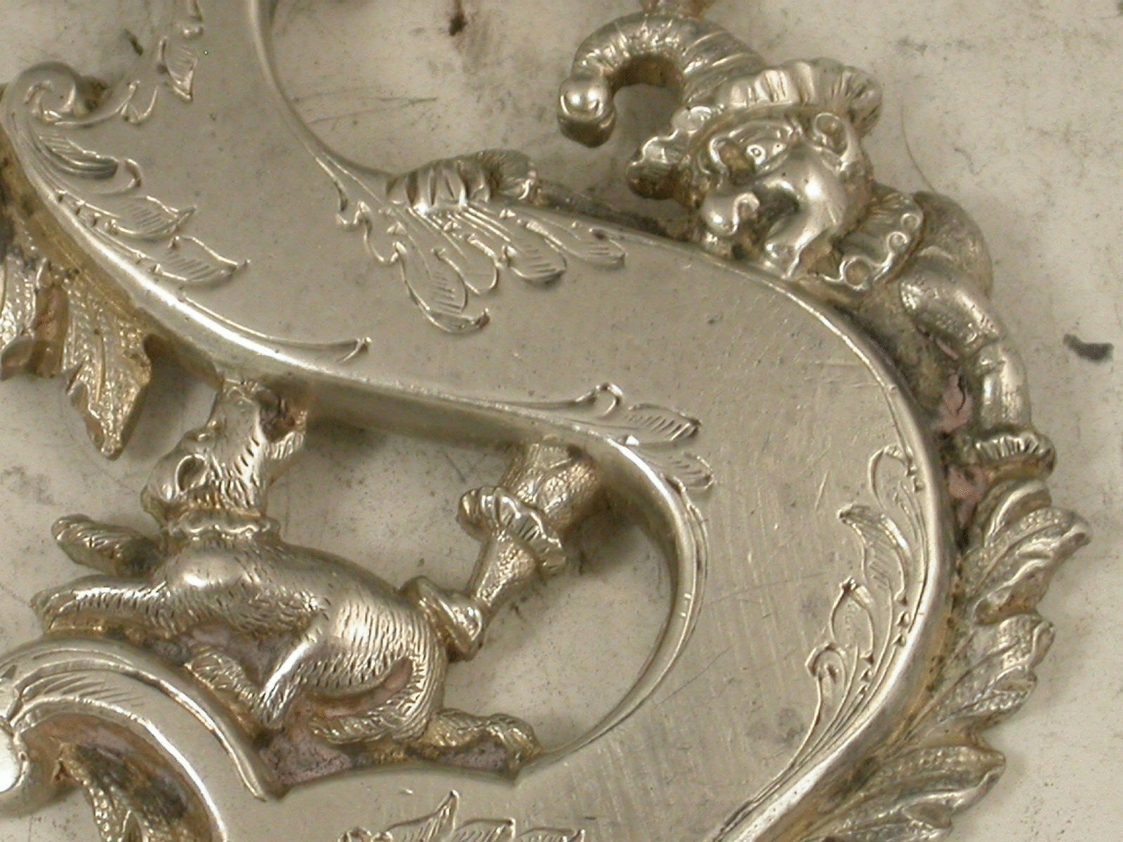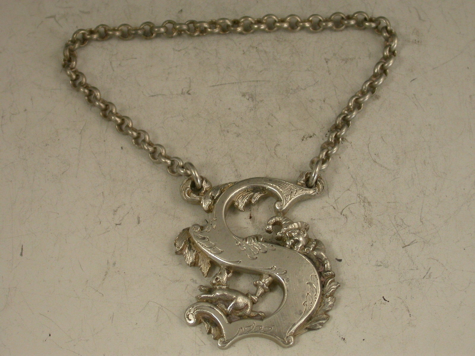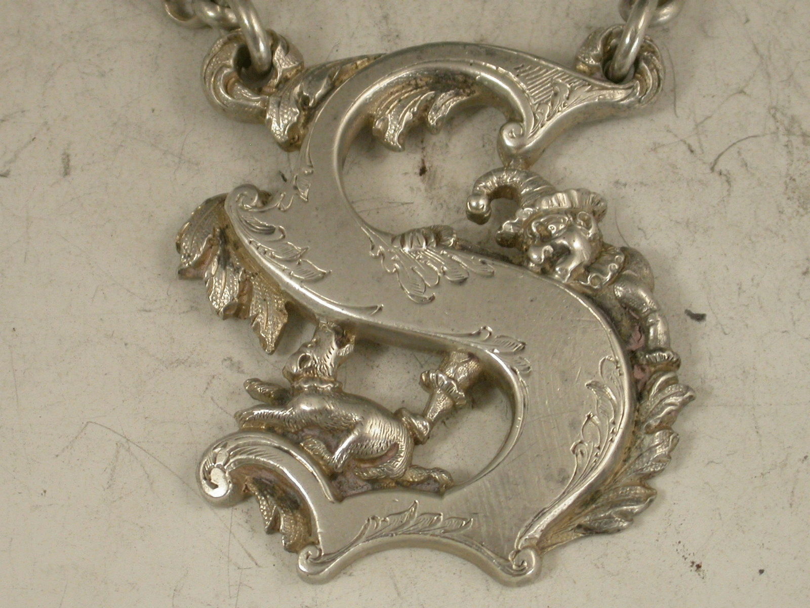 Mr Punch & Dog Toby Antique Silver Capital Letter 'S' Wine Label