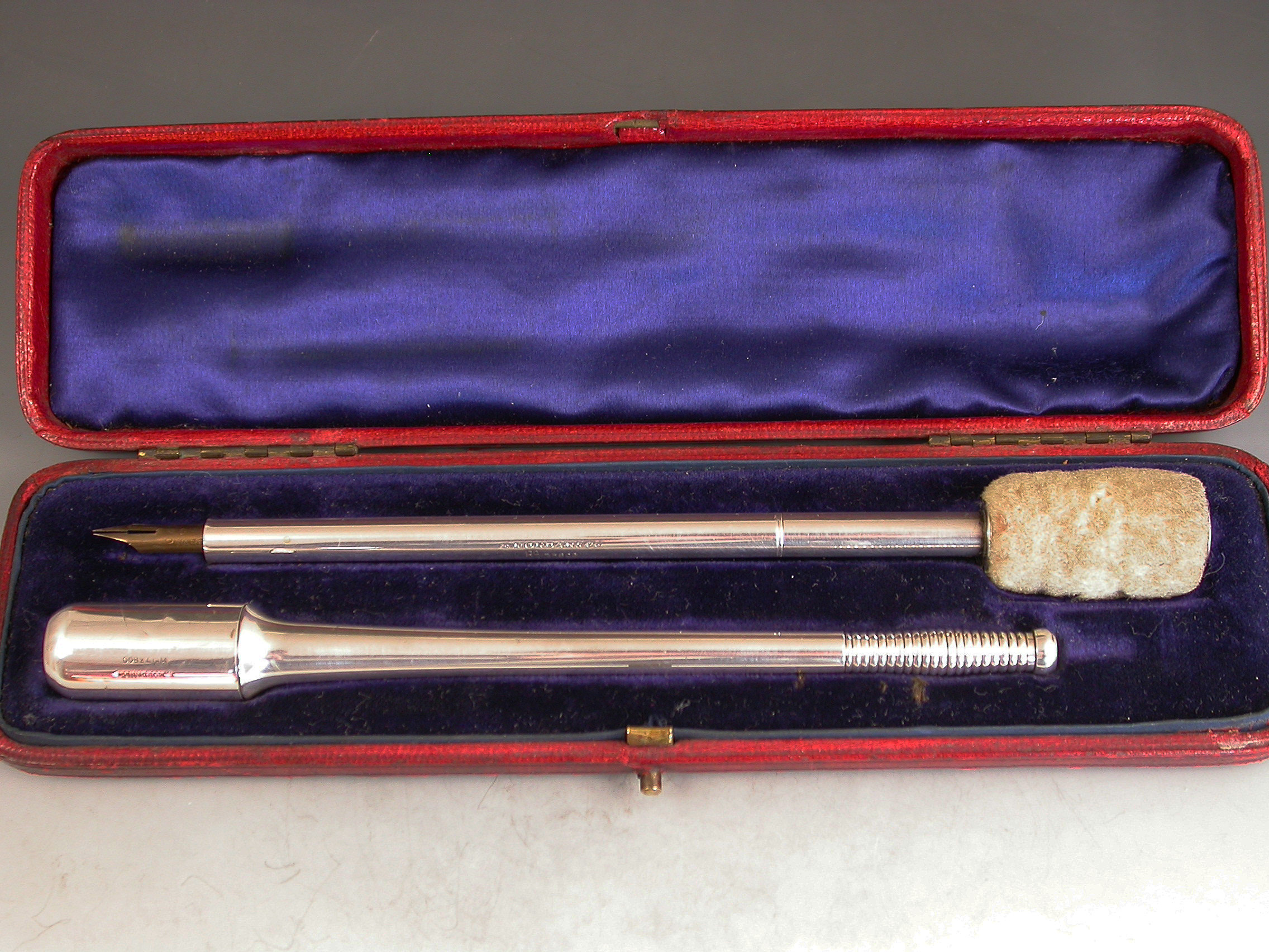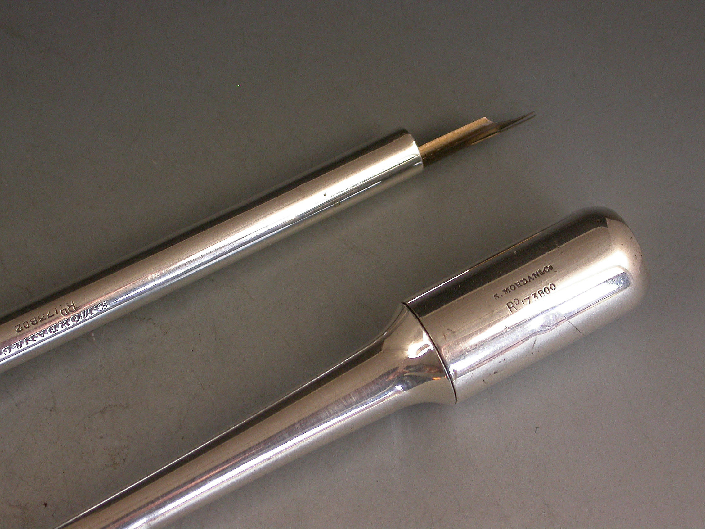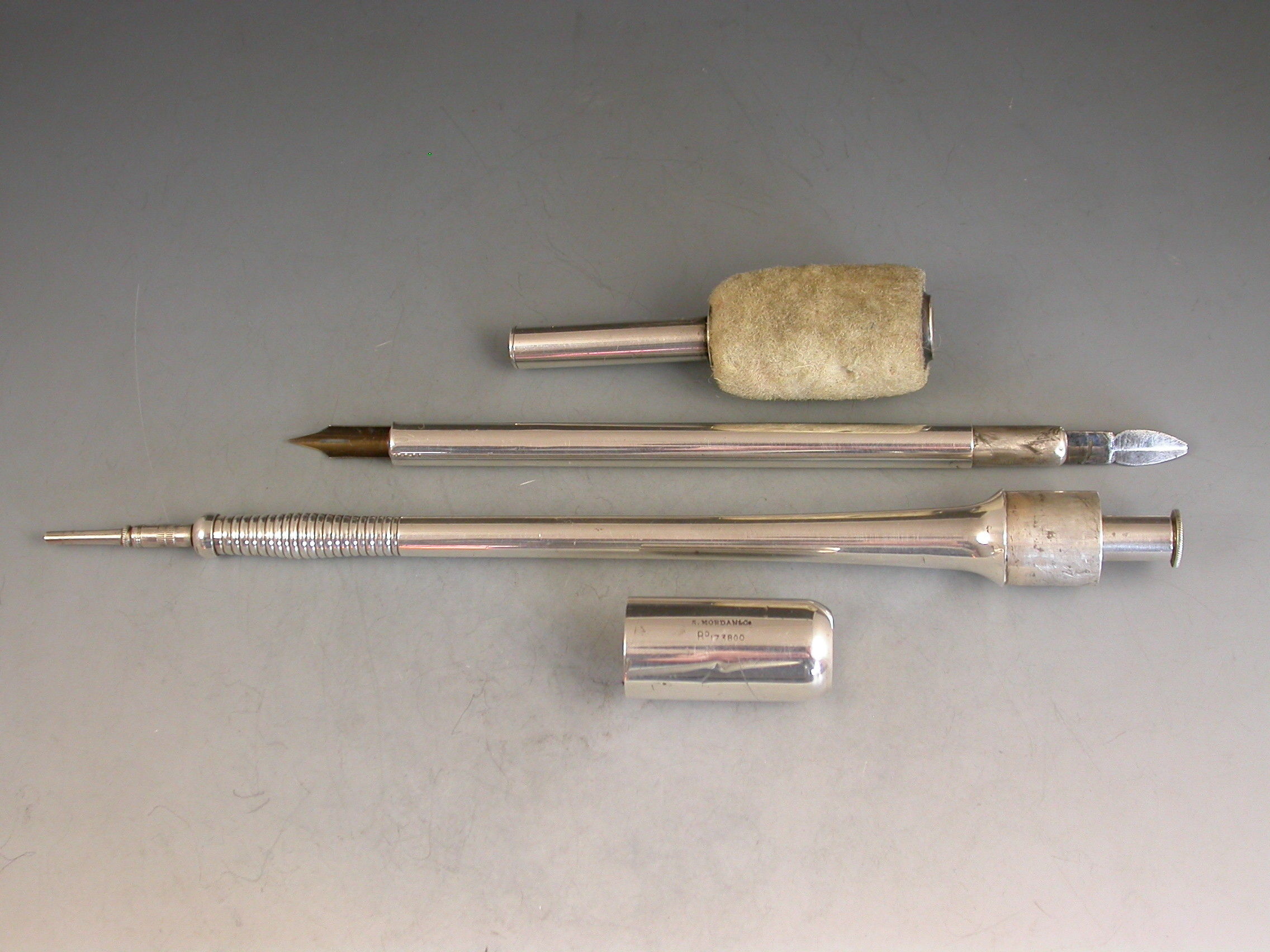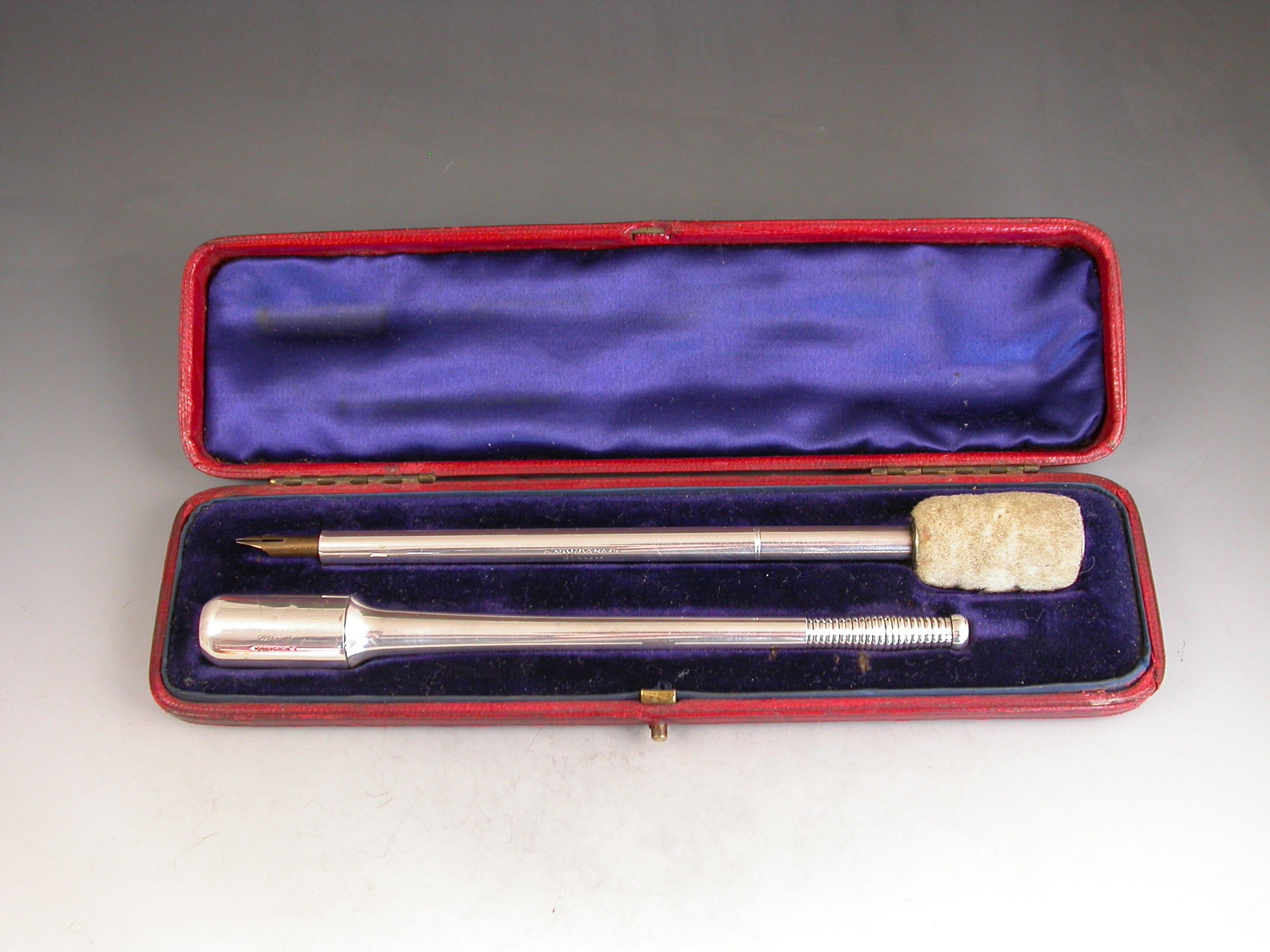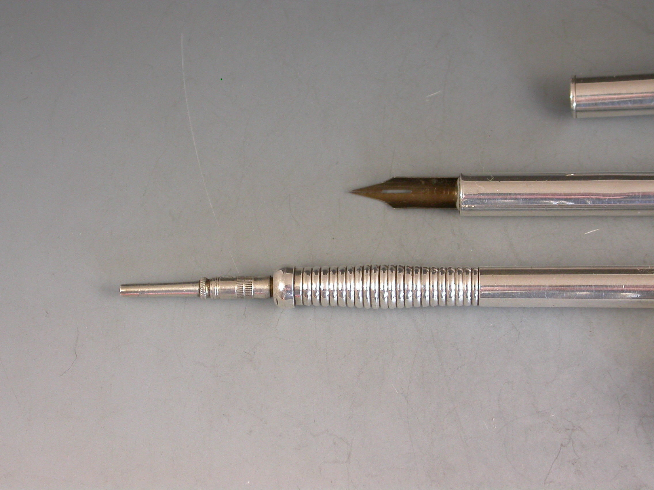 Highly unusual Victorian cased silver Writing or Artists Pen and Pencil Set comprised of a mechanical twist opening propelling pencil with shaped reeded handle, the tapering barrel with bulbous compartment with pull-off cover opening to reveal a central storage compartment for leads / nibs etc. The dip pen with plain cylindrical barrel and felt or horsehair mop terminal. The barrel pulling apart and containing a slotted eraser with steel blade.