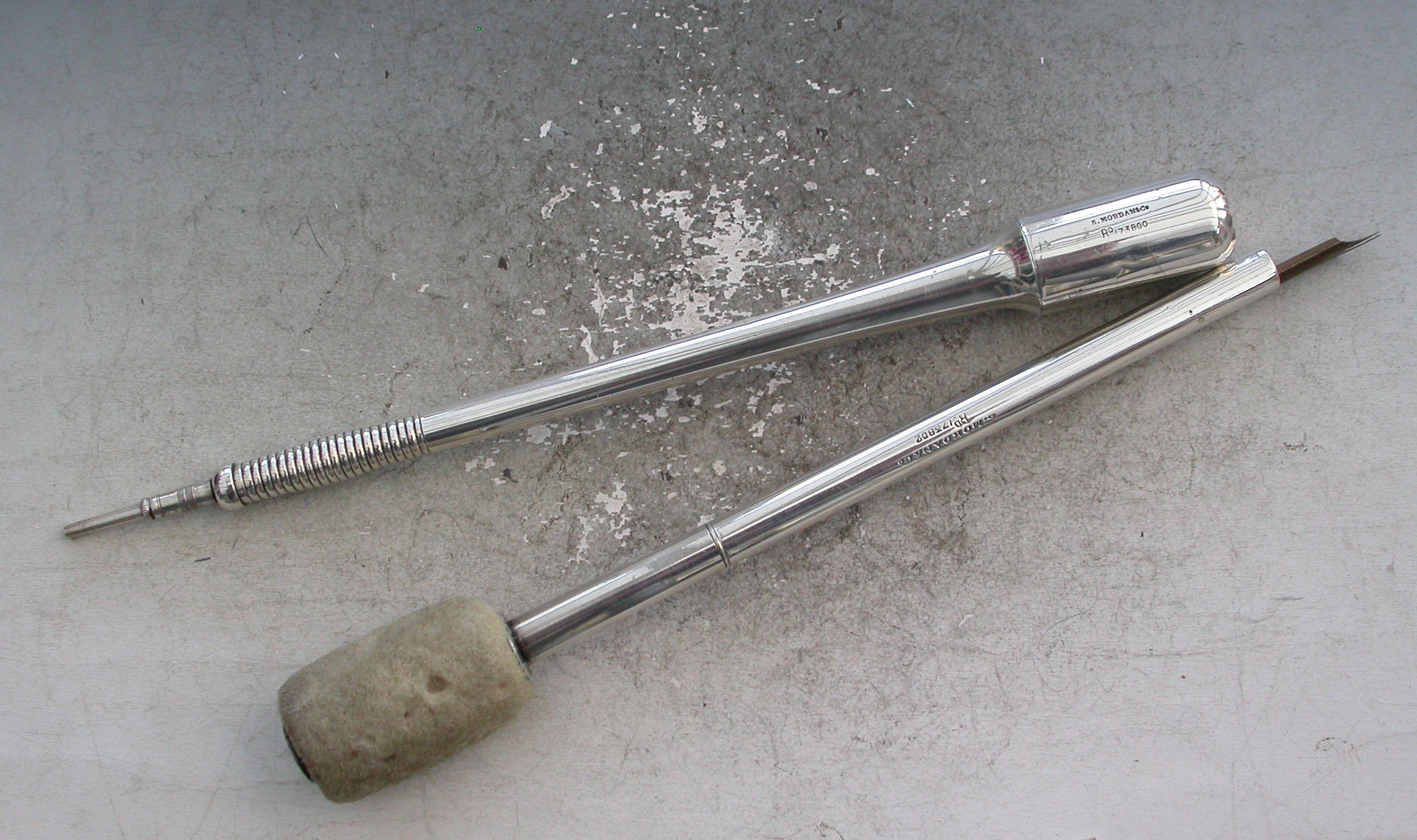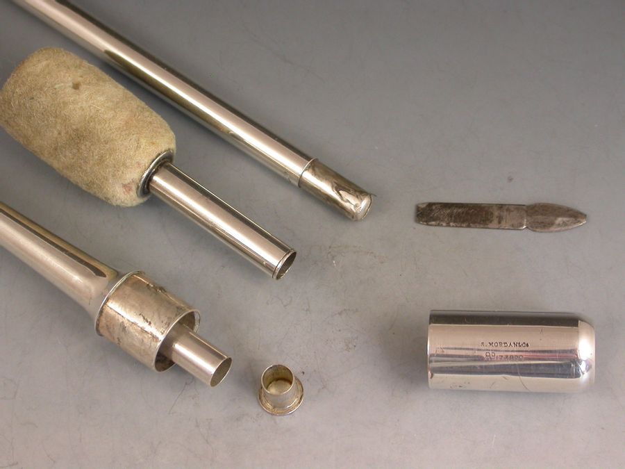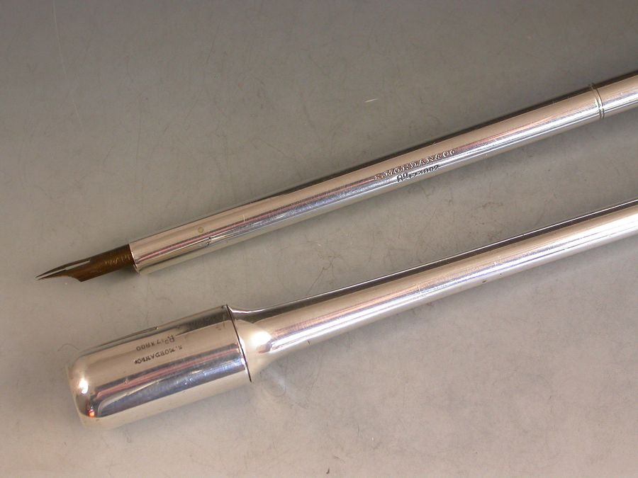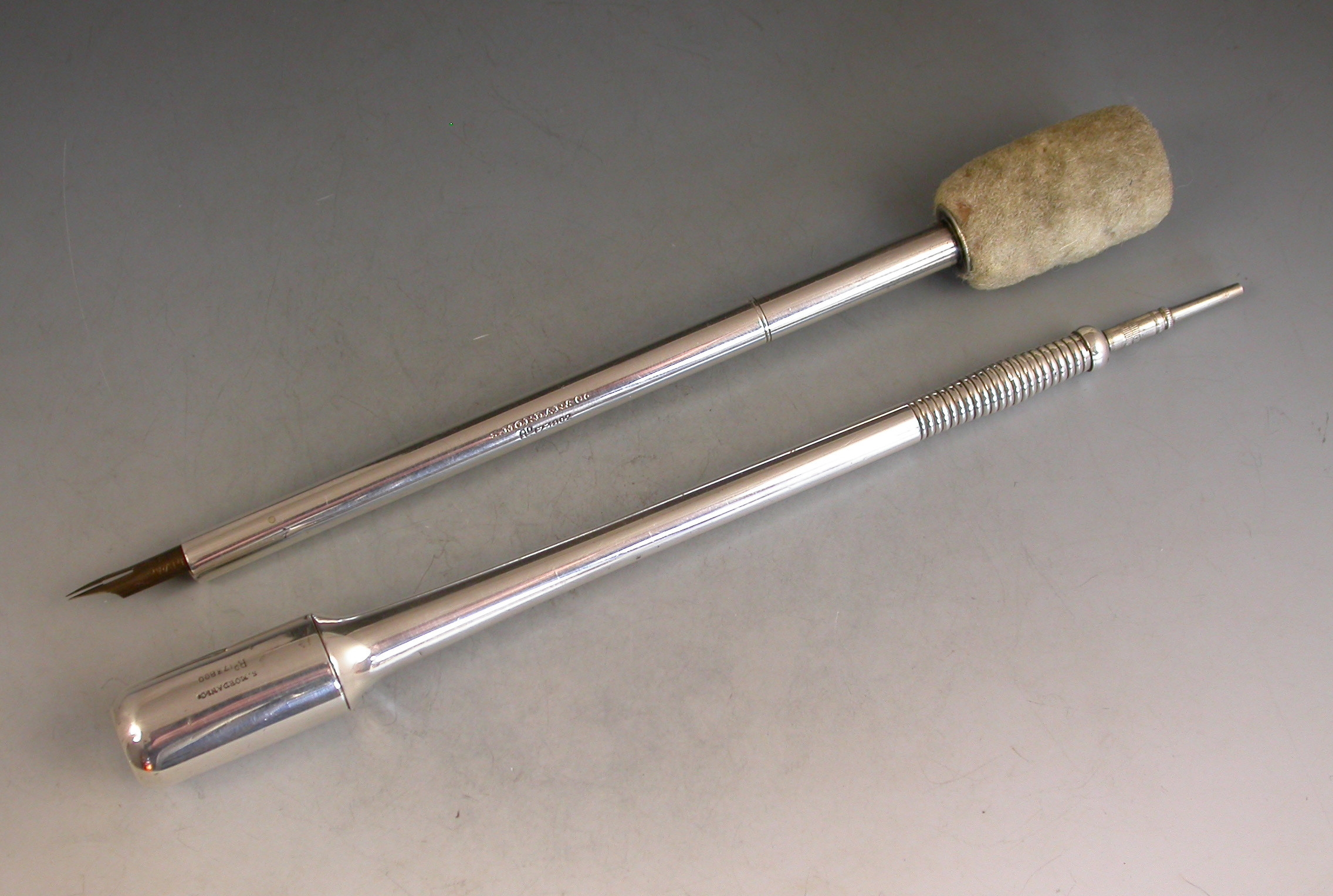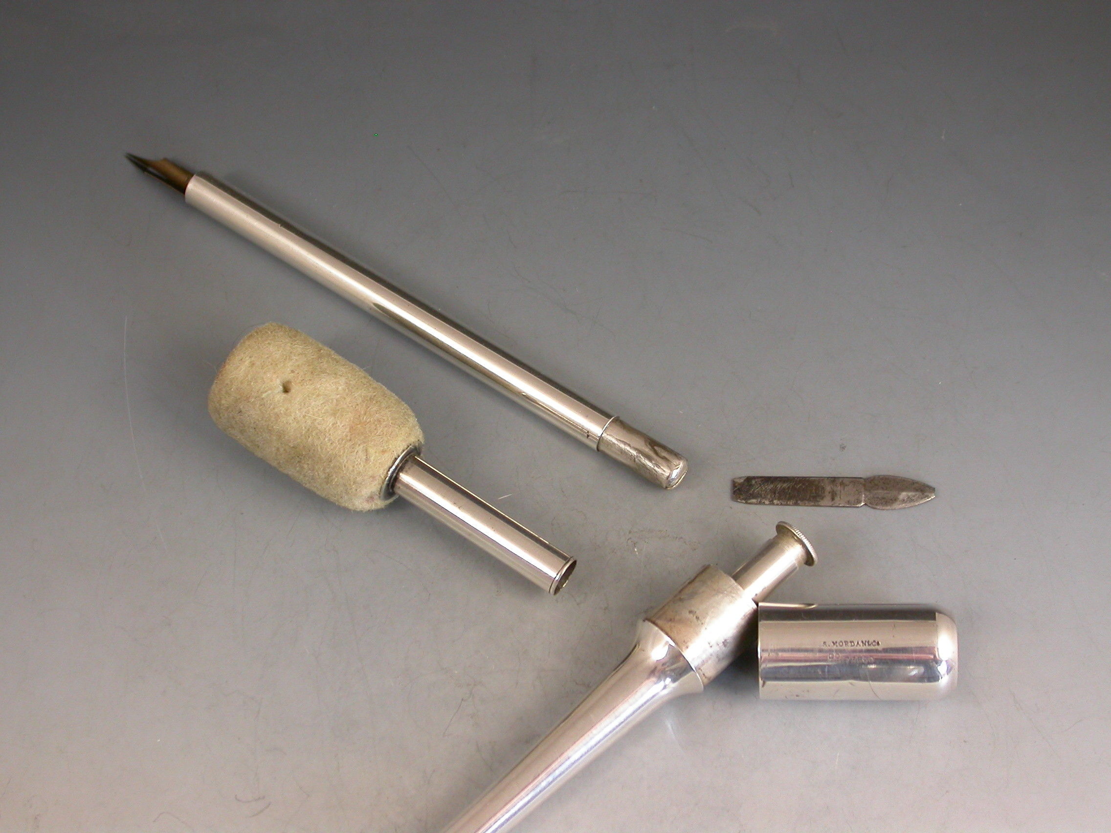 Highly unusual Victorian cased silver Writing or Artists Pen and Pencil Set comprised of a mechanical twist opening propelling pencil with shaped reeded handle, the tapering barrel with bulbous compartment with pull-off cover opening to reveal a central storage compartment for leads / nibs etc. The dip pen with plain cylindrical barrel and felt or horsehair mop terminal. The barrel pulling apart and containing a slotted eraser with steel blade.