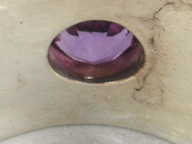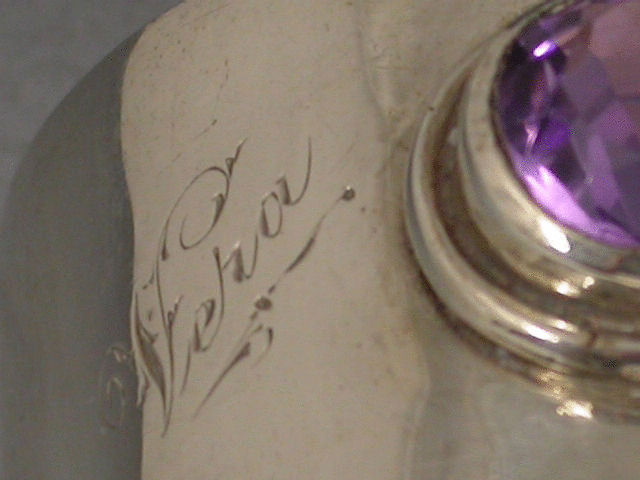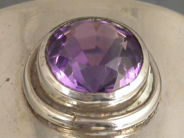 An Edwardian silver Napkin Ring of plain saddle shape, set with a fine facetted amethyst Cairngorm stone. Engraved – “Vera”.