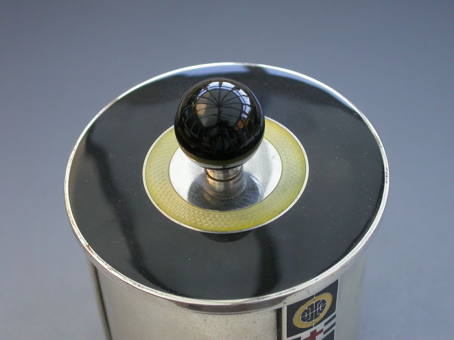 An unusual Norwegian Art Deco silver and enamel Tea Caddy of drum shape with three vertical supports enameled with geometric designs in black, red and yellow. The detachable cover in black enamel with a yellow band and ball finial.