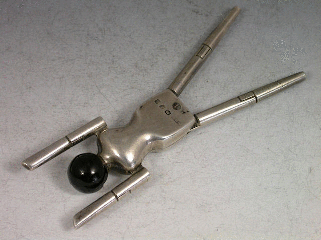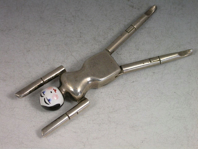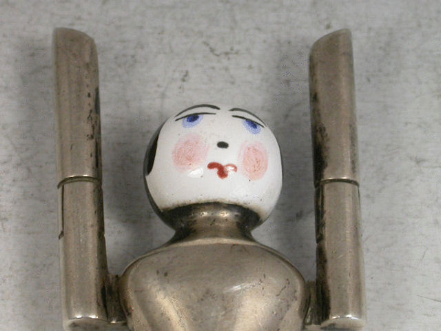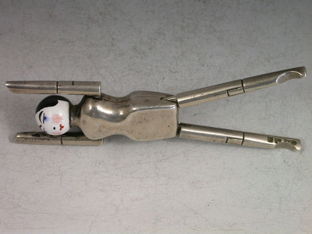 A rare pair of George V Novelty silver articulated Sugar Nips formed as a “Dutch Doll” with finely enamelled head, the internal spring mechanism closing the legs when the arms are squeezed together.
