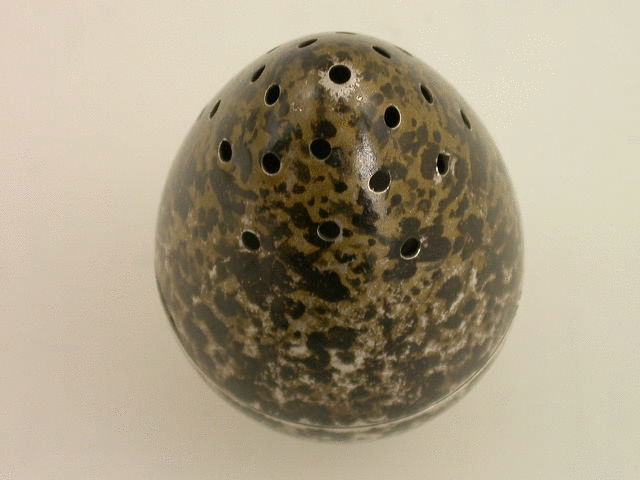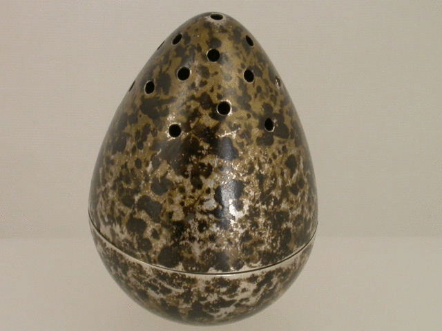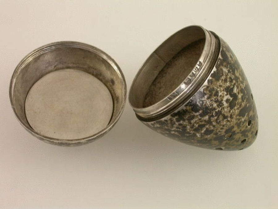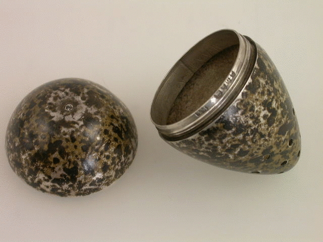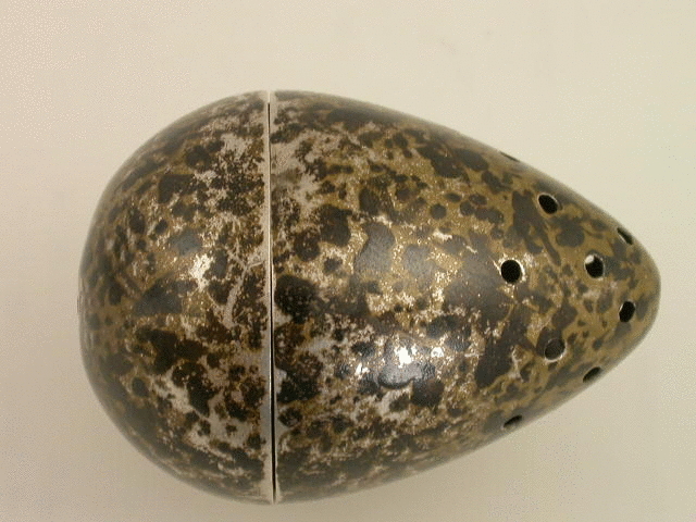 An interesting Victorian silver and enamel Novelty Pepper Pot in the form of Gulls or Quails Egg, made in two halves with superb precise screw thread to the centre, painted with mottled brown and black enamels to resemble a natural egg. The base is weighted so that the pepper remains upright.