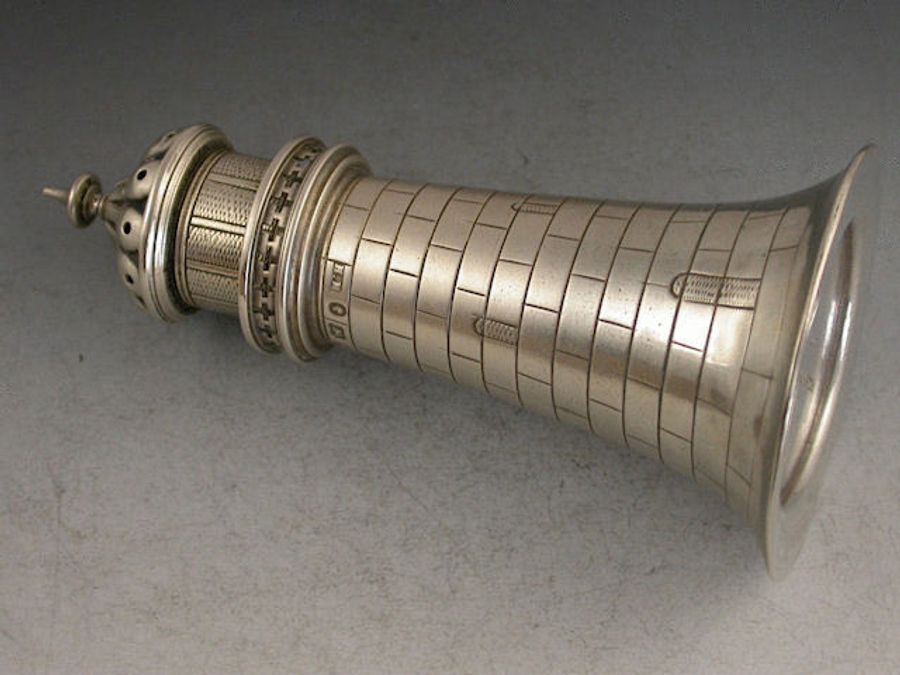 A rare Victorian novelty silver Pepper Castor modelled in the form of a Lighthouse, realistically engraved depicting the brickwork, windows and glass panels.