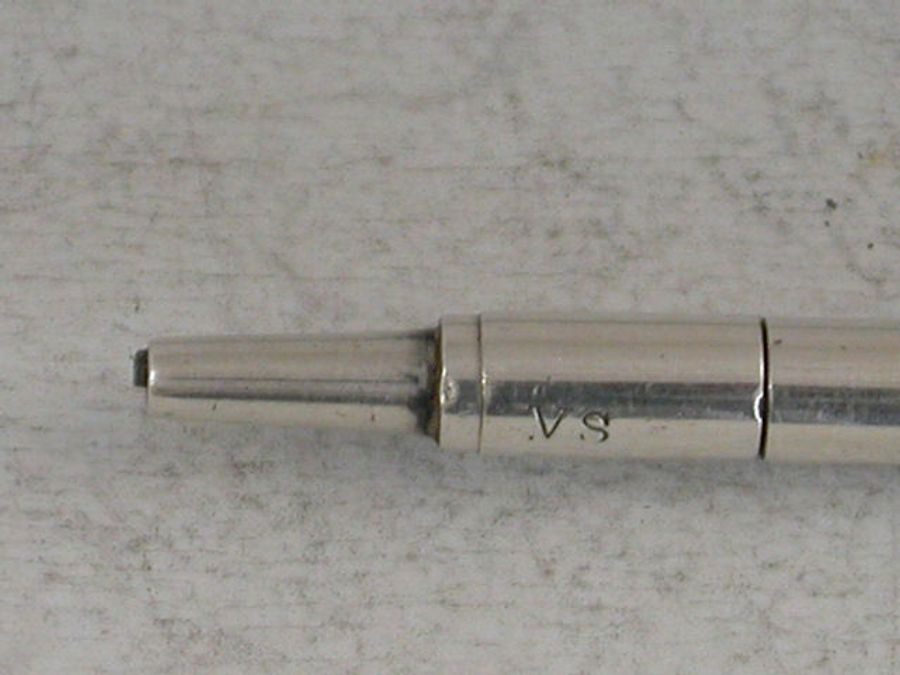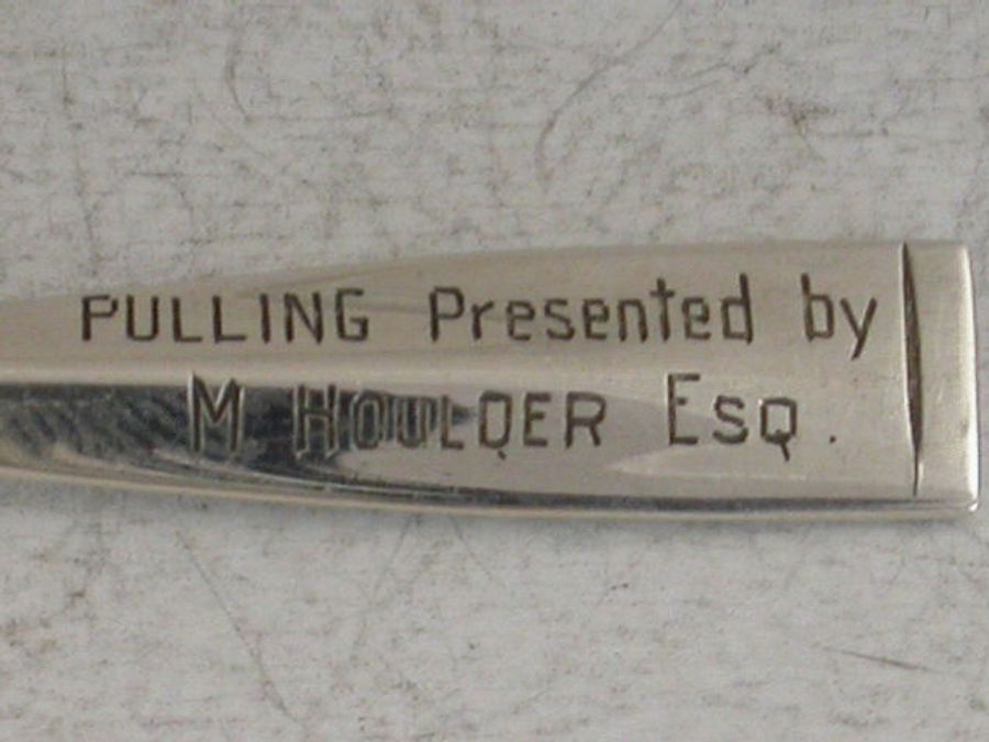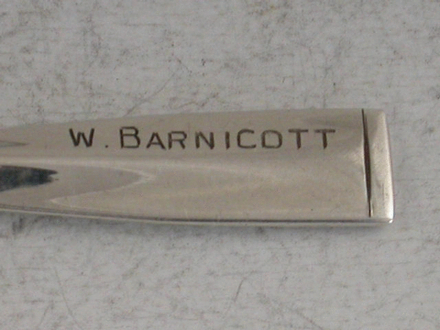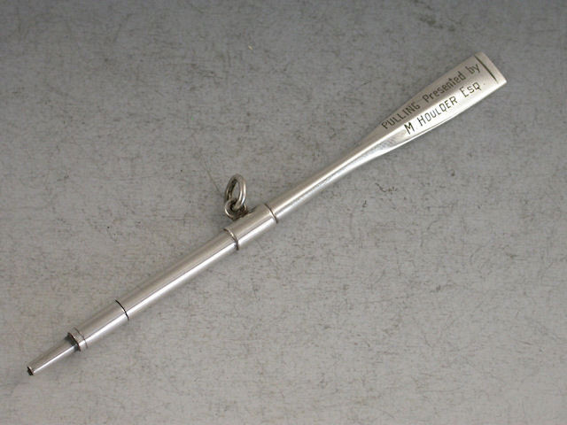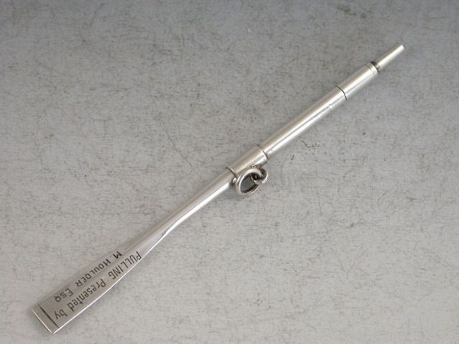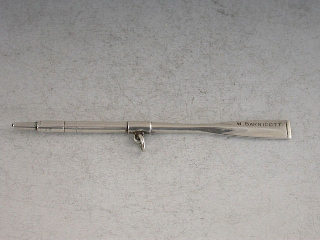 A rare novelty silver Rowing Prize Propelling Pencil formed as an Oar and engraved with the recipients name – W.BARNICOTT and to the reverse – PULLING Presented by M. HOULDER Esq.