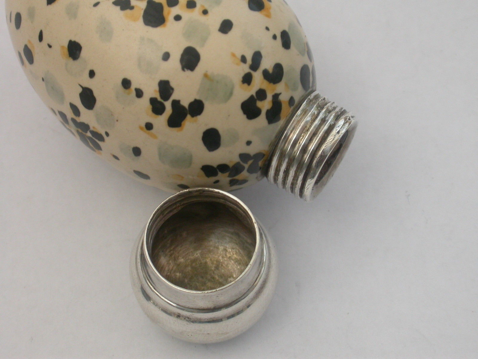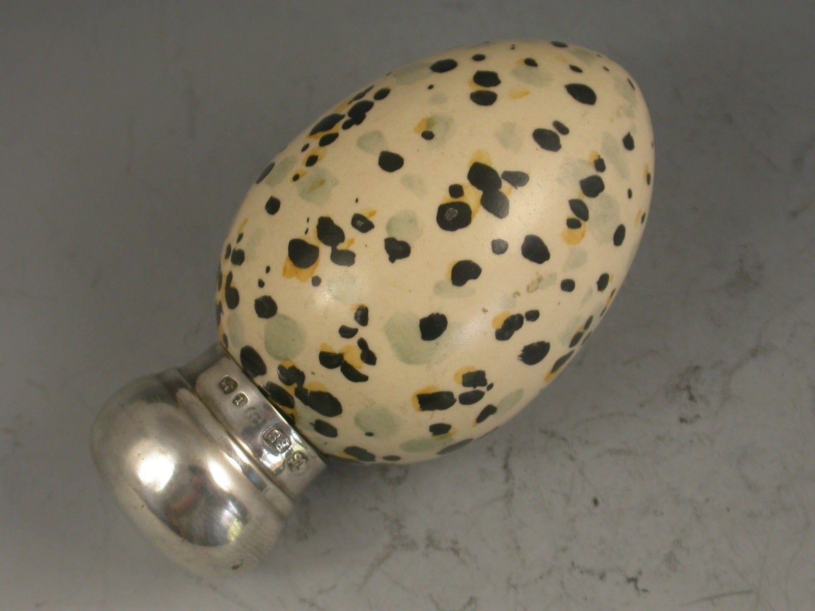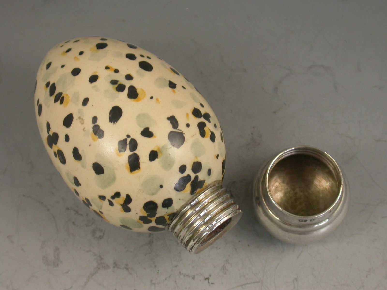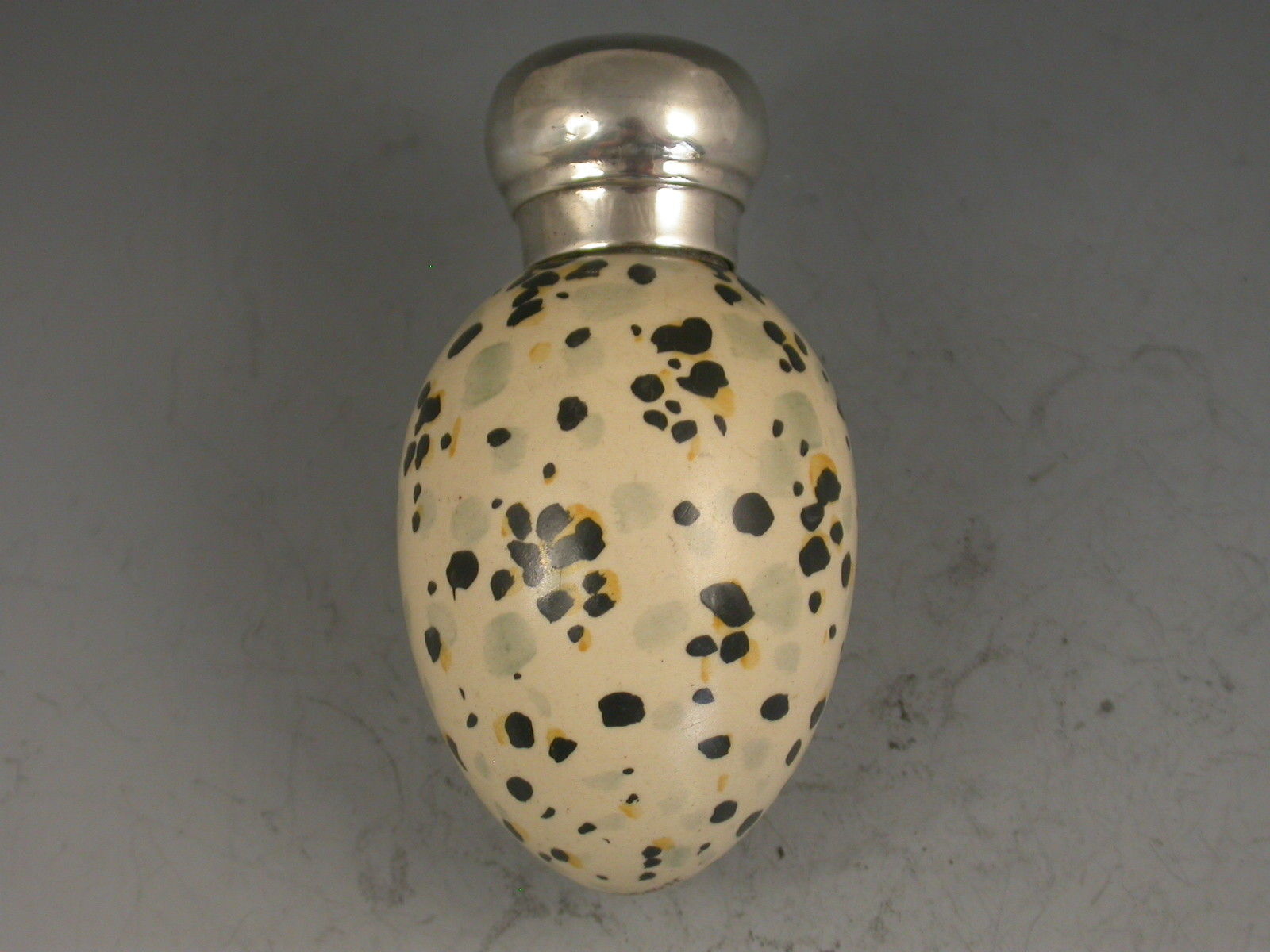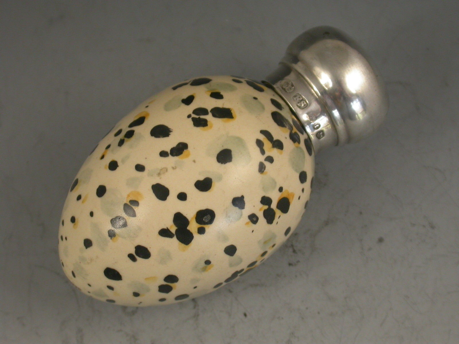 A rare Victorian novelty Scent Bottle, the porcelain body modelled as a speckled birds egg with domed silver screw off cap.The base marked with registration number 20772 for MacIntyre