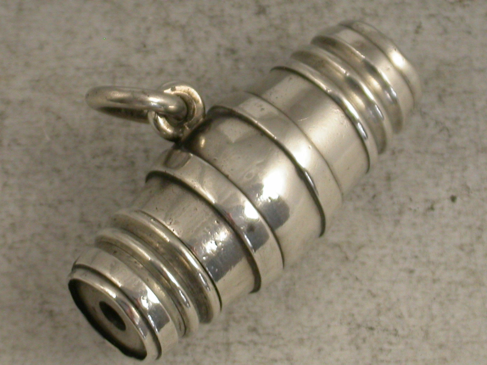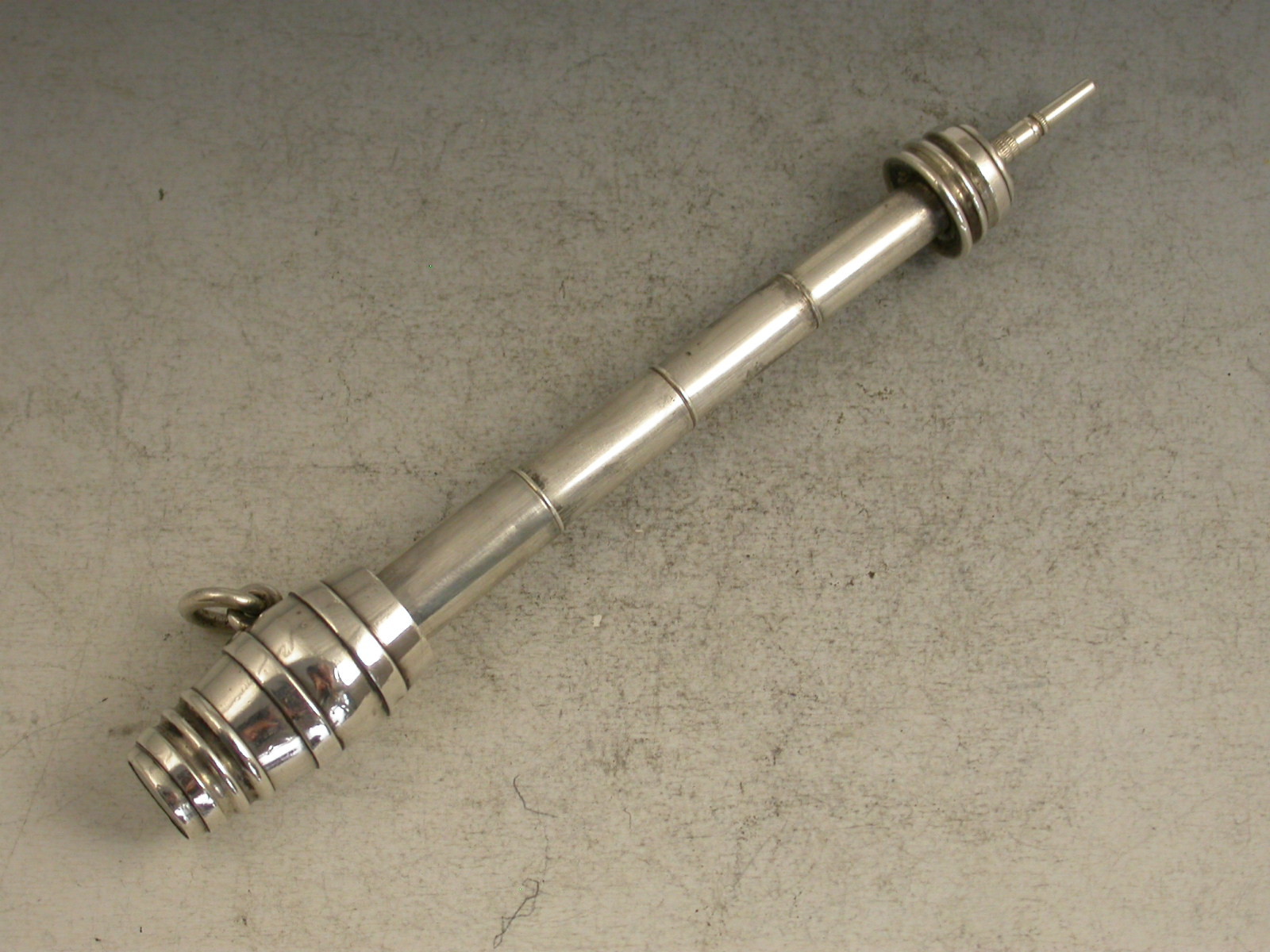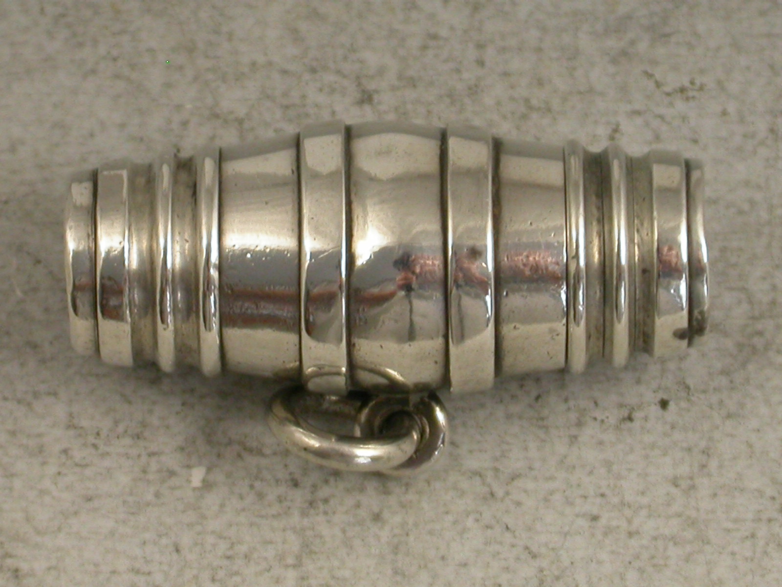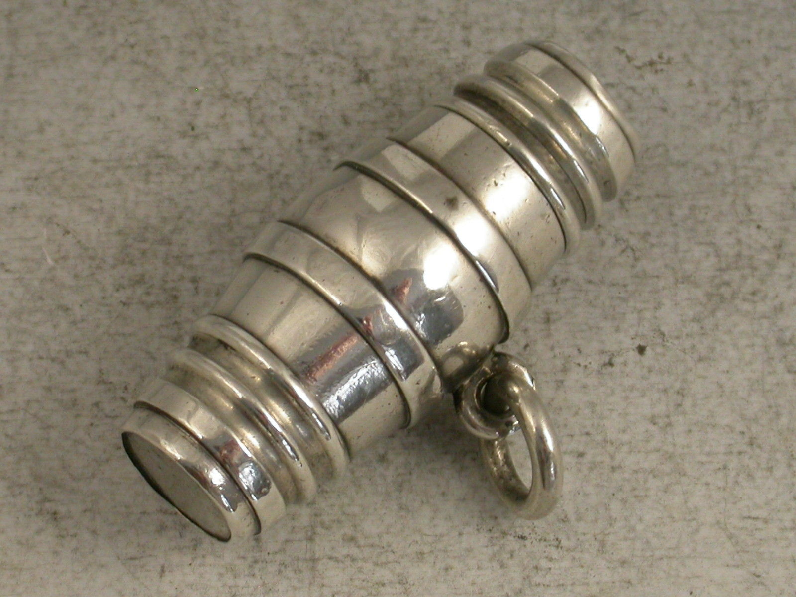 A rare Victorian novelty silver Propelling Pencil, made in the form of a Wooden Barrel with bands to simulate the metal straps. The telescopic mechanism with four drawers, attached suspension ring.