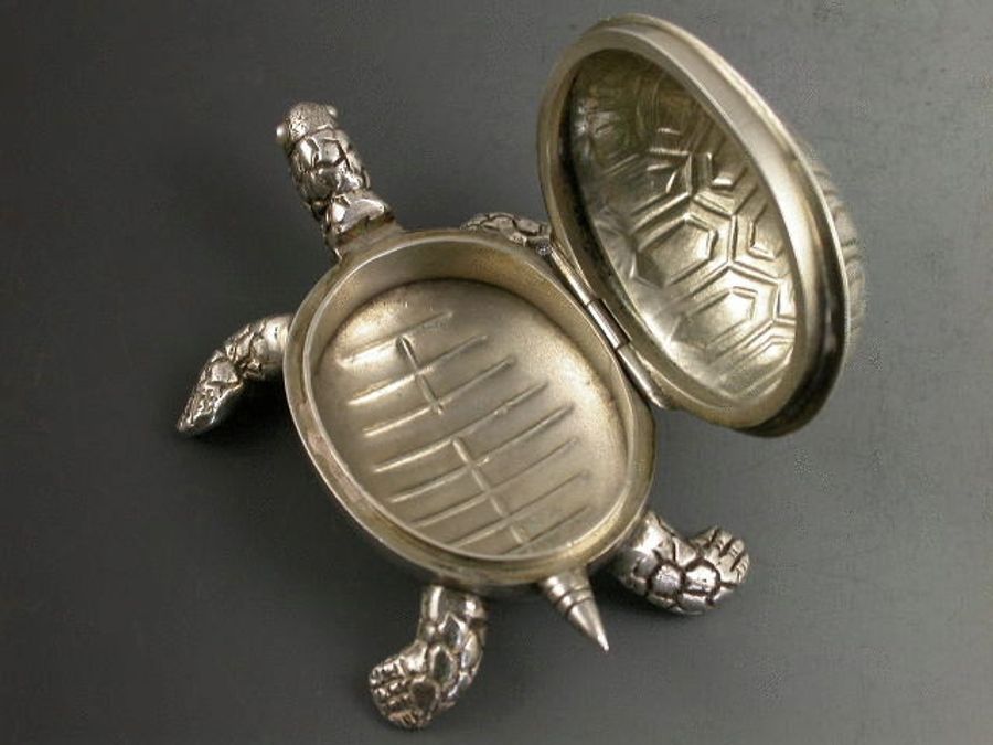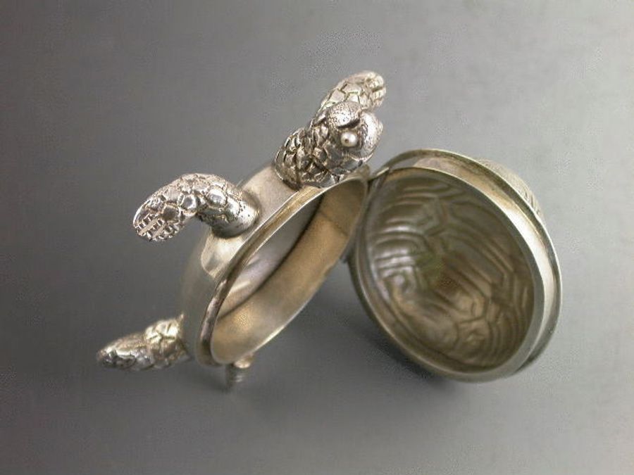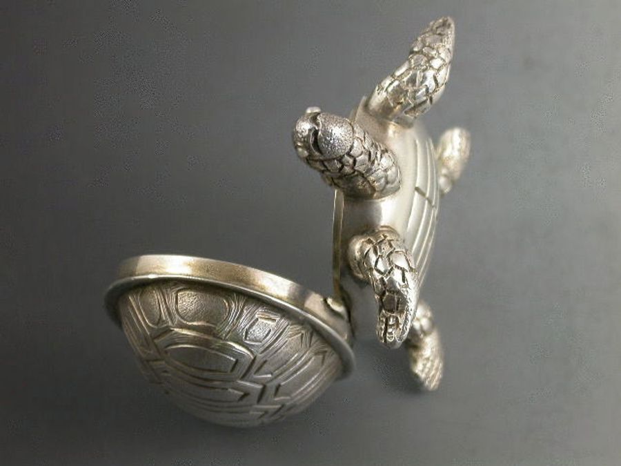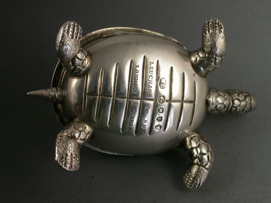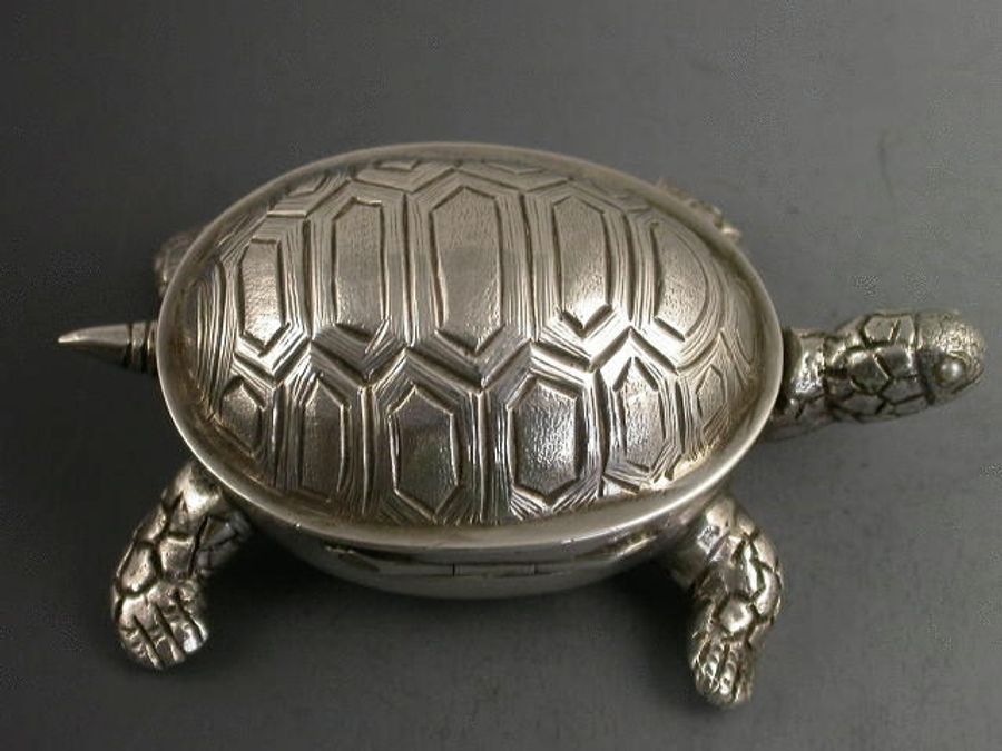 A very fine quality Victorian silver Novelty Pill Box, naturalistically modelled as a Tortoise or Turtle with very crisp closing hinged lid. Tiny seed pearls form the eyes.