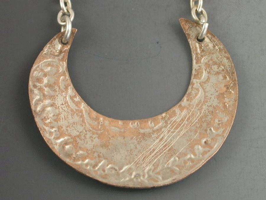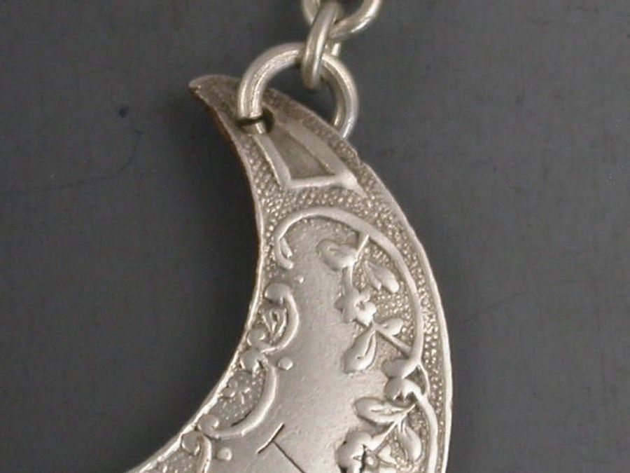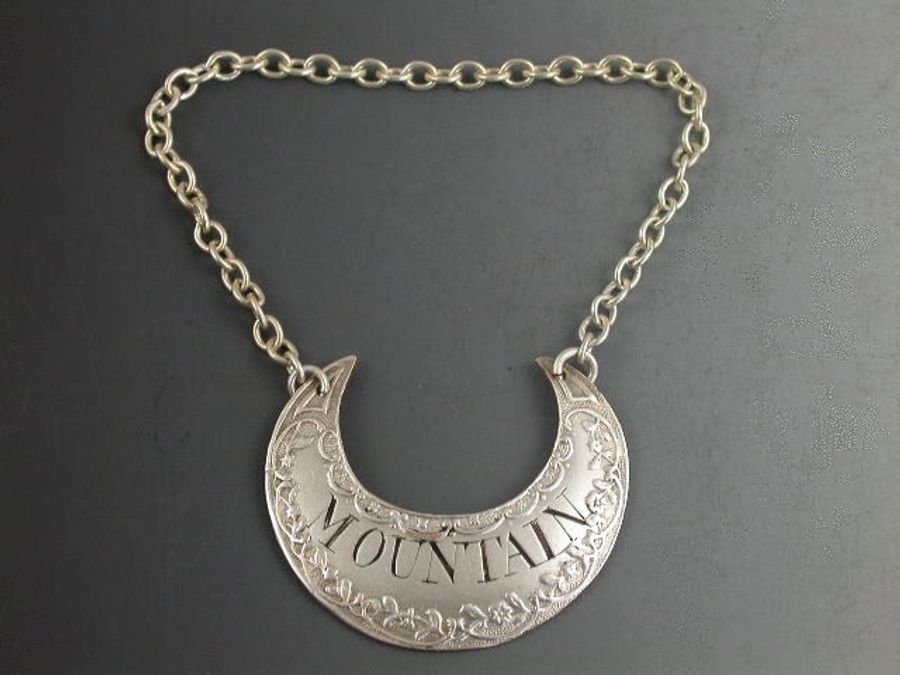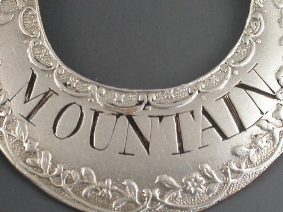 A rare 18th century Old Sheffield Plate Wine Label of crescent form with stamped entwined flowers to the border on a matt background, incised and niello filled for MOUNTAIN.